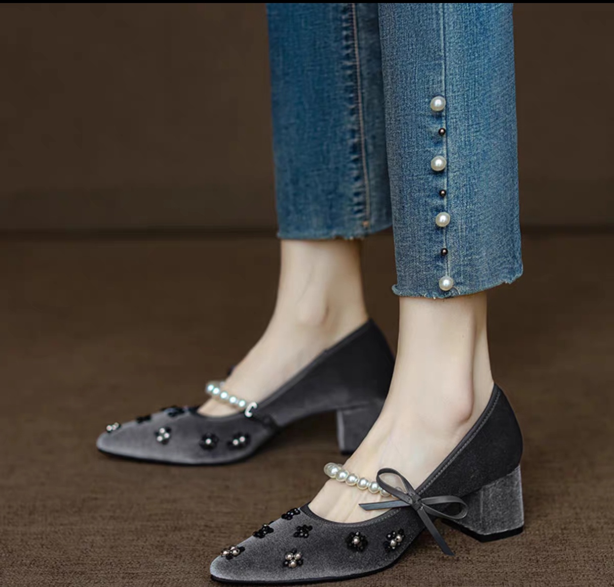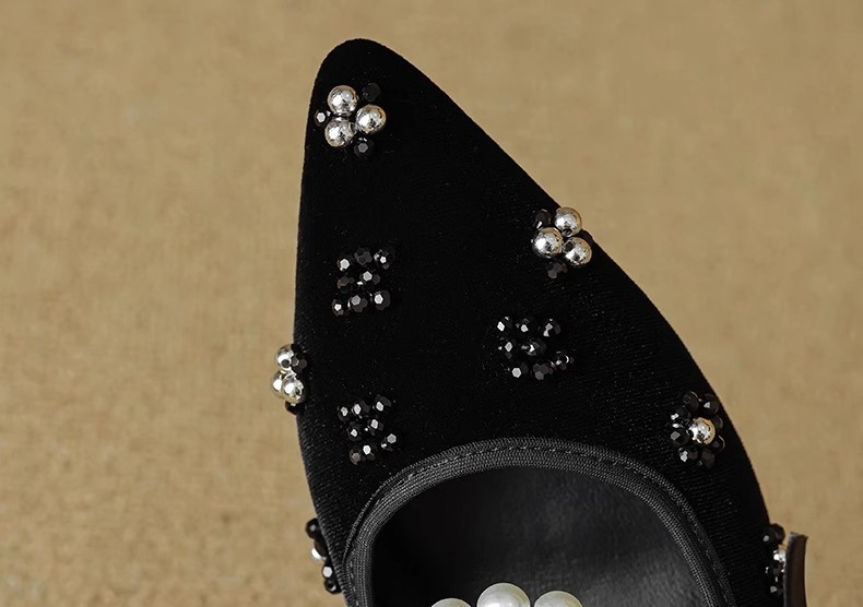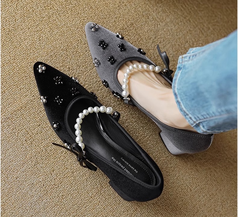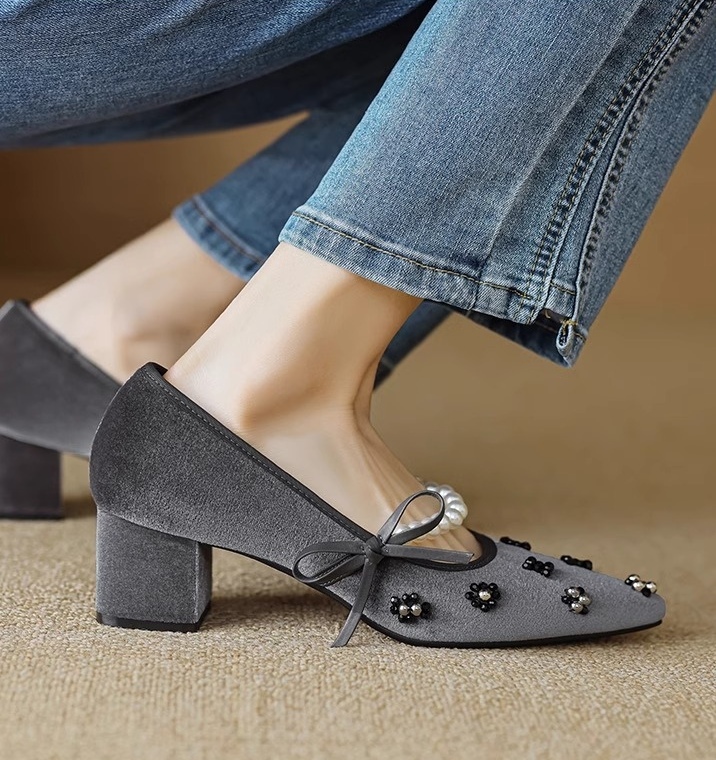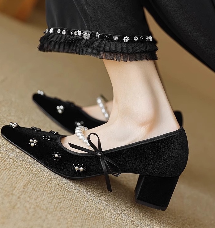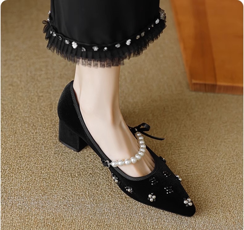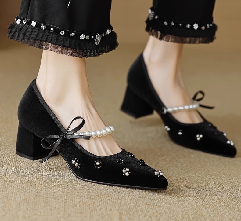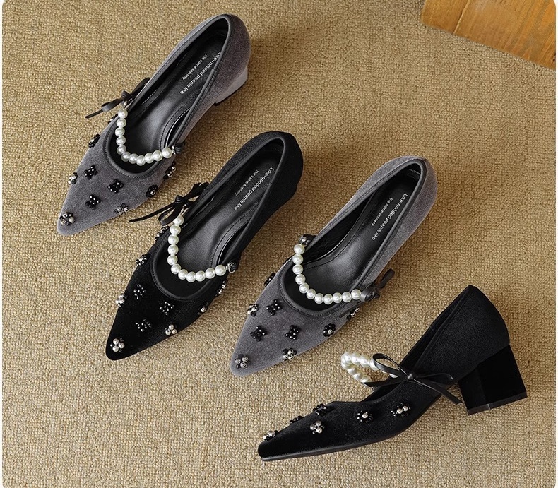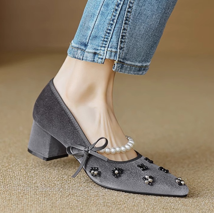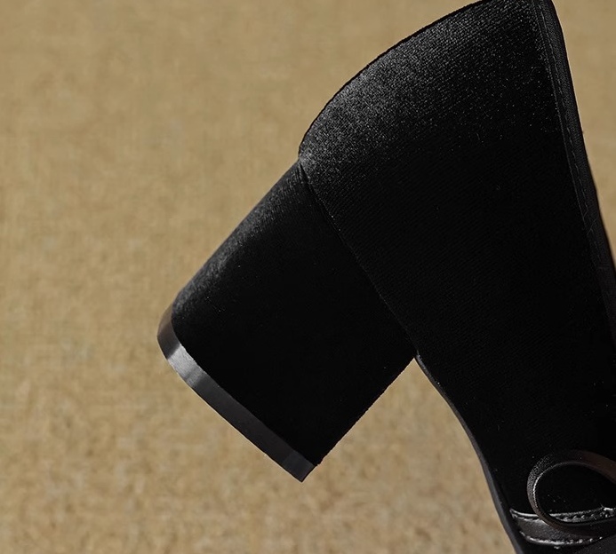 真丝金丝绒鞋面,透气轻柔,上脚轻便,方跟更稳。