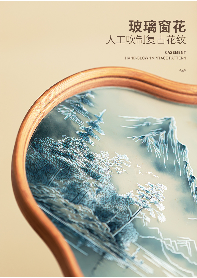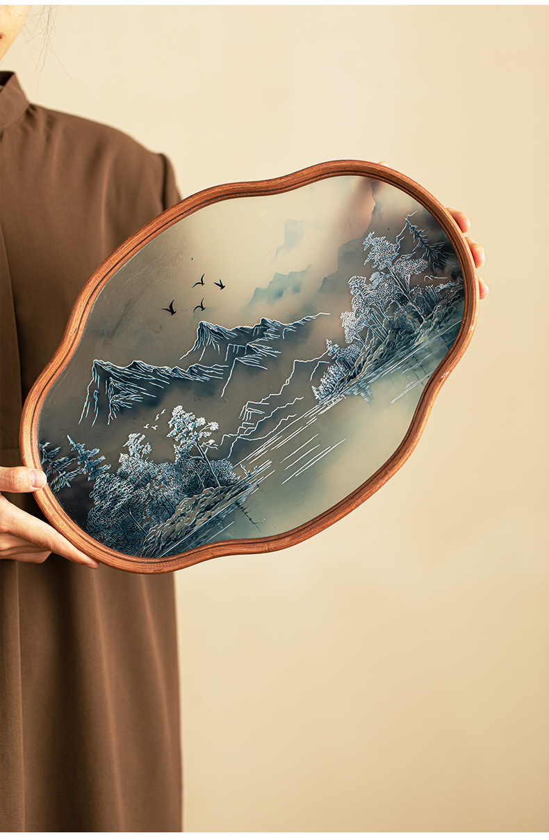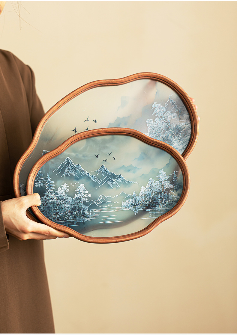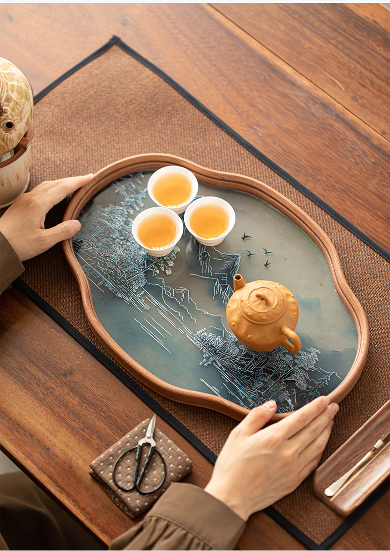 【复古新中式山水竹制玻璃茶盘】竹制海棠玻璃茶盘家用喝茶,多功能茶盘茶具托盘甜品摆盘水果盘,轻奢放茶杯水杯托高端摆盘QQ