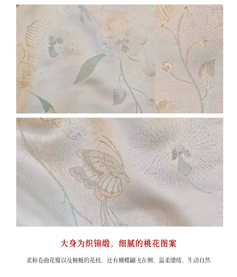 于桃枝间错落铺陈极细金线,在光线下熠熠鎏光,走动时金丝随角度变换浓淡,超级漂亮~~