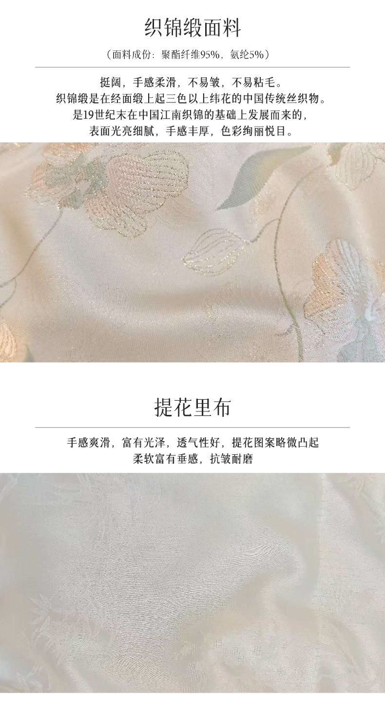 织锦缎,诞生于19世纪末的江南,以经面缎为底,三色以上纬花交织而成。使得面料挺括柔滑,表面光亮细腻,色彩绚丽却毫不艳俗。质地紧密,不易起皱,不易粘毛,属于好看又好打理的懒人面料~~