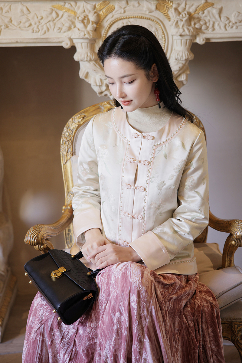 领口、门襟至底摆,以一抹「淡蕊粉」素色缎勾勒出清晰的轮廓。