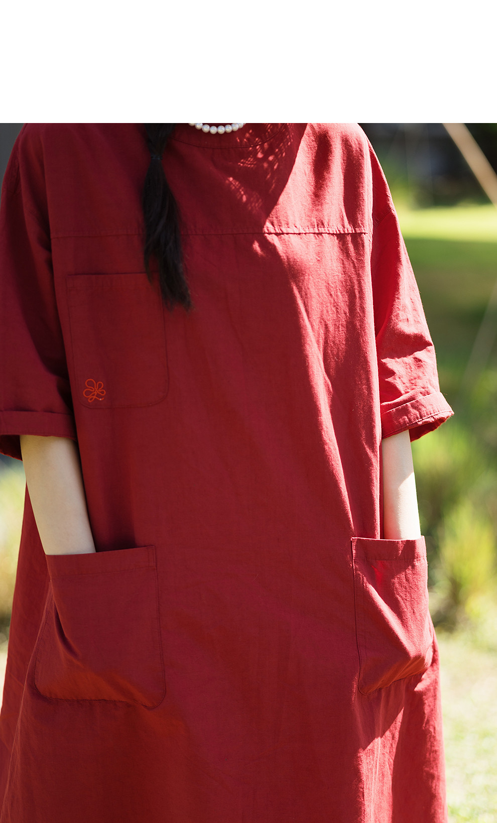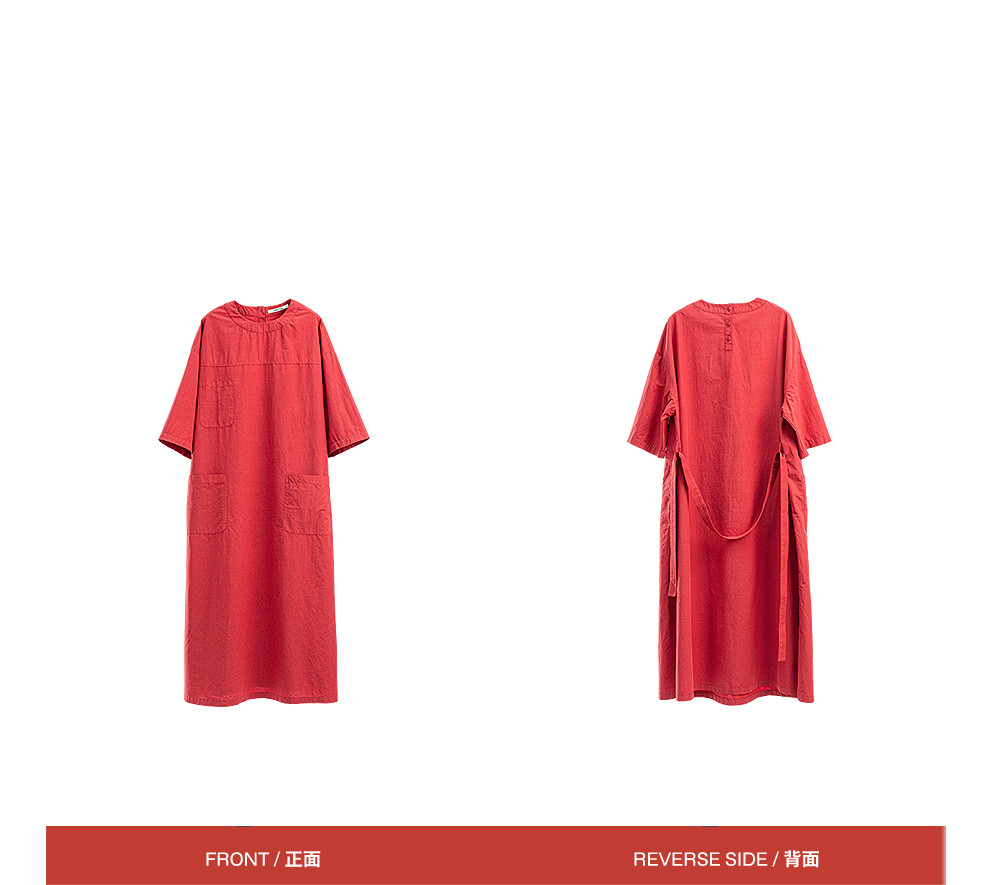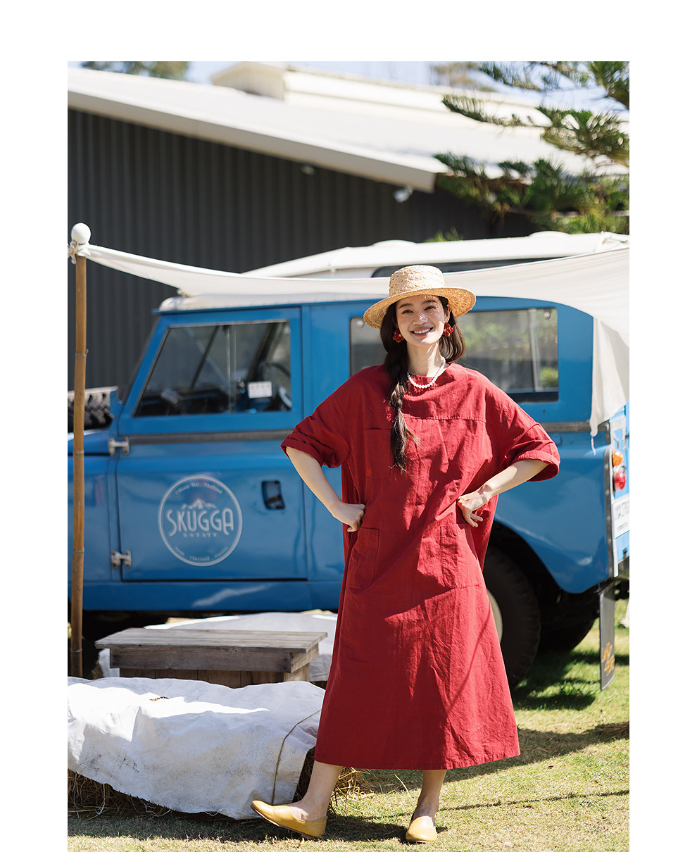 绽放093朵/汉麻棉工装廓感圆领七分袖连衣裙宽松直筒显瘦中袖长裙