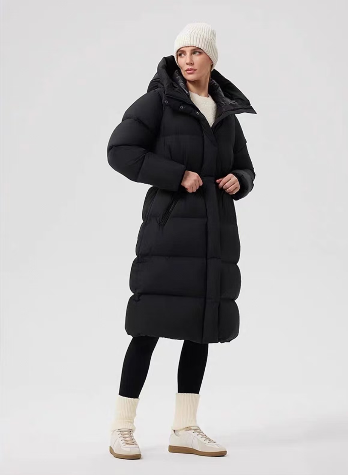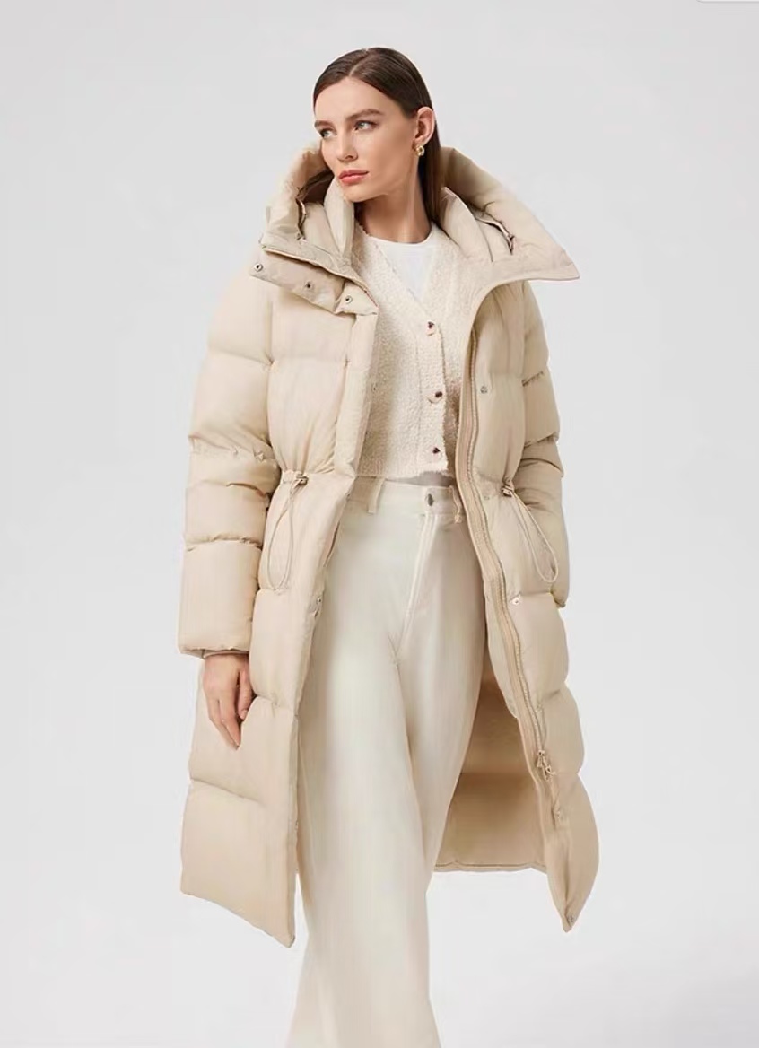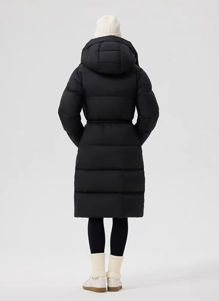 立领设计配以宽大的兜帽,应对极寒天气,腰部口袋配有拉链,长款设计,长度在小腿肚附近,不压个子显高挑,简约大方。