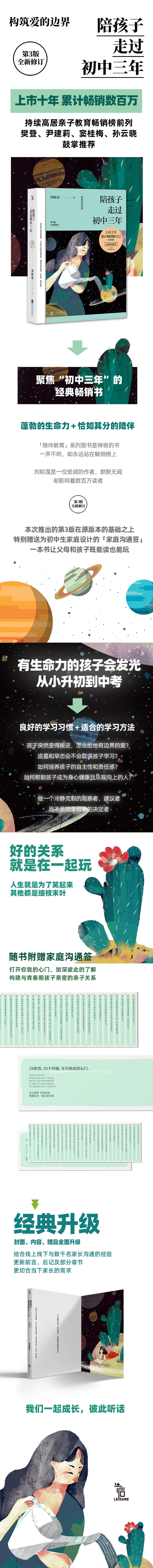 ???;陪伴教育系列是一套奇怪的书,一声不响,却永远站在畅销榜上;刘称莲是一位奇怪的作者,默默无闻,却影响着百万读者。 ???1.这是什么? ???聚焦;初中三年这个特定时间段的经典畅销书。孩子突然变得叛逆,怎么给他有边界的爱?追星和早恋会不会耽误孩子学习?如何培养孩子的自主性和责任感?她的教育方式,对每一个普通中国家庭来说,都具有借鉴和参考性。作者在原版本的基础上,结合自己这些年在线上线下与数千名家长沟通的经验,更新部分章节,增加后记,更切合当下家长的痛点。 ???2.书中流淌着作者的经验和智慧,帮助家长成为孩子青春期的稳定容器。 ???所谓陪伴,是既陪伴孩子享受成功,更陪伴孩子面对失败。让孩子在跌倒时,跌得有尊严;让孩子在坠入低谷时,依然有勇气提灯前行。陪伴是相信孩子,看见孩子,在孩子做不到的时候接纳孩子。让孩子自然地进步成长,就像风吹过树叶,晚霞映在脸上,宁静而又欢喜。 ???3.大人能看,孩子能用。 ???随书附赠;家庭沟通签,对青春期的孩子来说,爱就是在一起无话不谈。用28个问题打开彼此的心门,通过亲子间的互相问答,加深彼此的了解,构建与青春期孩子亲密的亲子关系。 ???这不仅仅只是一本亲子教育书,更是一位女性从紧缩到绽放的生命历程。在这本书畅销的十年间,作者从一个学霸妈妈、全职太太的角色蜕变为知名的教育与心理研究者,足迹遍布全国各地,带领了数百场线下工作坊,使成千上万的家庭获得了智慧与滋养。这个蜕变的过程,不仅仅只是源于一本书,更是因为作者刻苦、努力、扎实的生命品质。如果能够与作者交谈,你会知道她内在品质的光芒远胜过所谓畅销书作家、教育专家、心理学者这些外在的头衔。