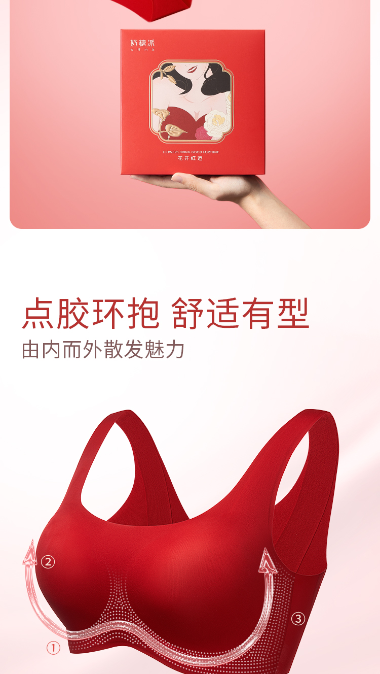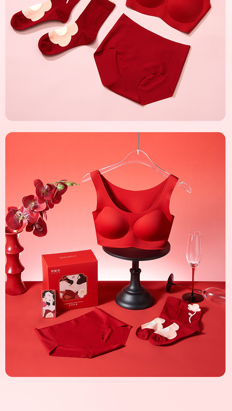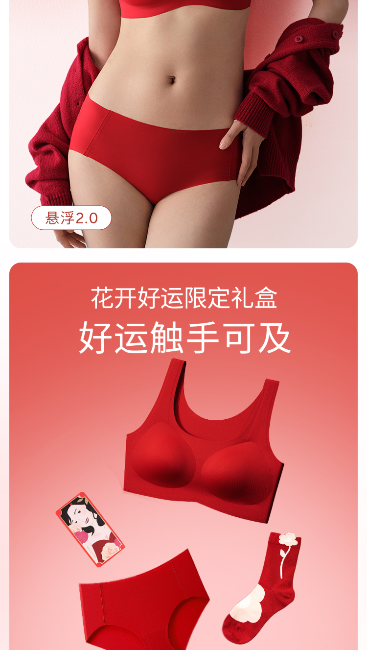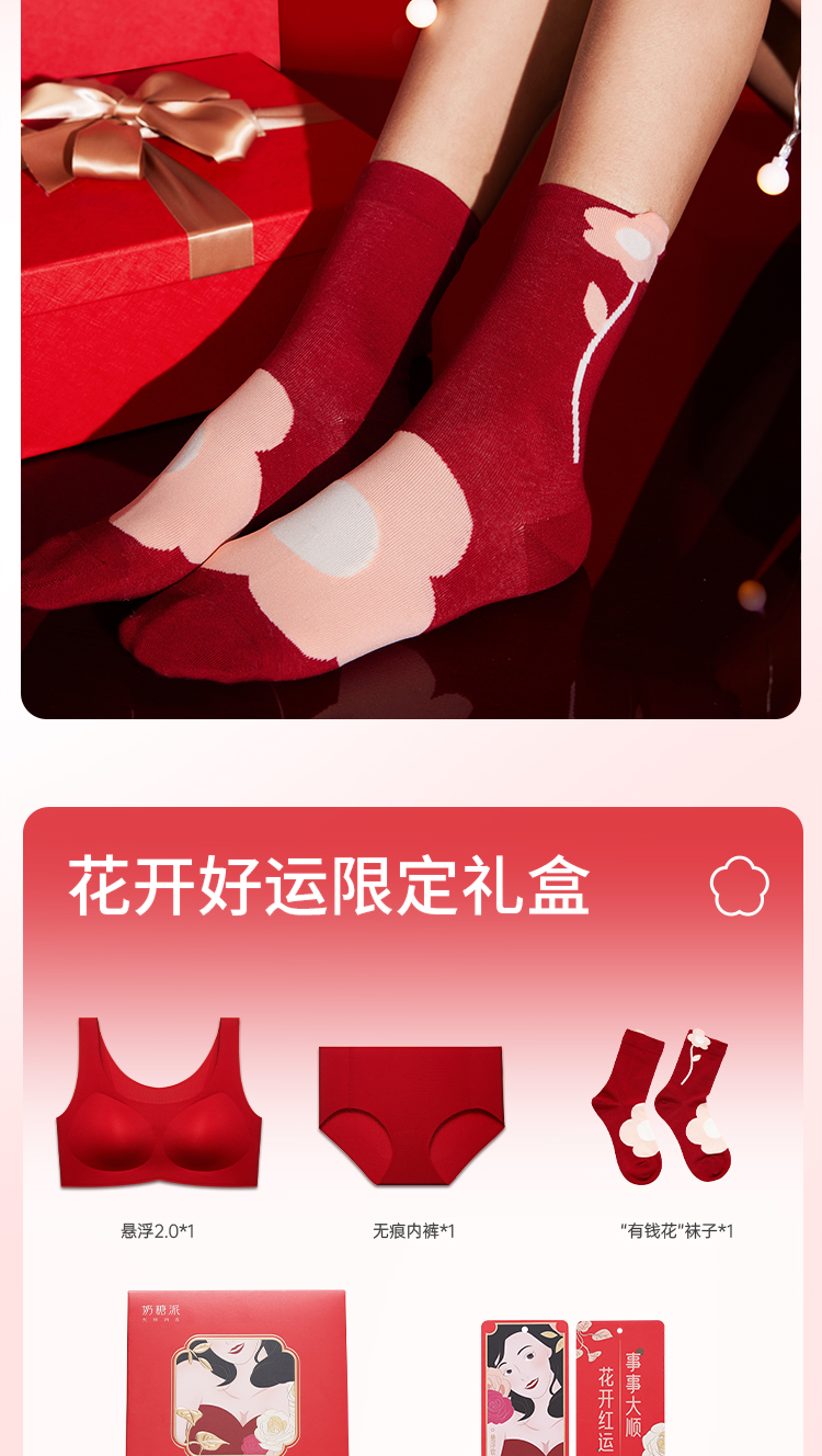 【1套=文胸+内裤+袜子】奶糖派花开好运悬浮2.0文胸套装新年红品本命年婚庆礼物 丝绒红礼盒装