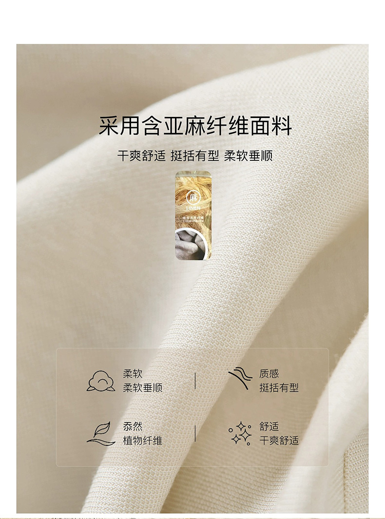 材质:1.2%亚麻 5.2%锦纶 50.3%粘纤 43.3%聚酯纤维