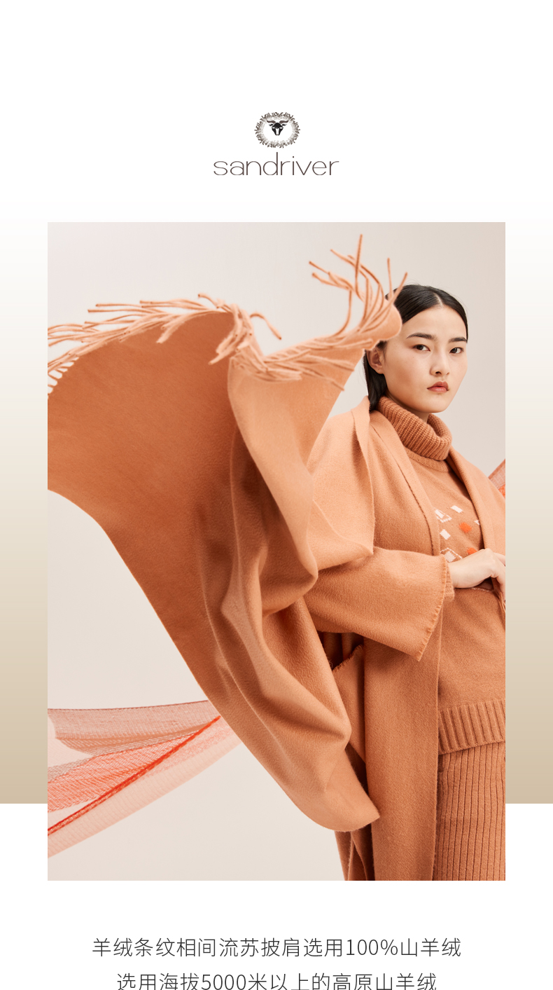 历年在巴黎时装周亮相,享誉世界的艺术羊绒品牌[Sandriver 沙涓]由羊绒布道者郭秀玲女士创立。阿拉善自有牧场纯种羔羊绒,日本国宝设计师小筱顺子,上海自有基地精工细作。承载羊绒情怀,坚持匠人品质。