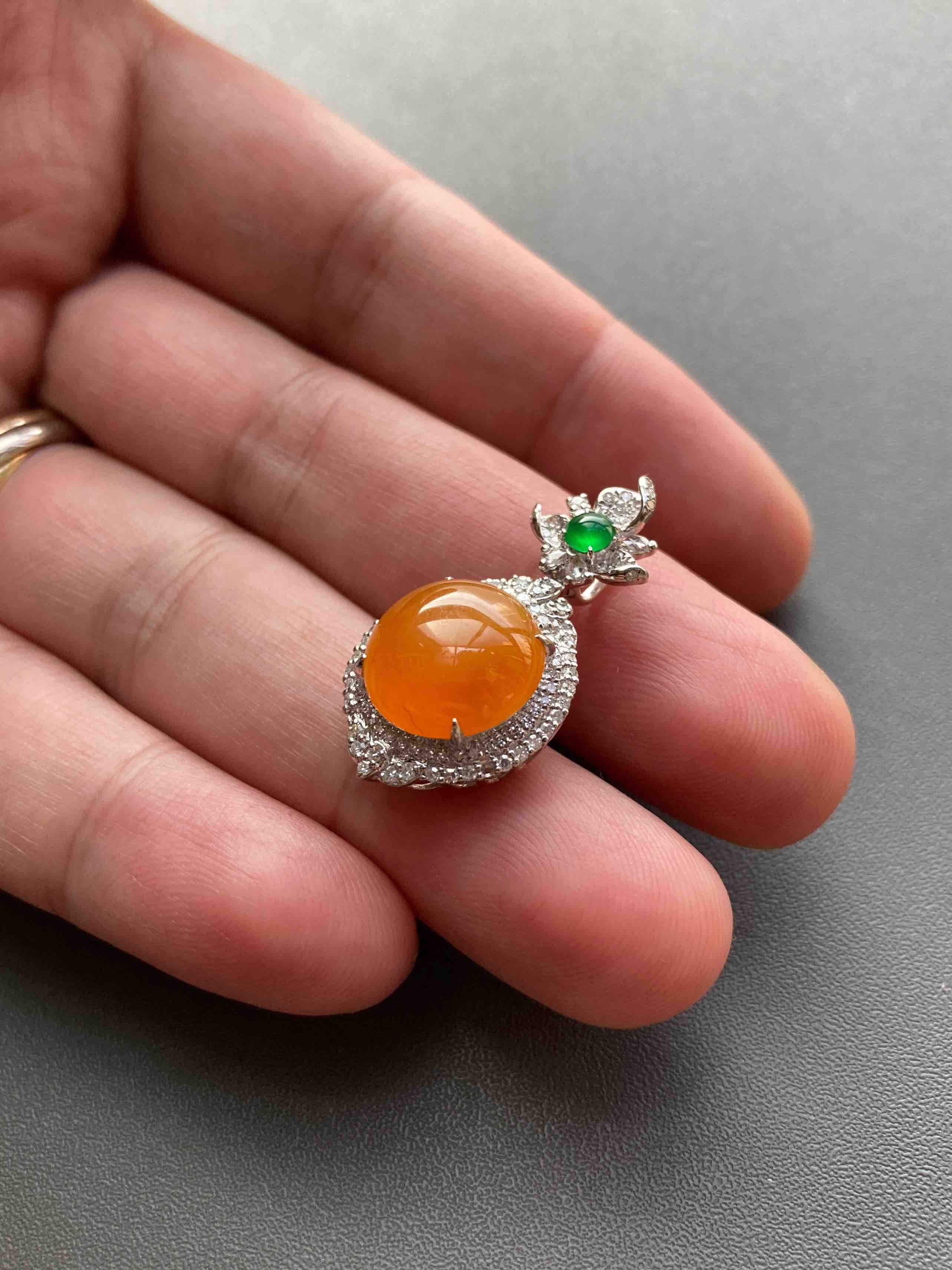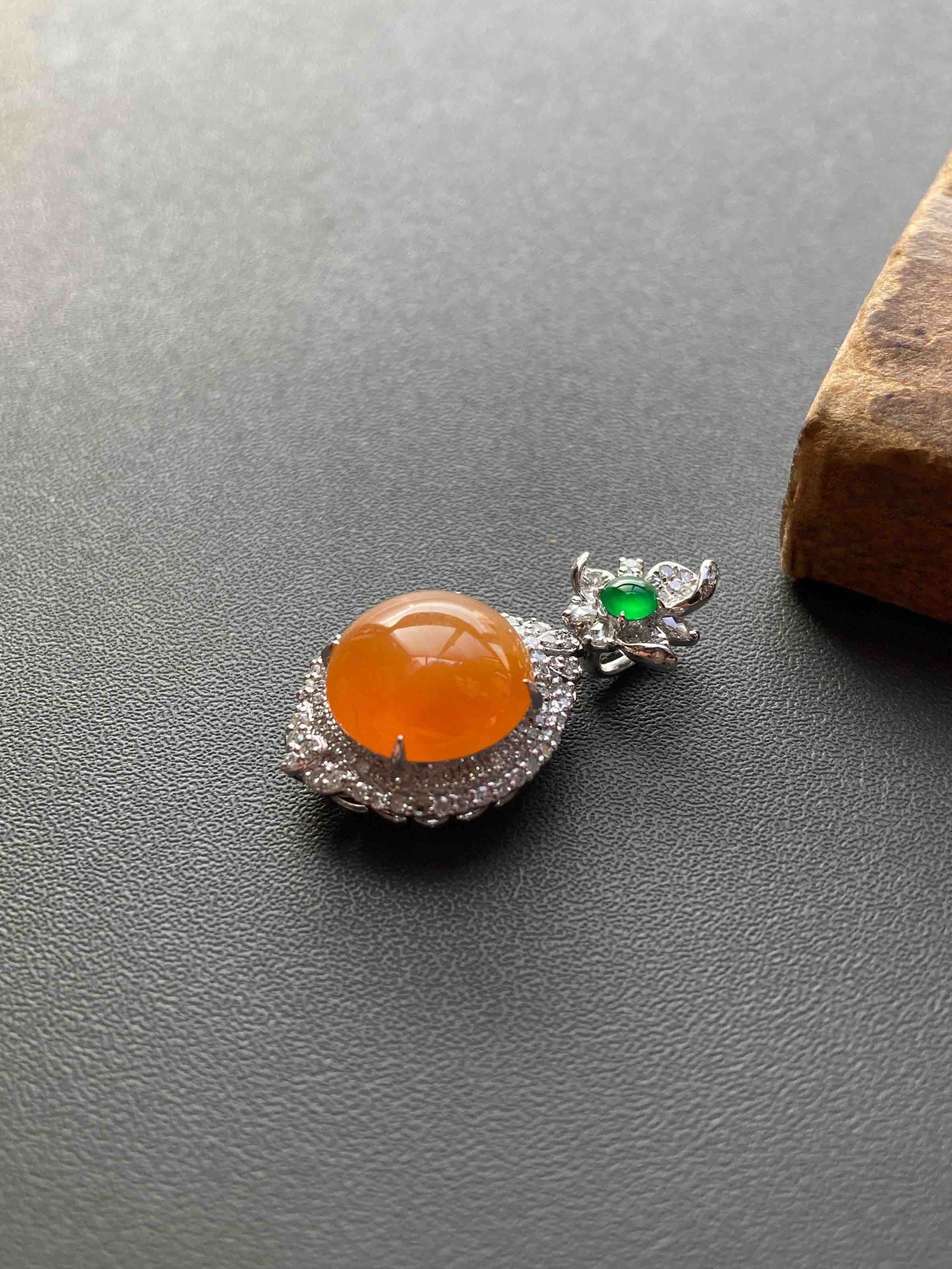 黄翡毕业,冰种厚庄鸽子蛋,缅甸料,稀有芬达色,款式华丽贵气的大蛋面吊坠,颜色太艳丽了,种水晶莹剔透,正圆饱满大蛋面,18k白金钻石豪华镶嵌,玻璃种阳绿翡翠蛋面扣头,高货后开盖款式,样样好,蛋面11.9×11.9×4.4mm,镶嵌后29.2×15.7×9.9mm