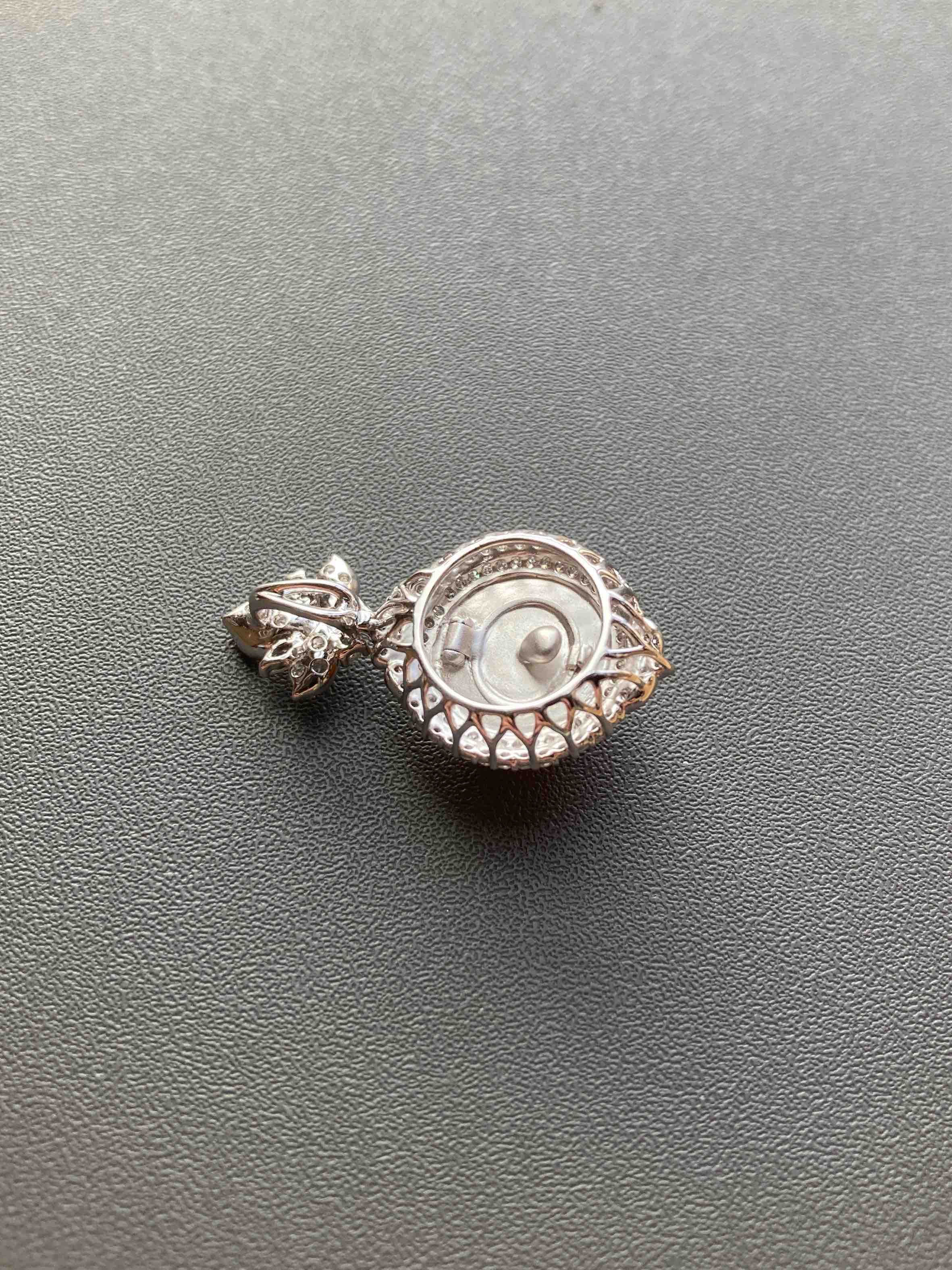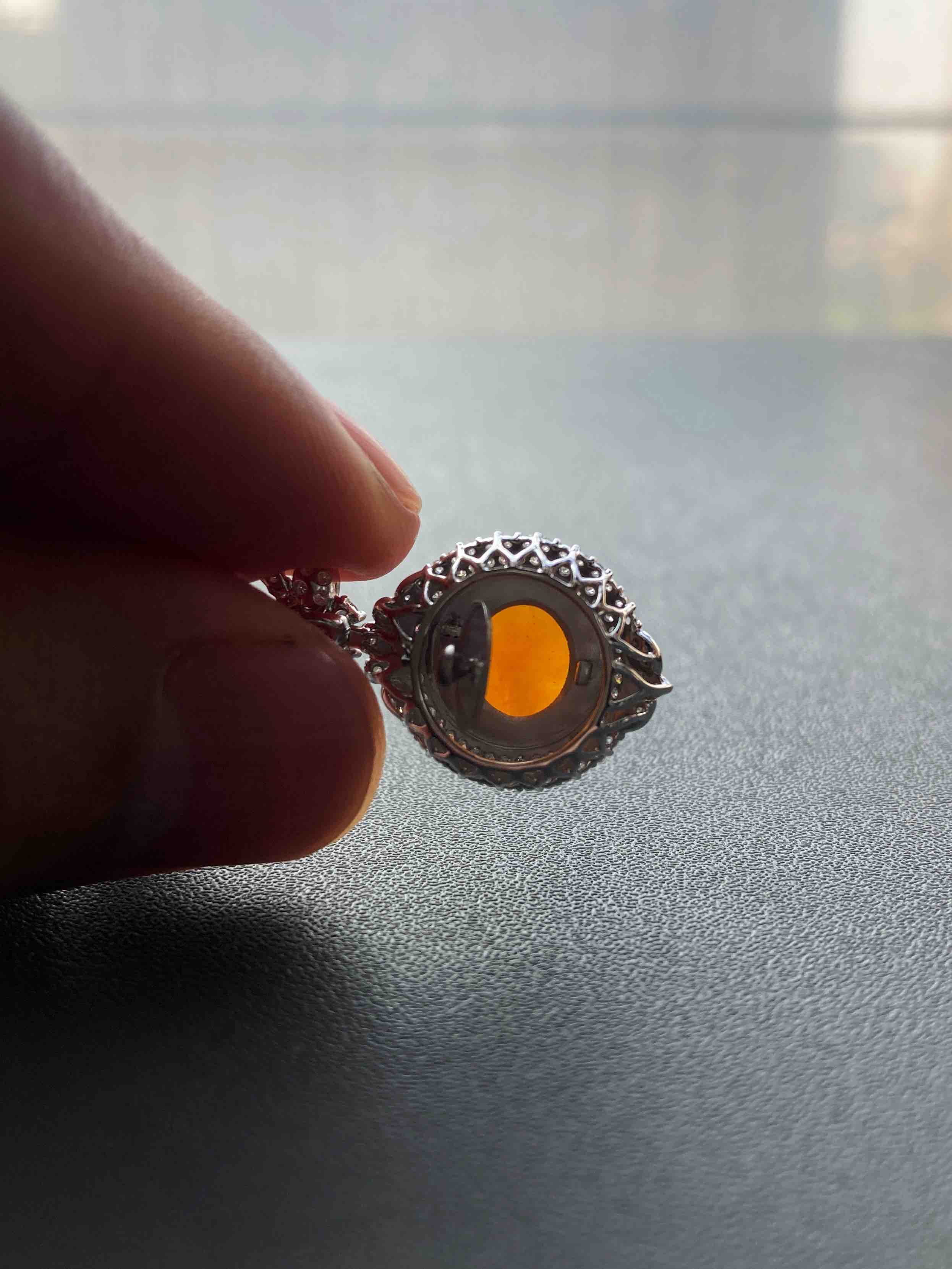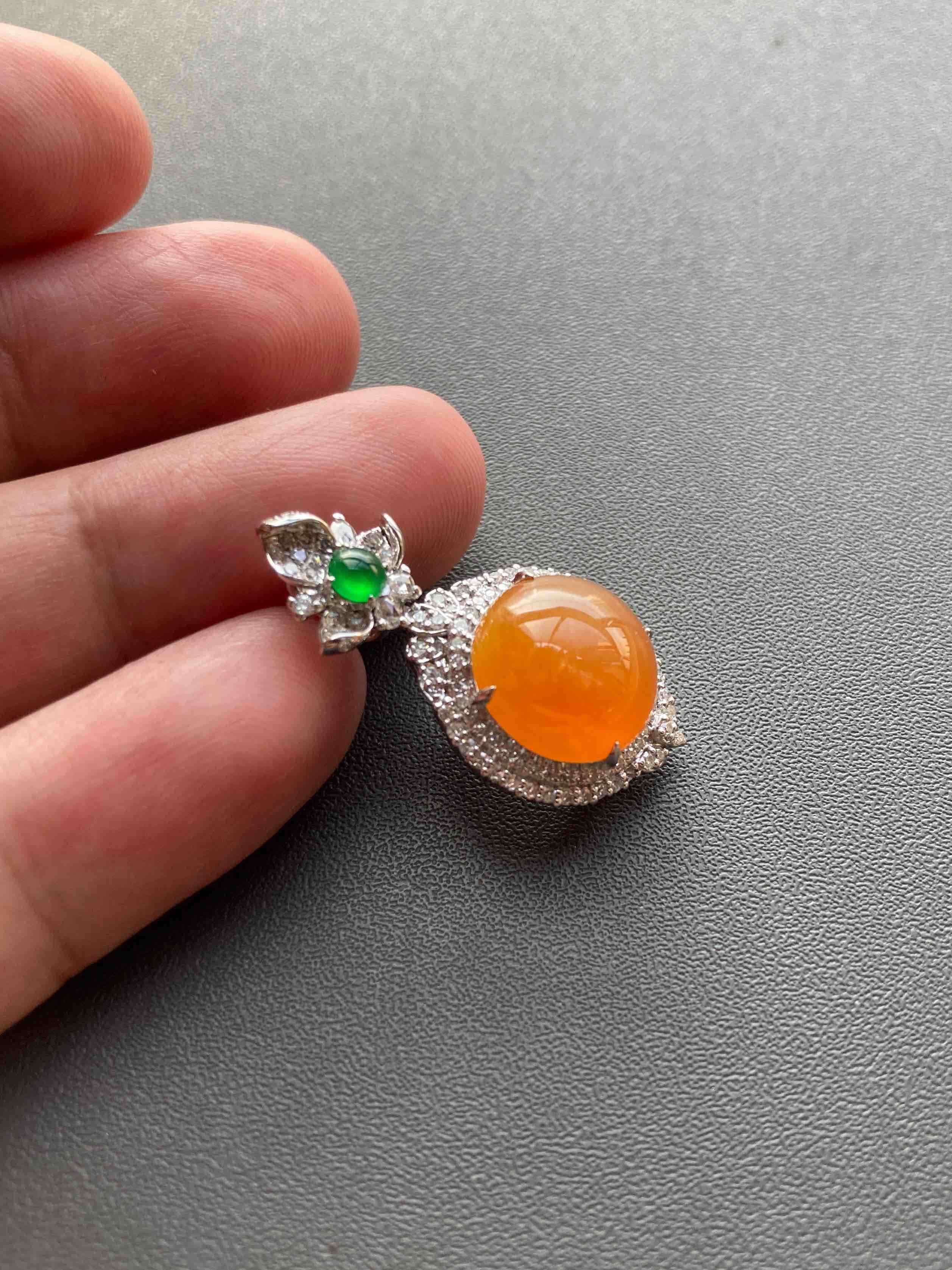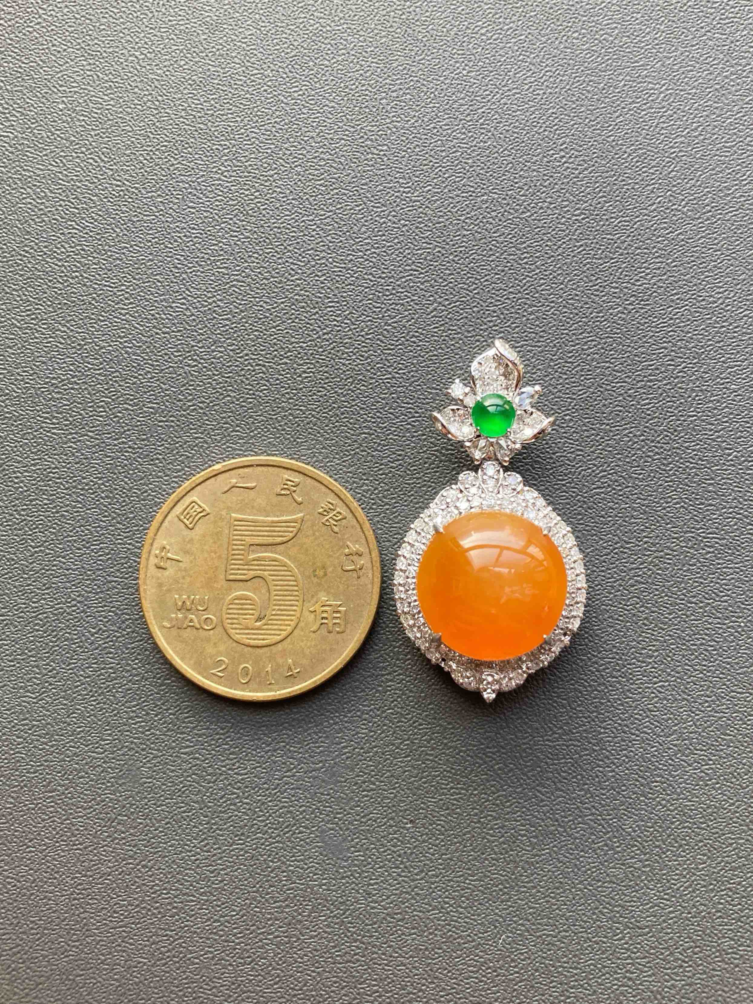 高冰种黄翡大蛋面吊坠18k白金钻石镶嵌