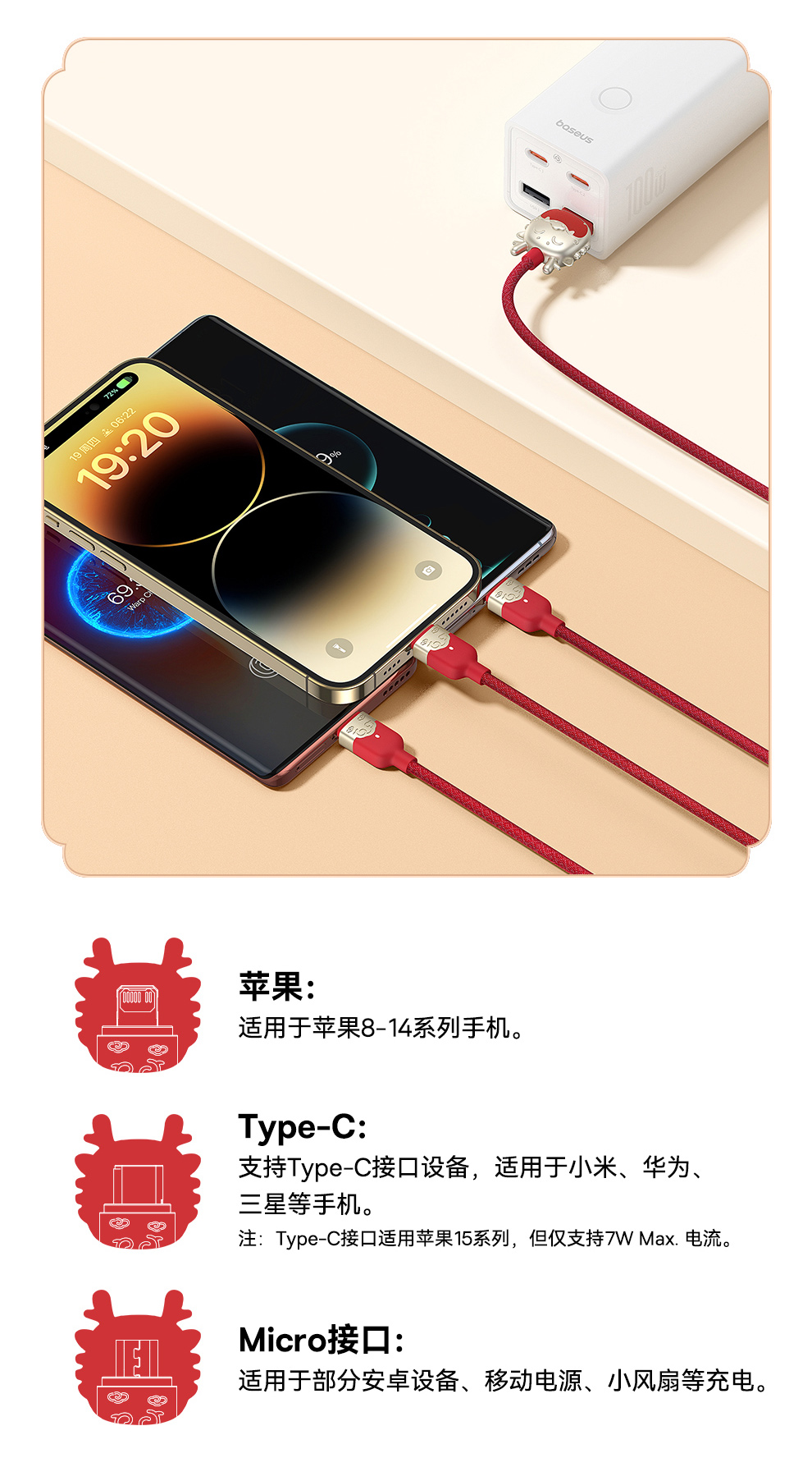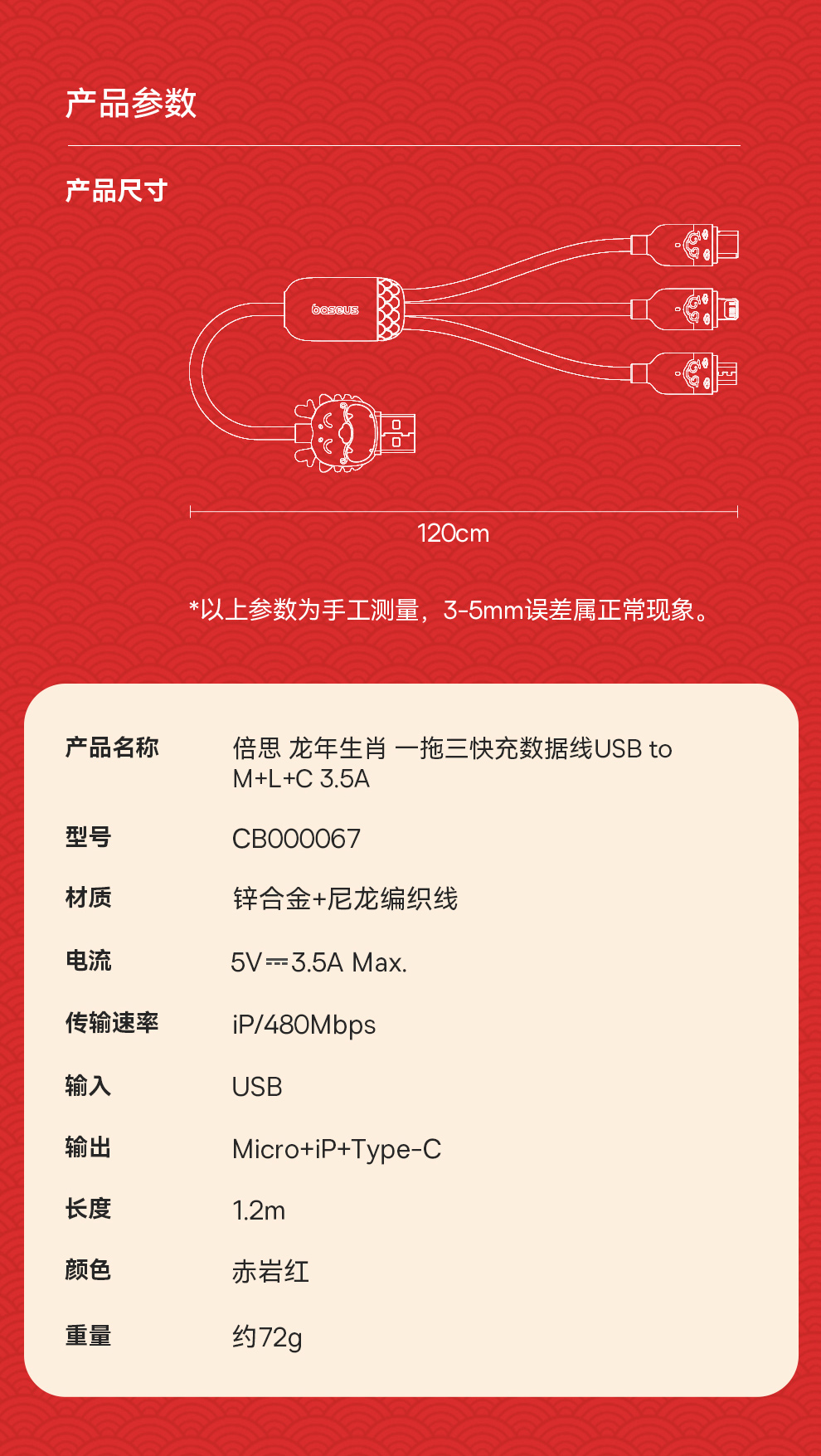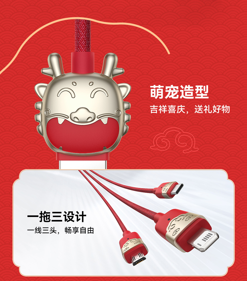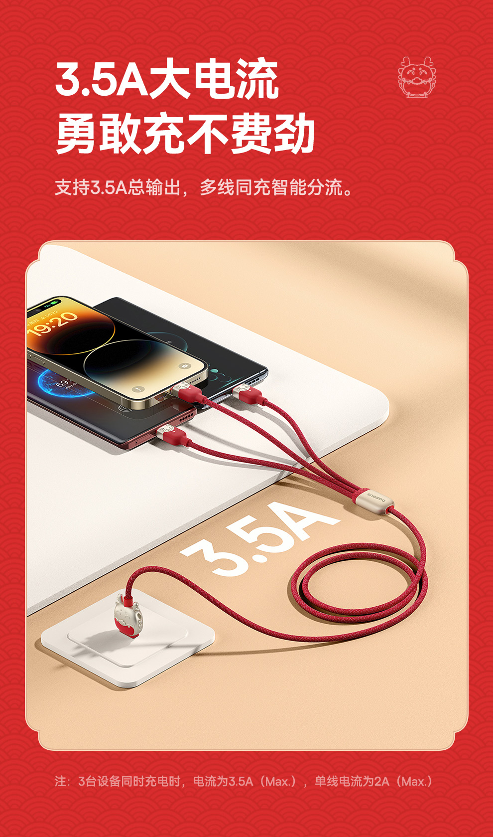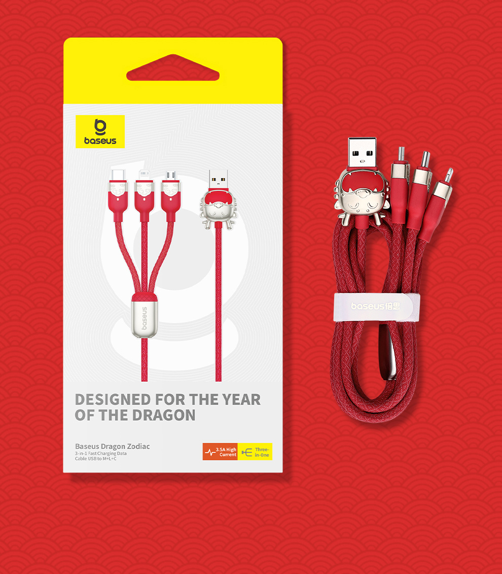 【69元3件】倍思 龙年生肖系列 一拖三快充数据线 USB to M+L+C 3.5A