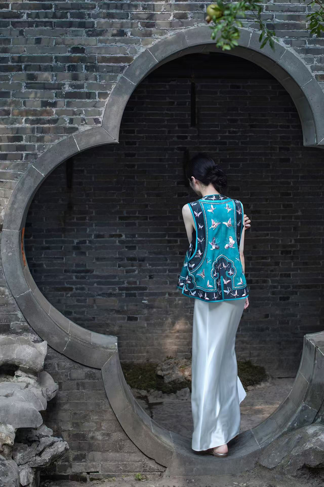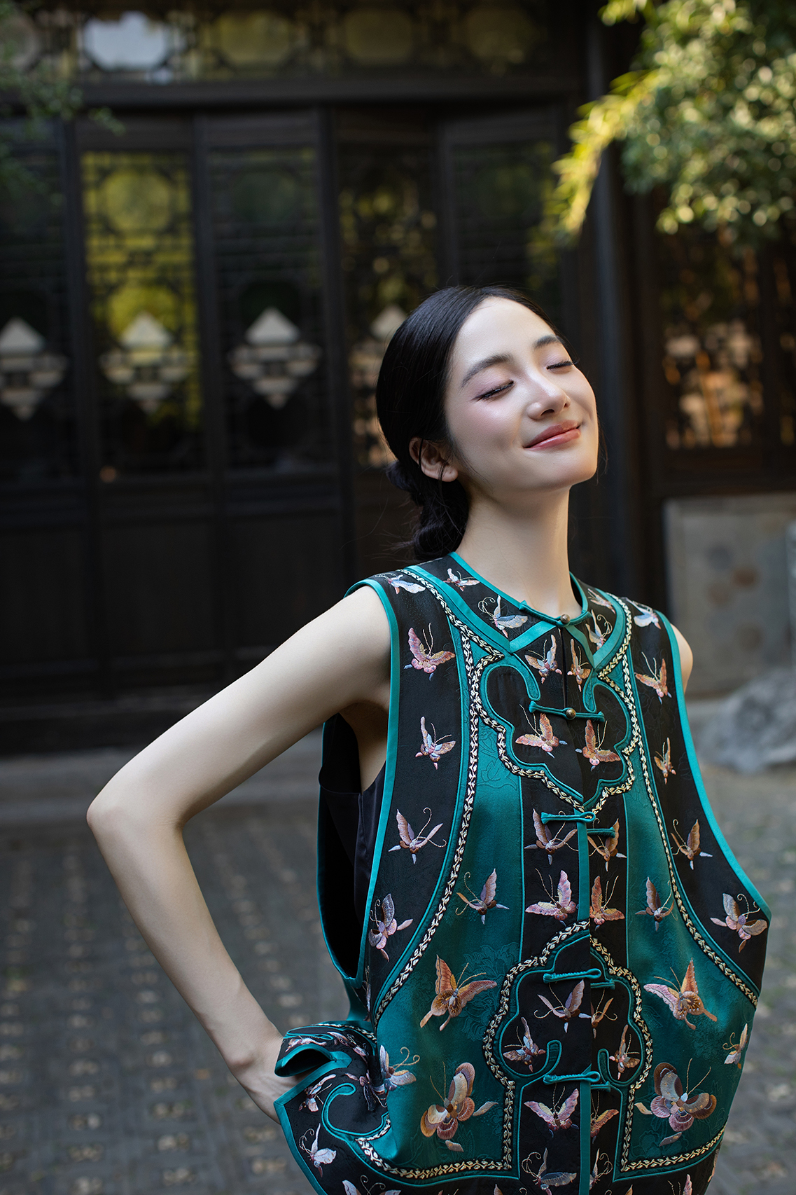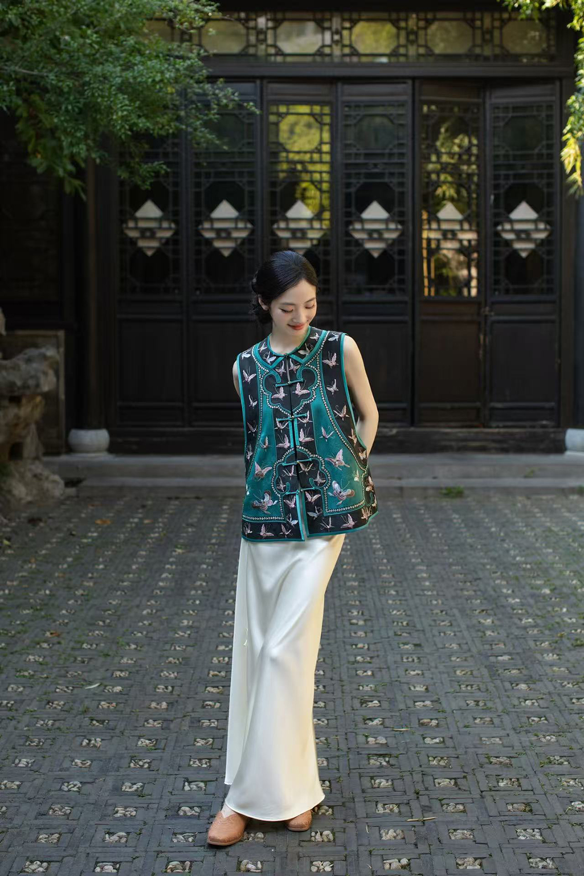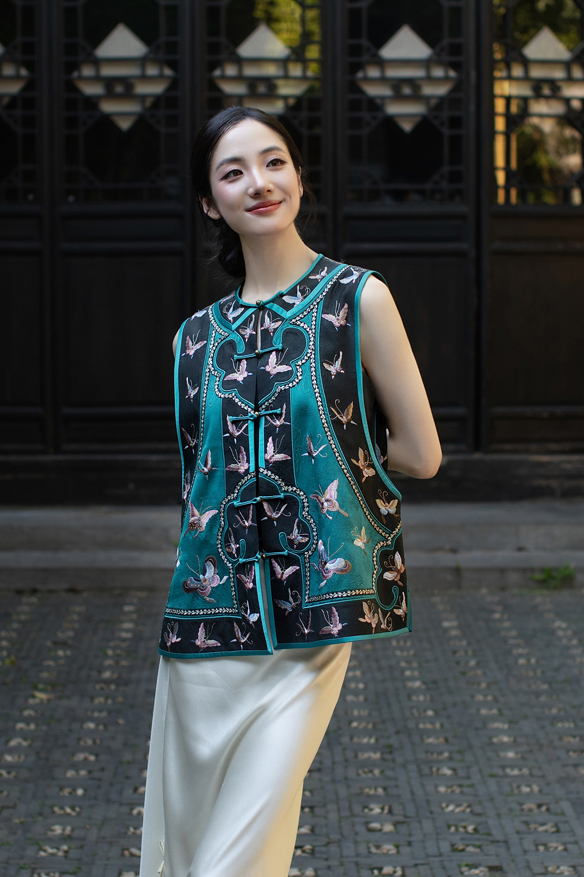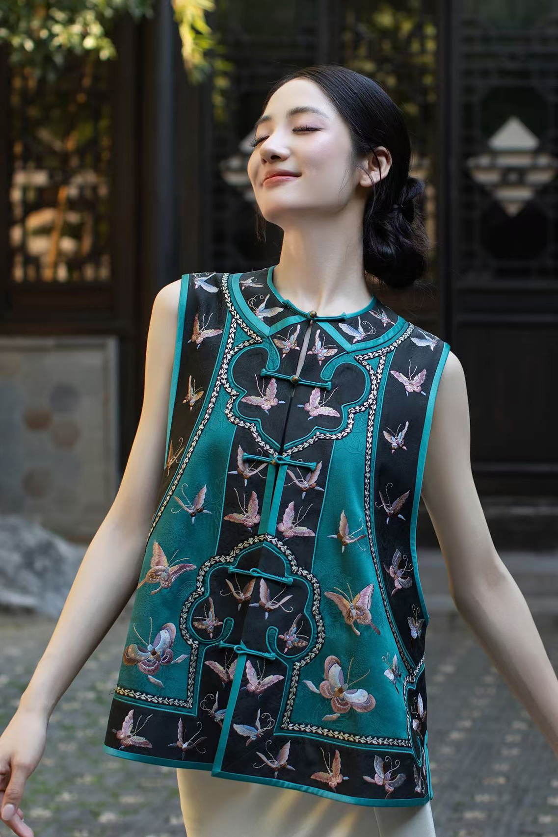 盛唐牡丹盛奢系列 | 手推绣如意蝴蝶马甲-孔雀绿