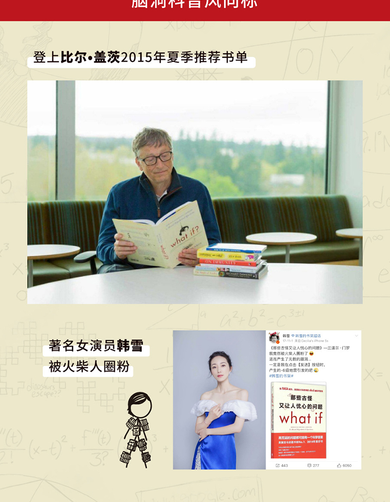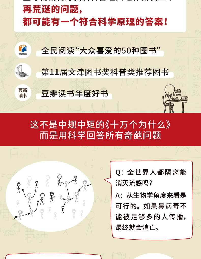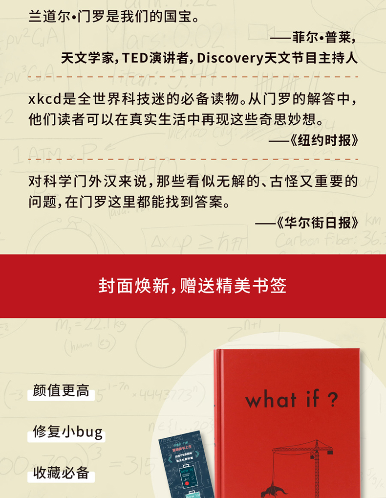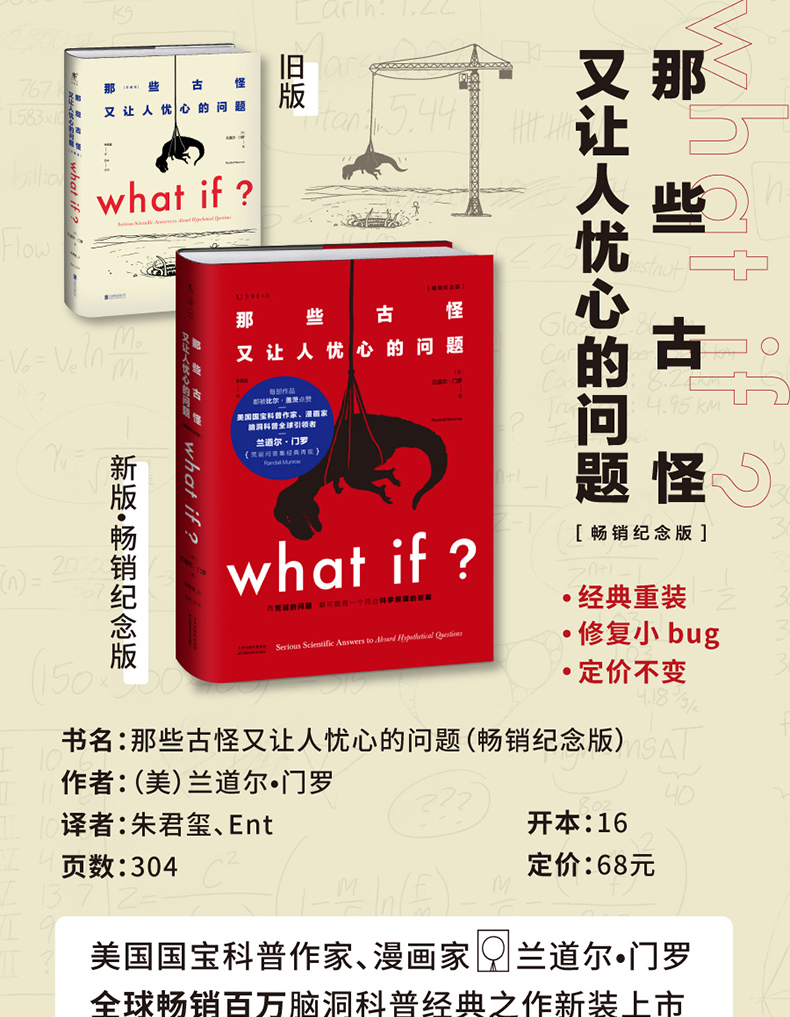 靠前百万册的《What If?那些古怪又让人忧心的问题》畅销纪念版上市!本书是前NASA员工、超热门科普漫画“xkcd”作家兰道尔·门罗的经典代表作,内容来自他的“What If”科学问答专栏,辅以“xkcd”经典火柴人漫画,各学科知识以轻松、幽默的形式跃然纸上。