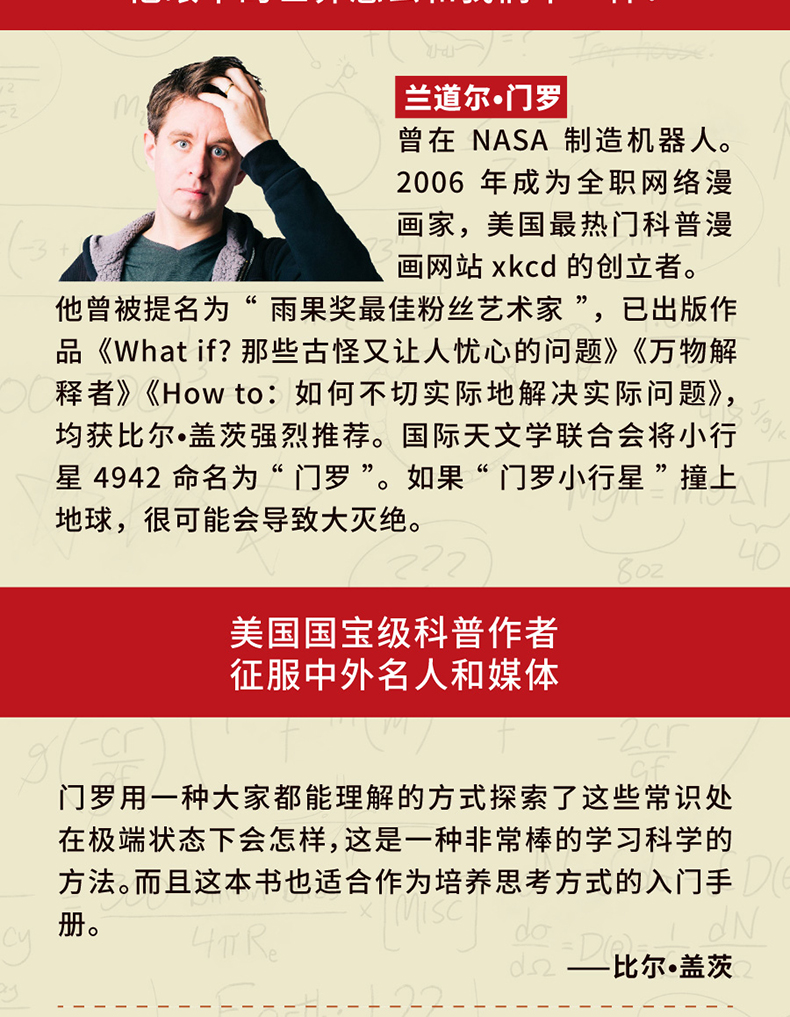 曾在NASA工作制造机器人。2006年成为全职网络漫画家,美国最热门科普漫画网站xkcd的创立者。玩转物理、天文、生物、化学、数学各学科知识,轻松接招粉丝们提出的脑洞大开的问题,幽默机智的回答配上xkcd风格的火柴人漫画,让人拍案叫绝!他曾被提名为“雨果奖很好粉丝艺术家”,已出版作品《What if? 那些古怪又让人忧心的问题》《万物解释者》《How to:如何不切实际地解决实际问题》,均获比尔•盖茨强烈推荐。国际天文学联合会将小行星4942命名为“门罗”。如果“门罗小行星”撞上地球,很可能会导致大灭绝。