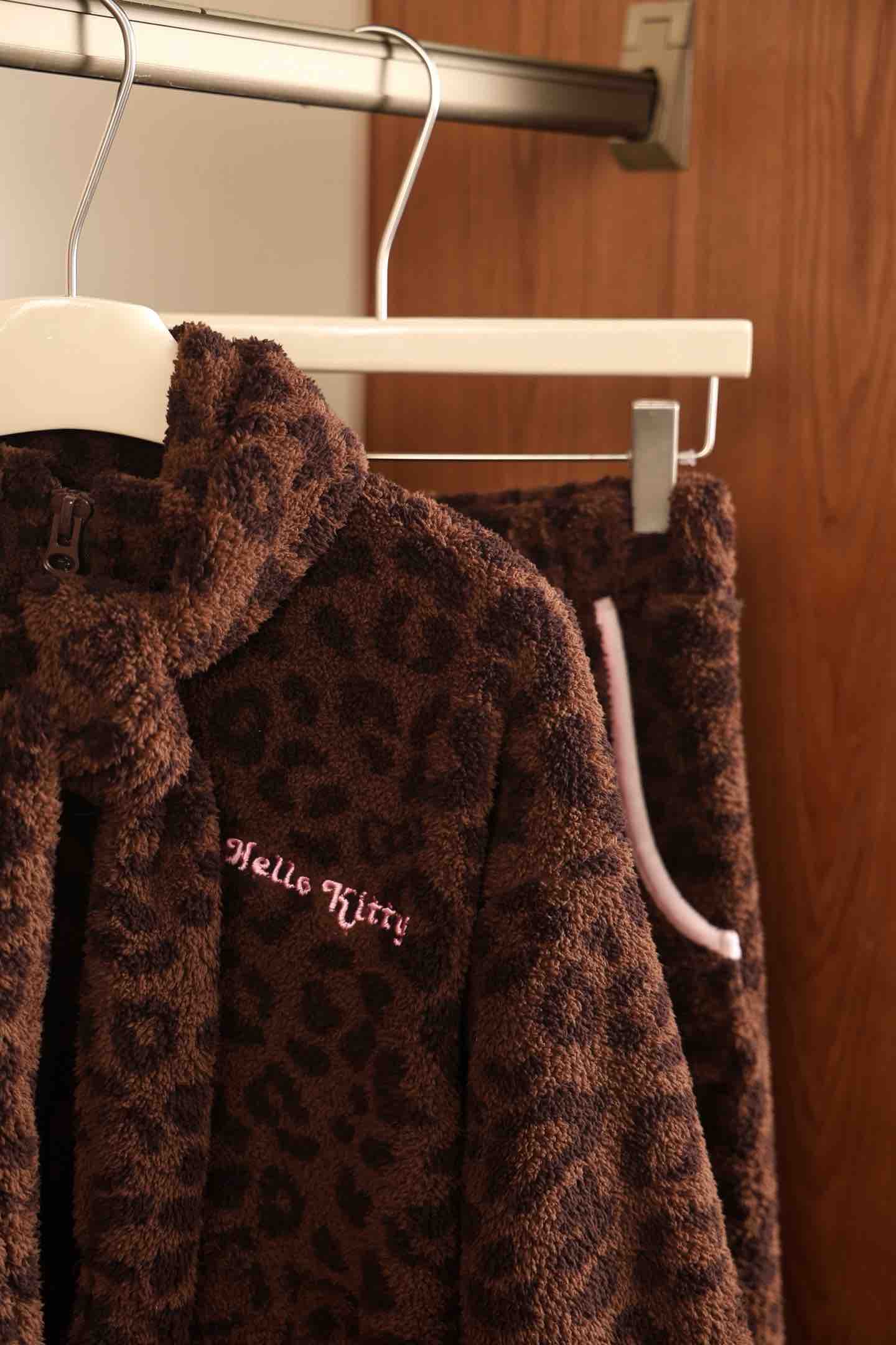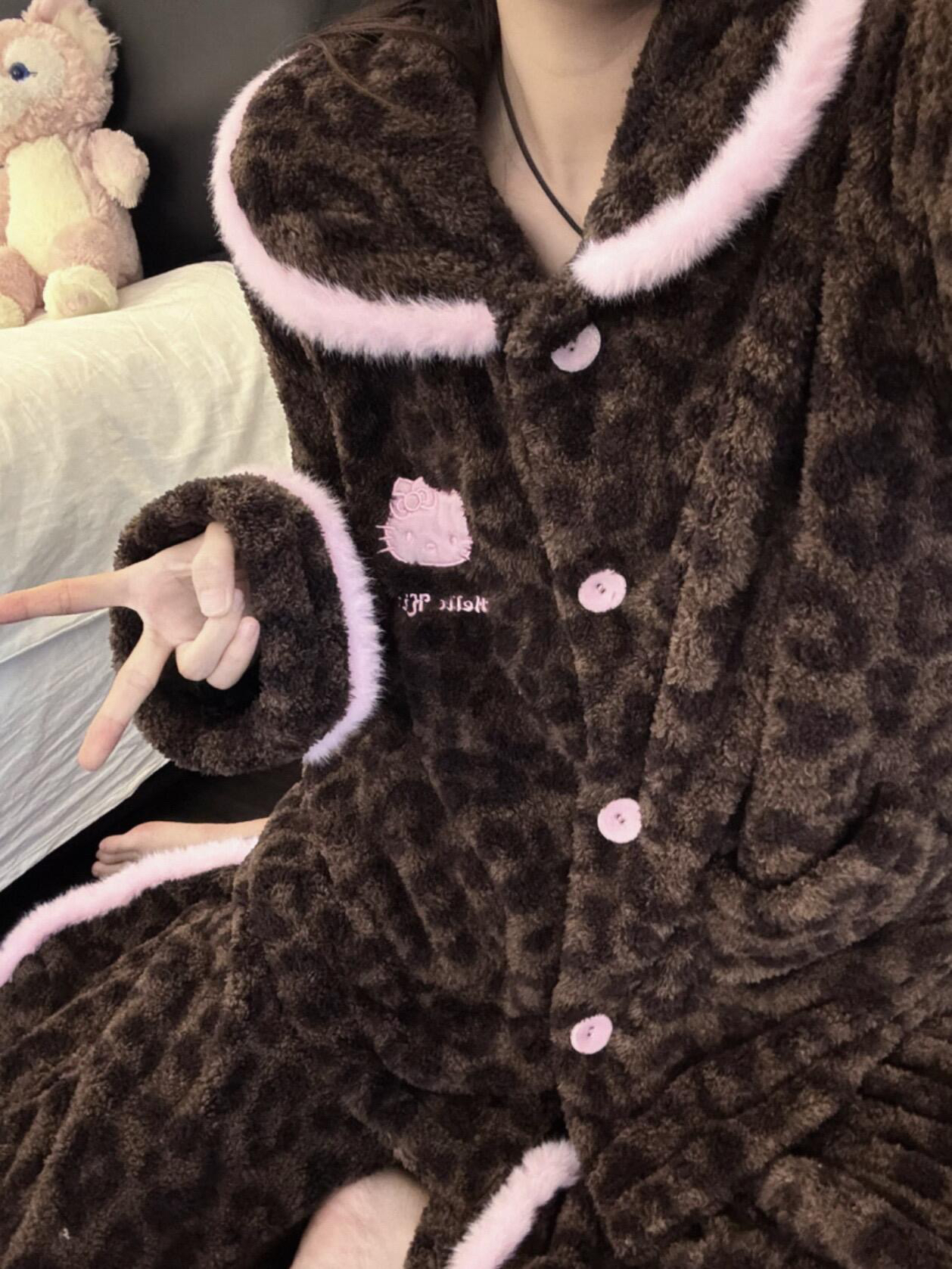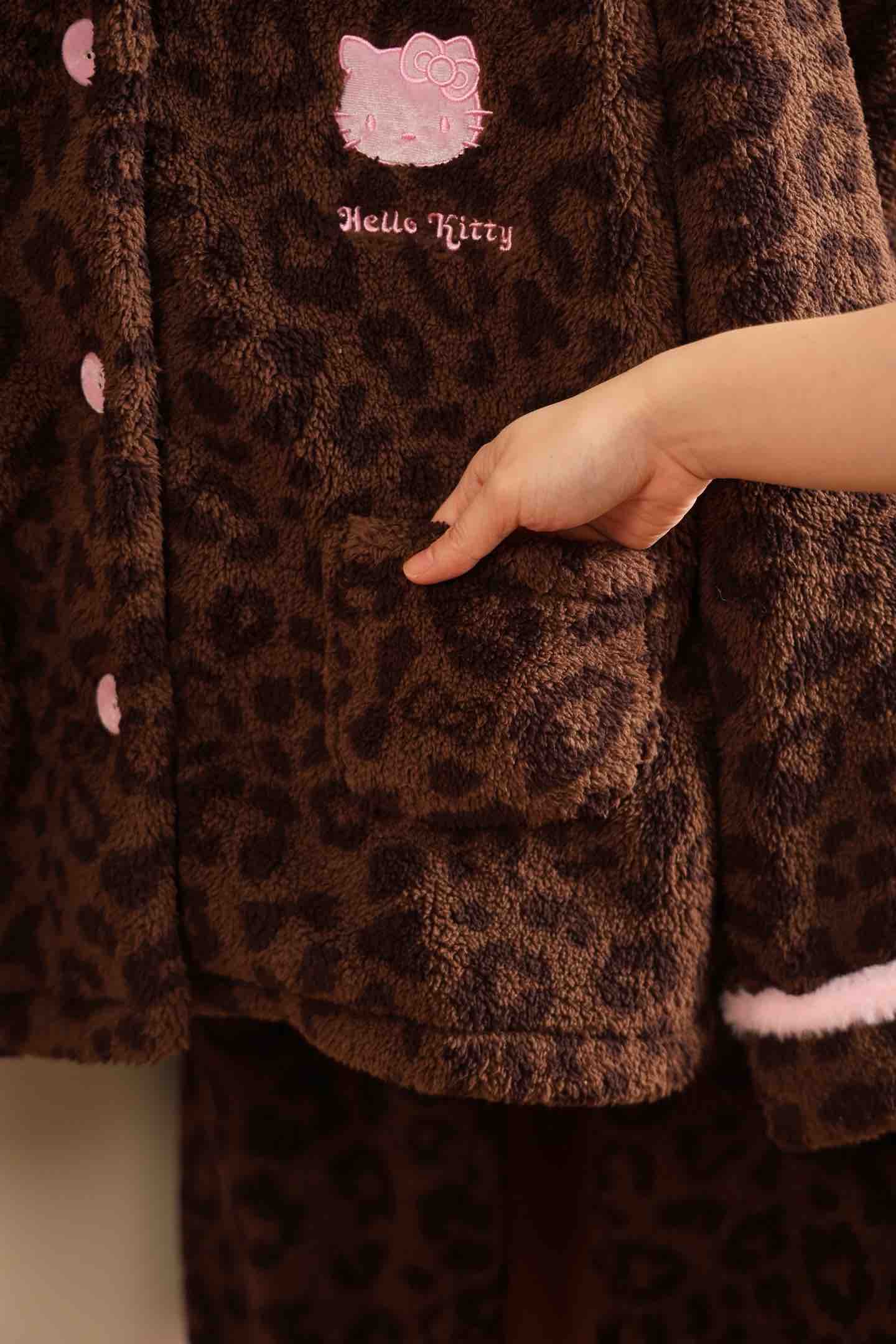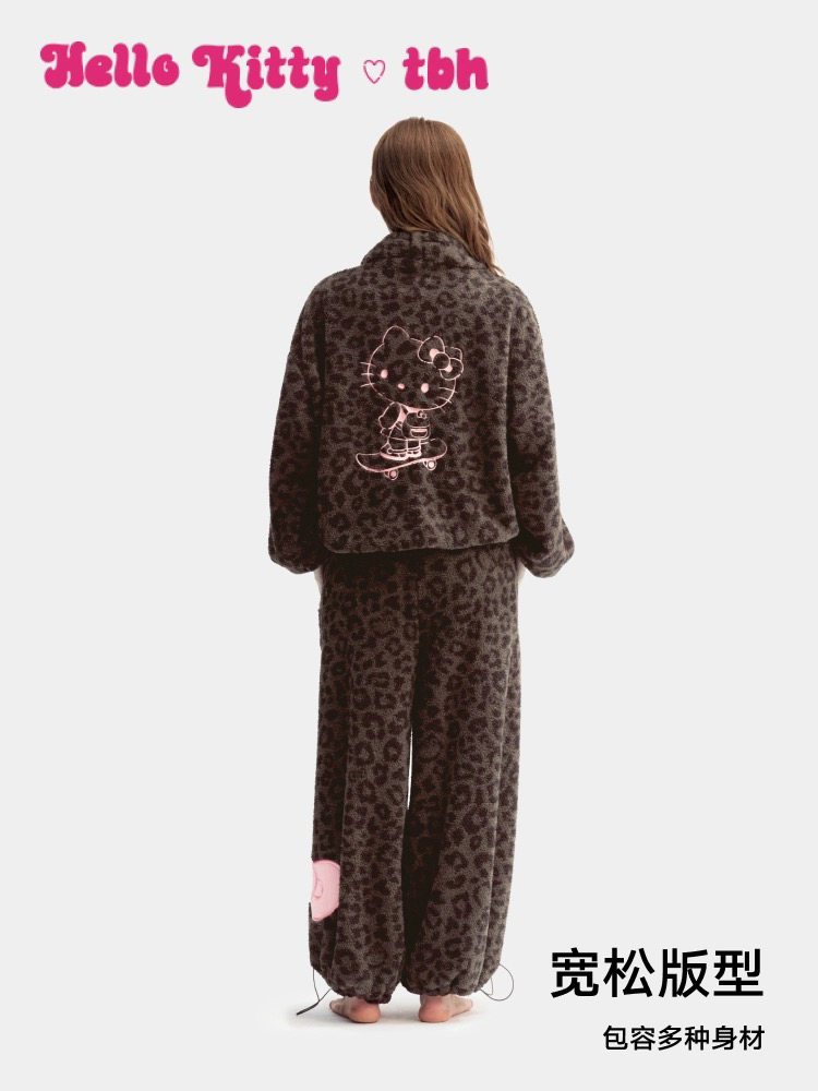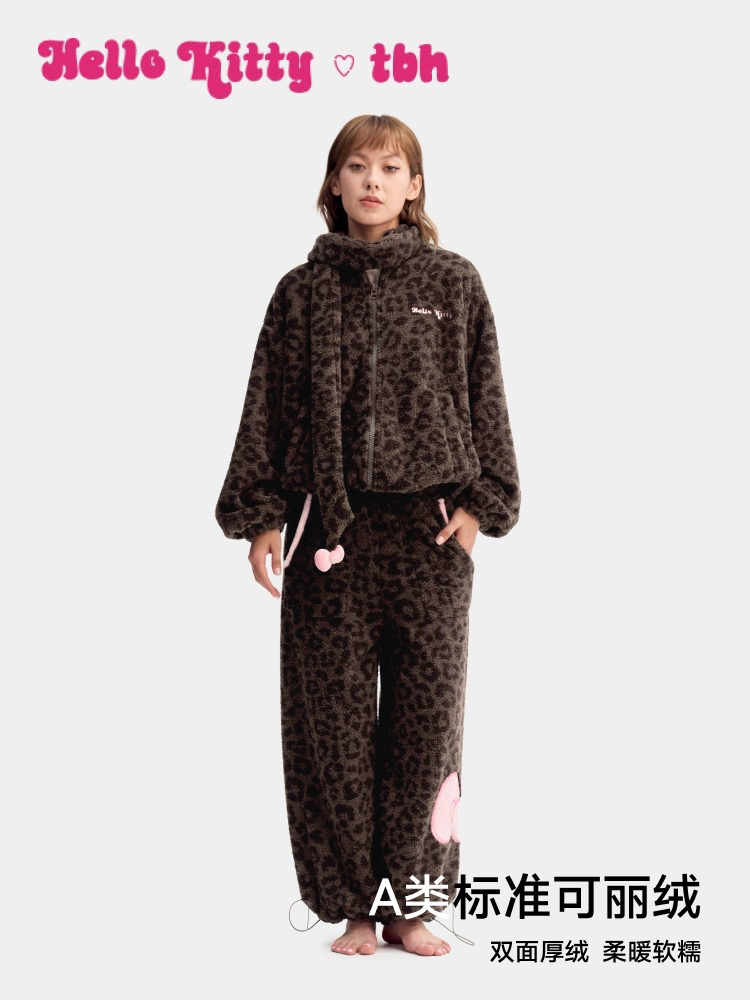 官网599!野兽家同款KITTY豹纹联名款可丽绒家居服套装 立领围巾领/撞色娃娃领 甜美可爱减龄温暖