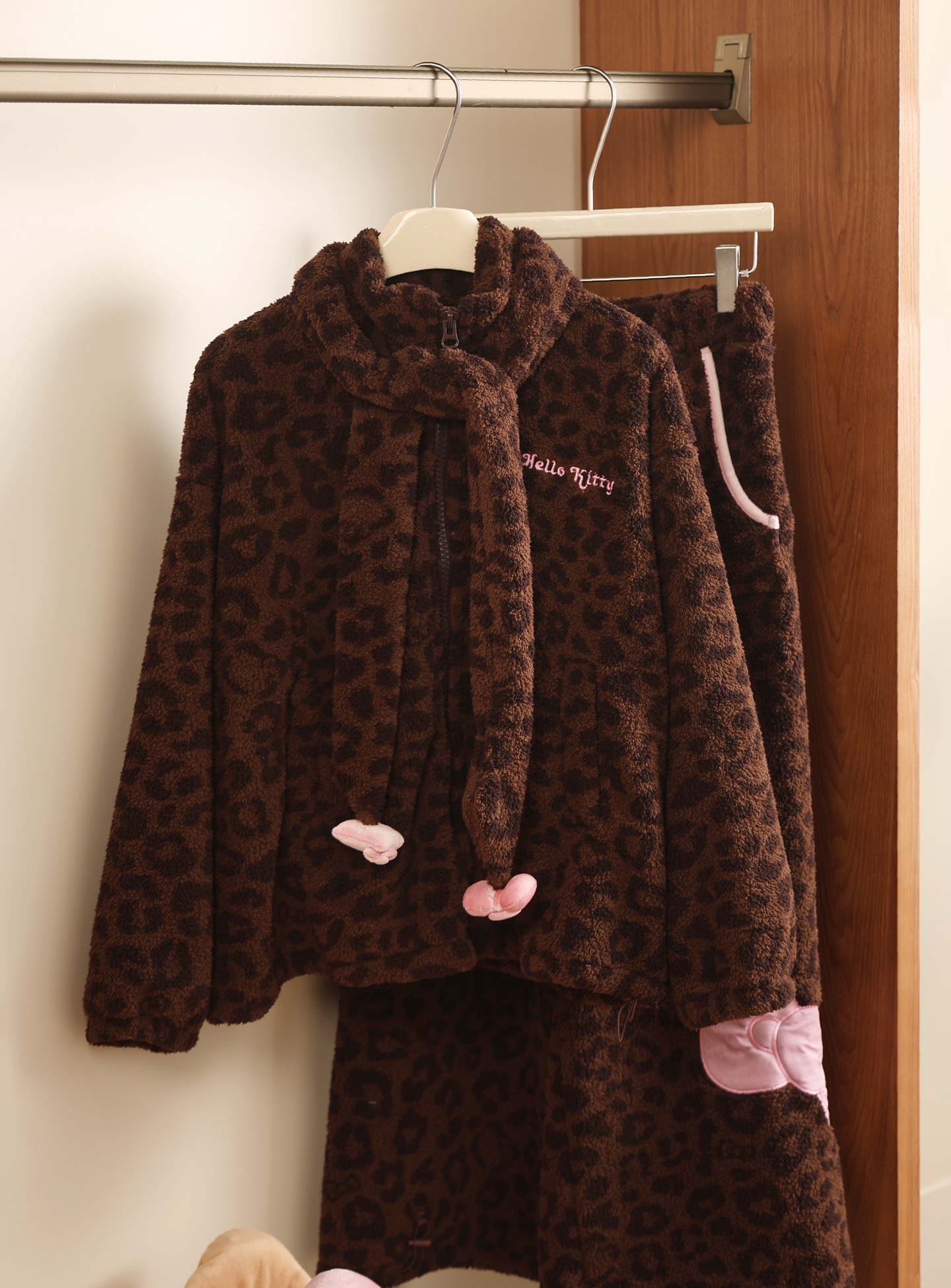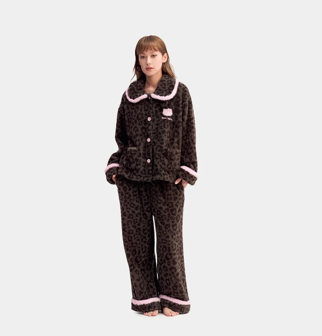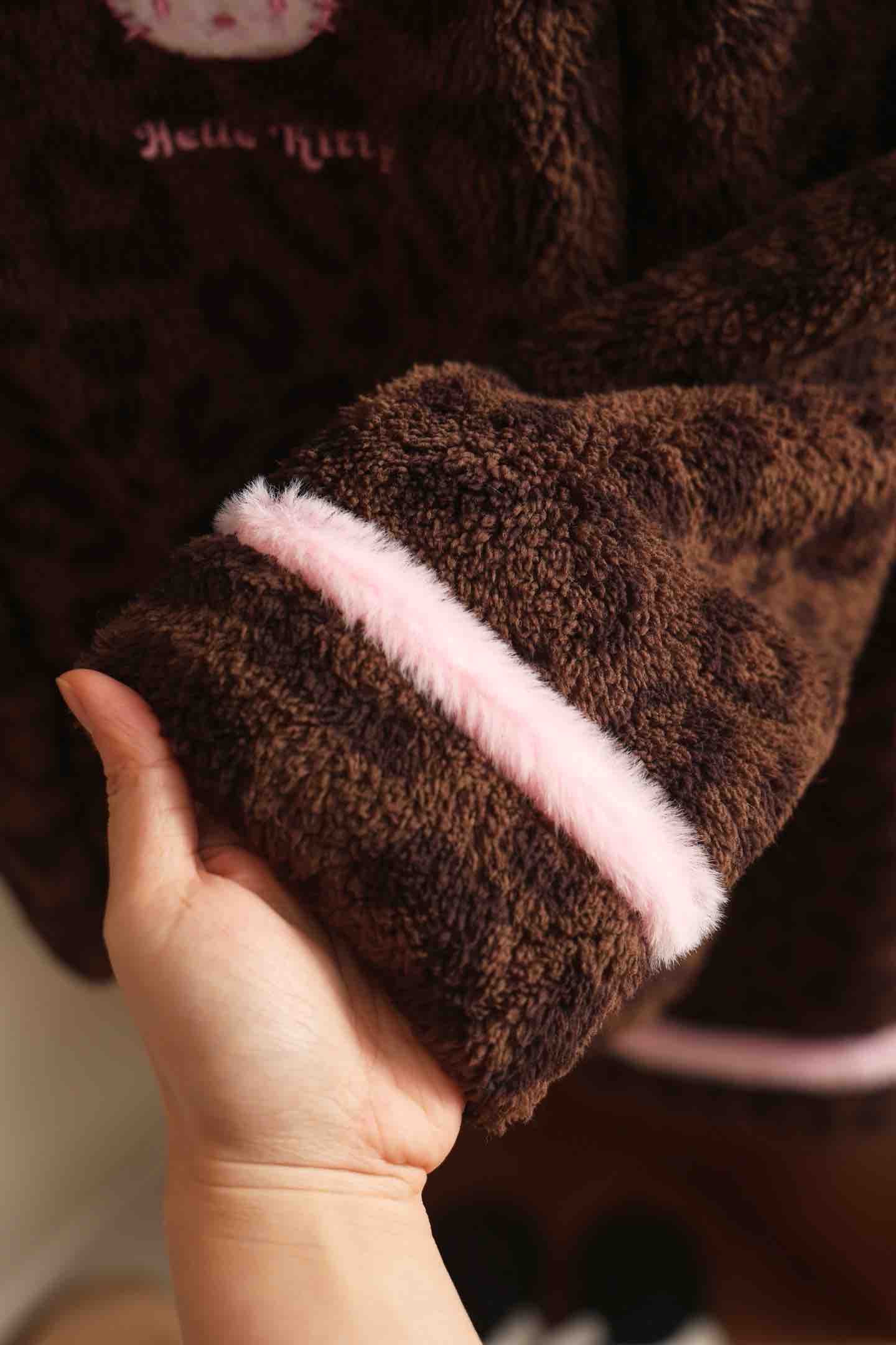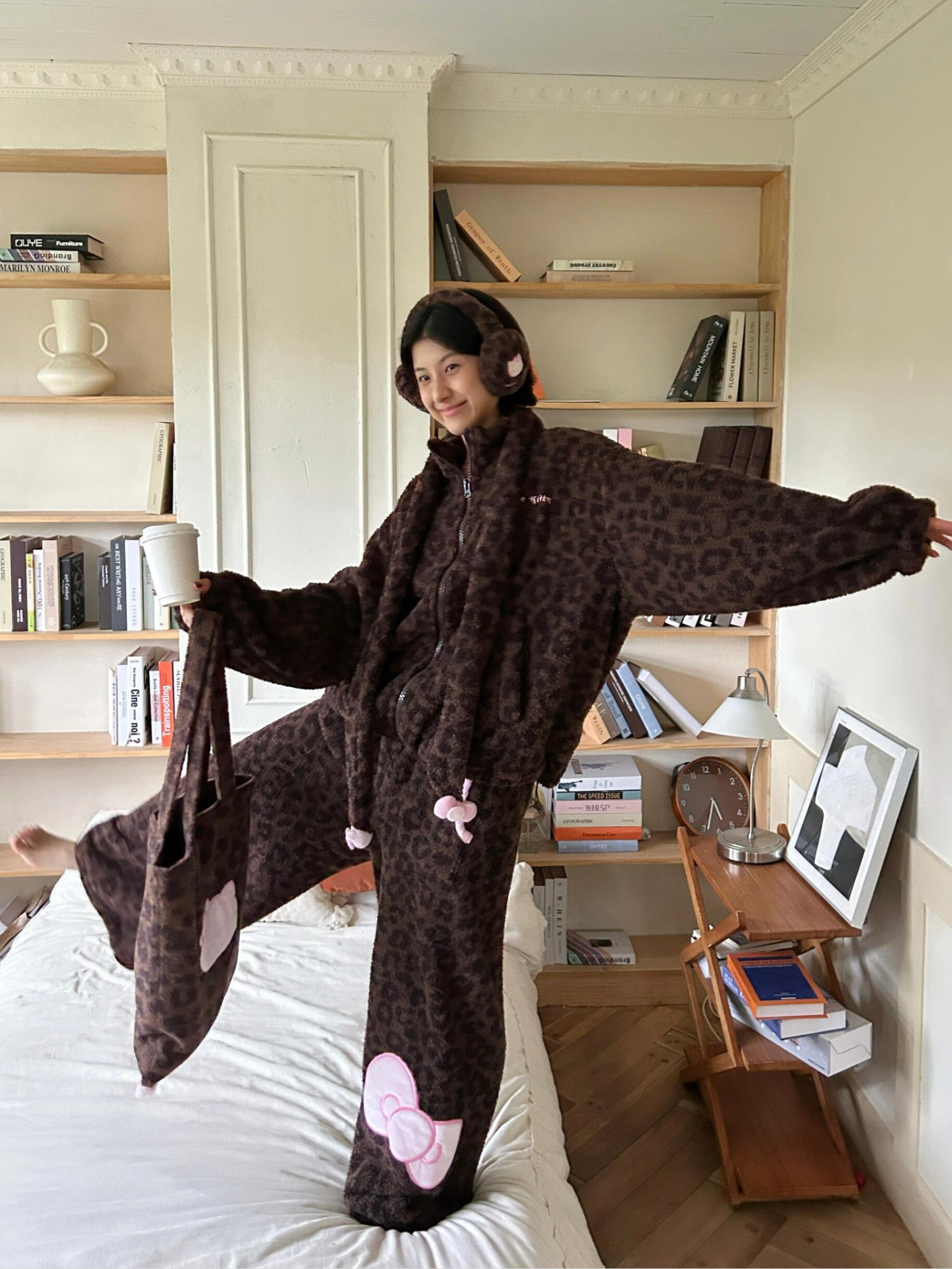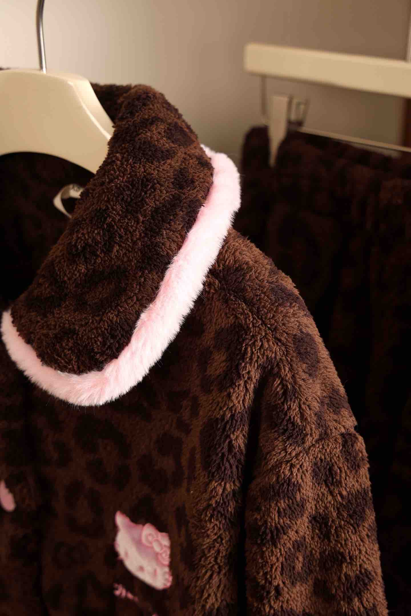 官网599!野兽家同款KITTY豹纹联名款可丽绒家居服套装 立领围巾领/撞色娃娃领 甜美可爱减龄温暖