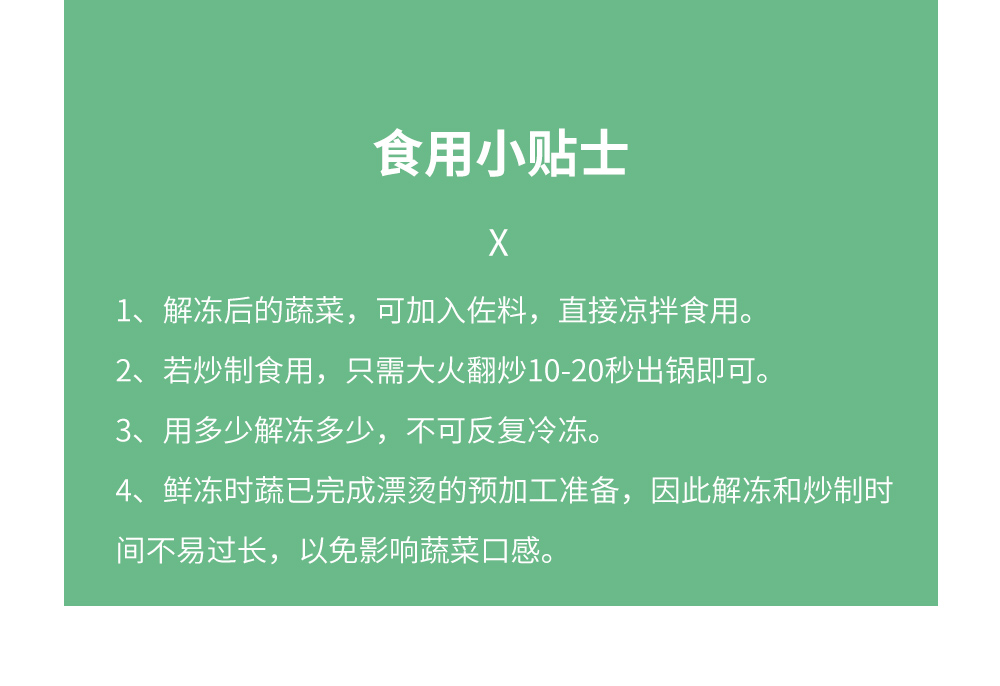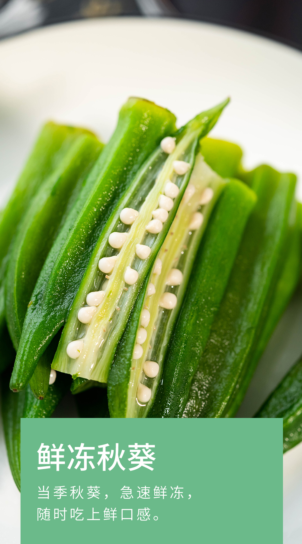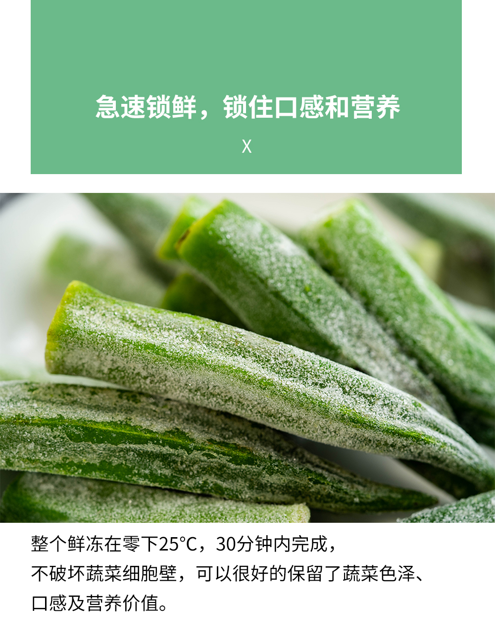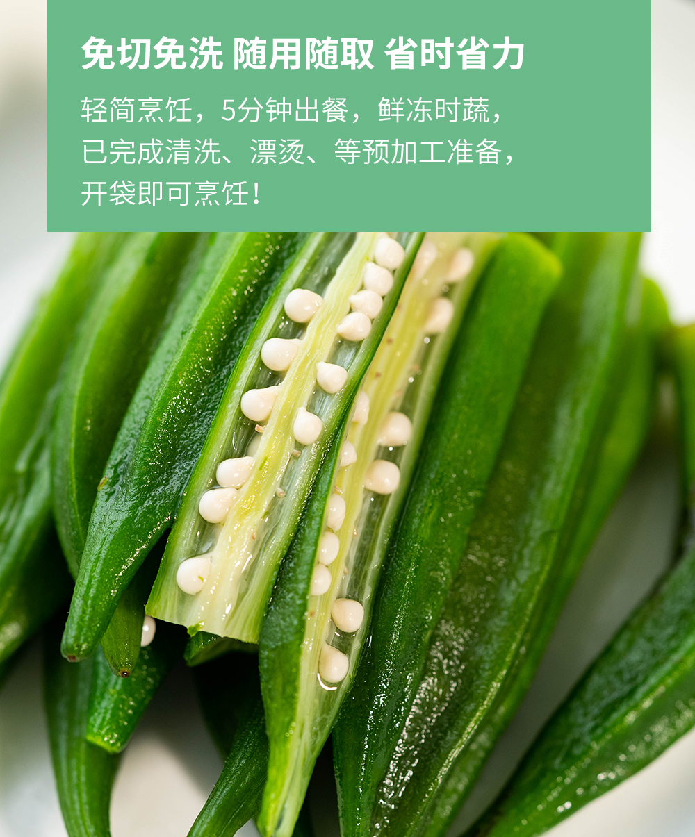 A:急速鲜冻蔬果主要的优势无疑在于其便利性,可以减少完成一顿餐饮的时间。根据传统流程,蔬菜从被买回家开始,需要经历洗菜、削皮、切菜、烹饪等一系列流程,才能端上餐桌,变成可供食用的菜肴。然而对于冷冻蔬省去了切菜和洗菜的步骤,直接拿出包装就可以使用,这显然减少了不少工作量,像秋葵这种不好存放的蔬菜,鲜冻是最好的选择。