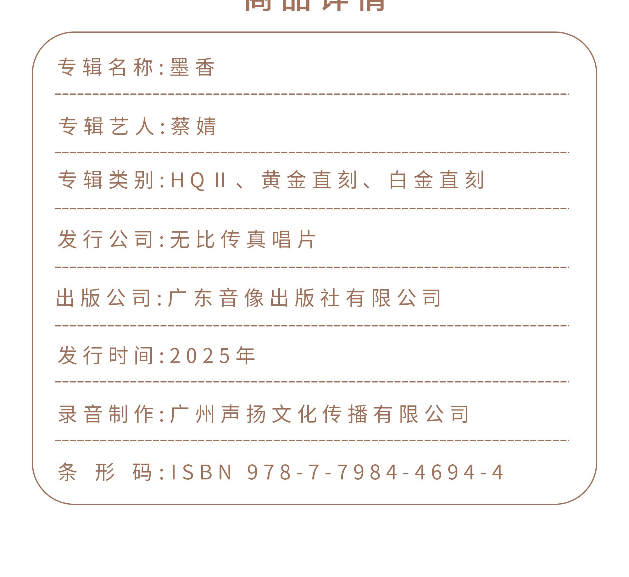 蔡婧 《墨香》专辑唱片HQⅡCD&1:1直刻&1:1黄金直刻 无比传真