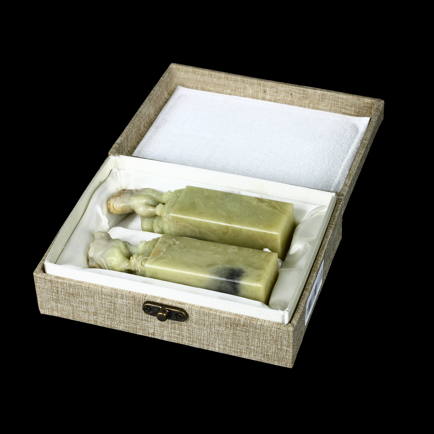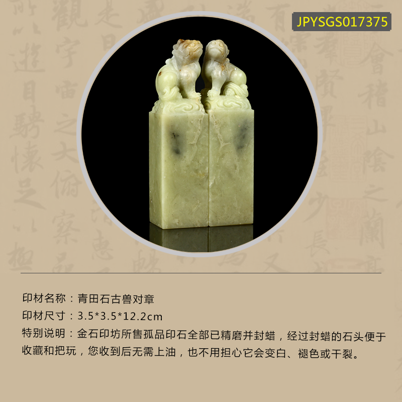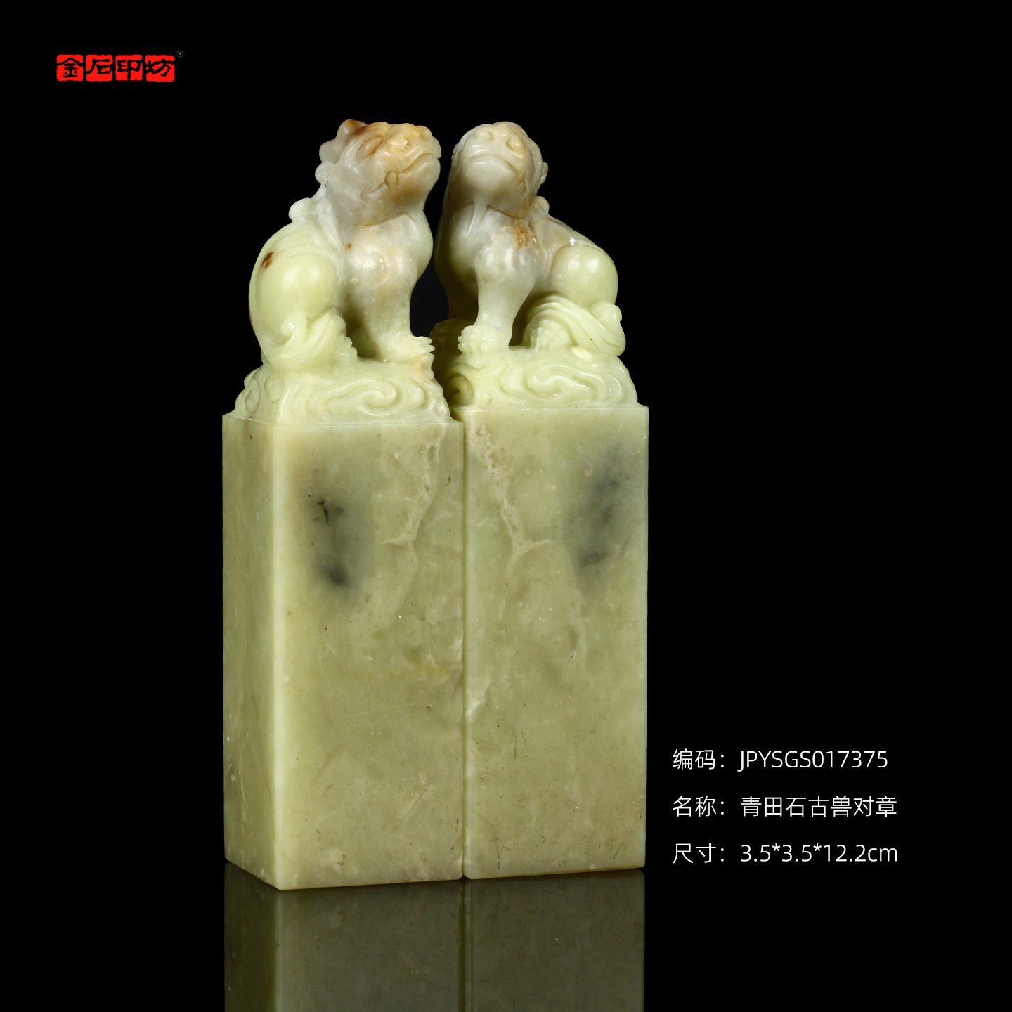 孤品017375青田石古兽对章-3.5*3.5*12.2cm