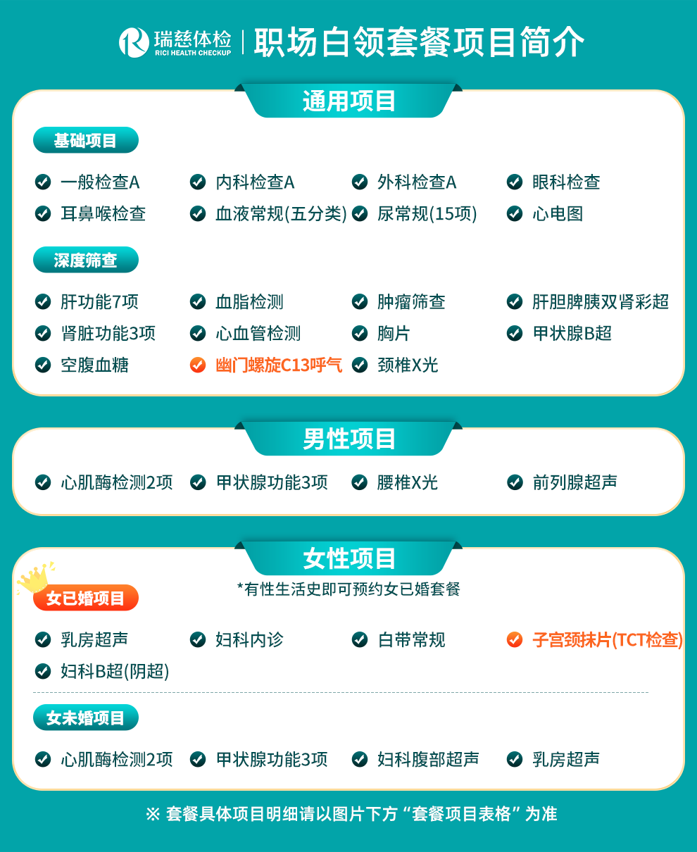 | 对身体多个系统做初步检查,能够做到常见疾病早发现、早预防、早治疗,适合企业白领人群年度福利体检 。 | |||||