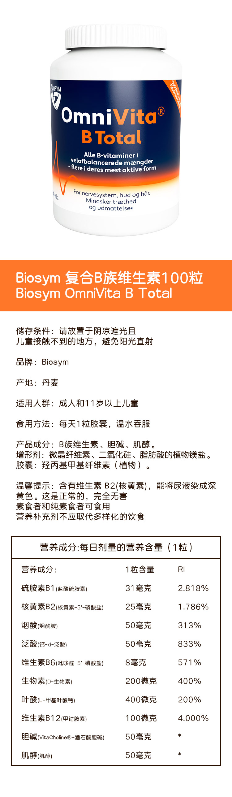 [丹麦]Biosym 复合B族维生素100粒.Biosym OmniVita B Total 100kaps.