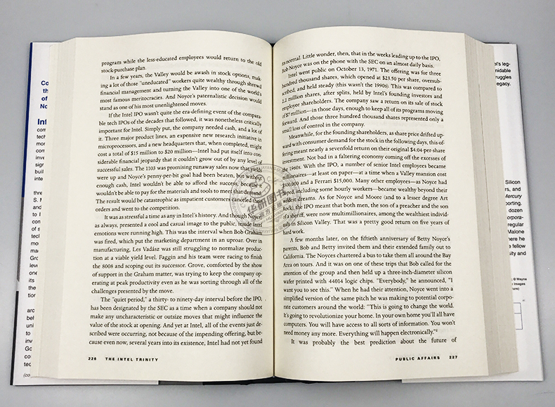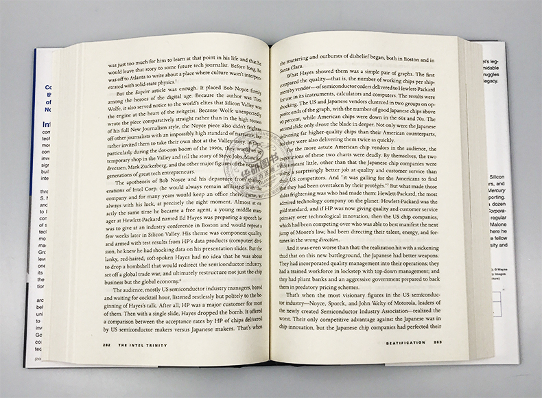 The Intel Trinity《三位一体:英特尔传奇》一书讲述了罗伯特·诺伊斯、戈登·摩尔和安德鲁·格鲁夫如何缔造了世界上重要公司的故事。公司的“外交家”诺伊斯被视为圣父、“思想家”摩尔被视为圣灵、“行动家”格鲁夫被视为圣子,这个三位一体的组合创下了企业管理中的奇迹,开创了一个价值万亿美元的产业,将一家初创企业打造成为千亿美元的巨型公司。