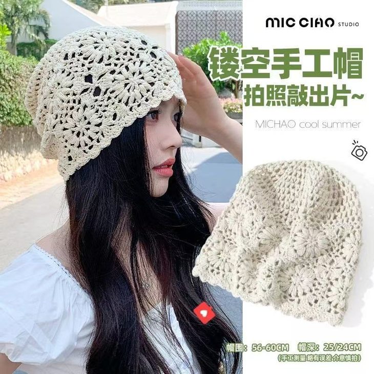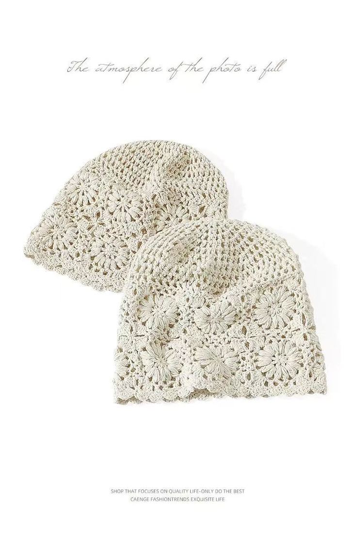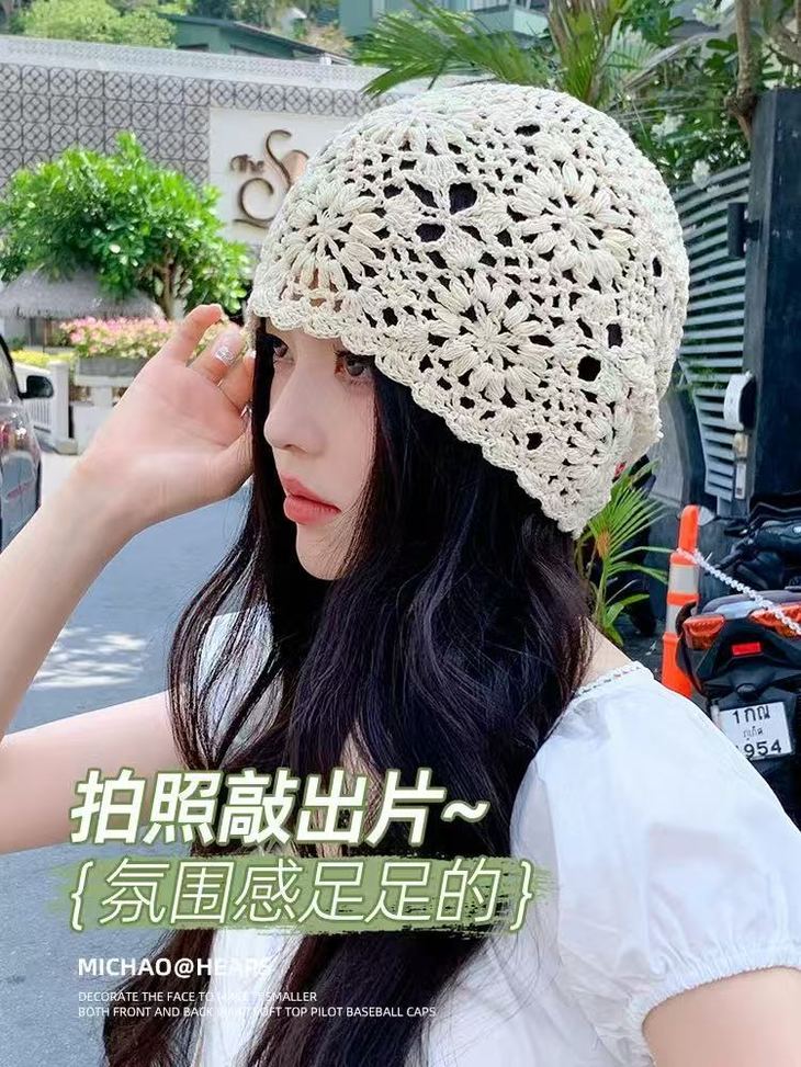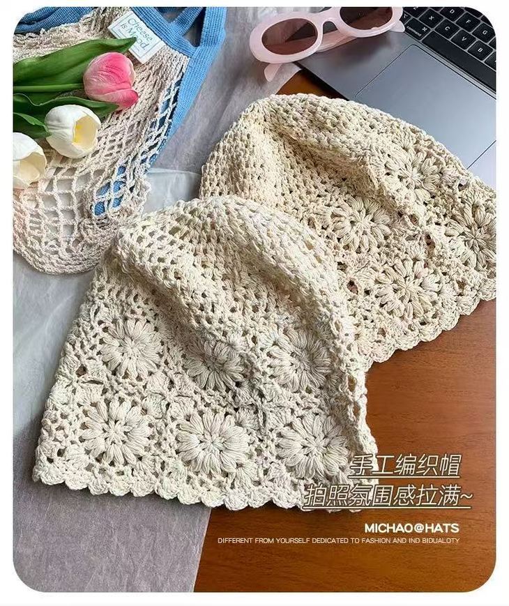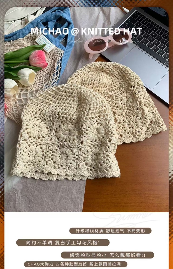 【拍照敲出片❗镂空手工毛线帽】甜美LOOK「范围感足足的」简约不单调,复古手工勾花风格,修饰脸型显脸小,怎么带都好看❗日系手工花朵编织包头帽,复古文艺透气堆堆帽L
