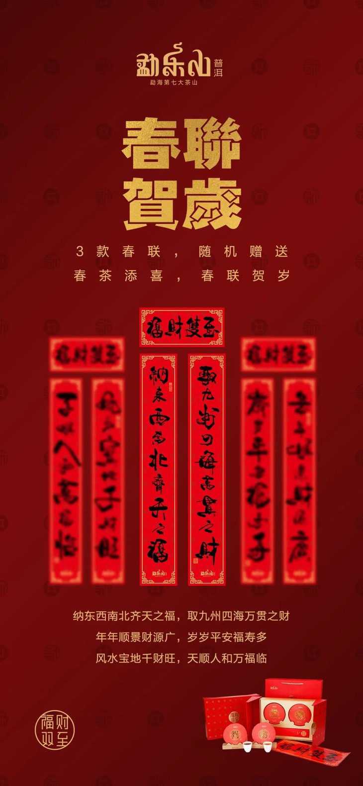 3款春联内容分别为:纳东西南北齐天之福,取九州四海万贯之财;年年顺景财源广,岁岁平安福寿多;风水宝地千财旺,天顺人和万福临。