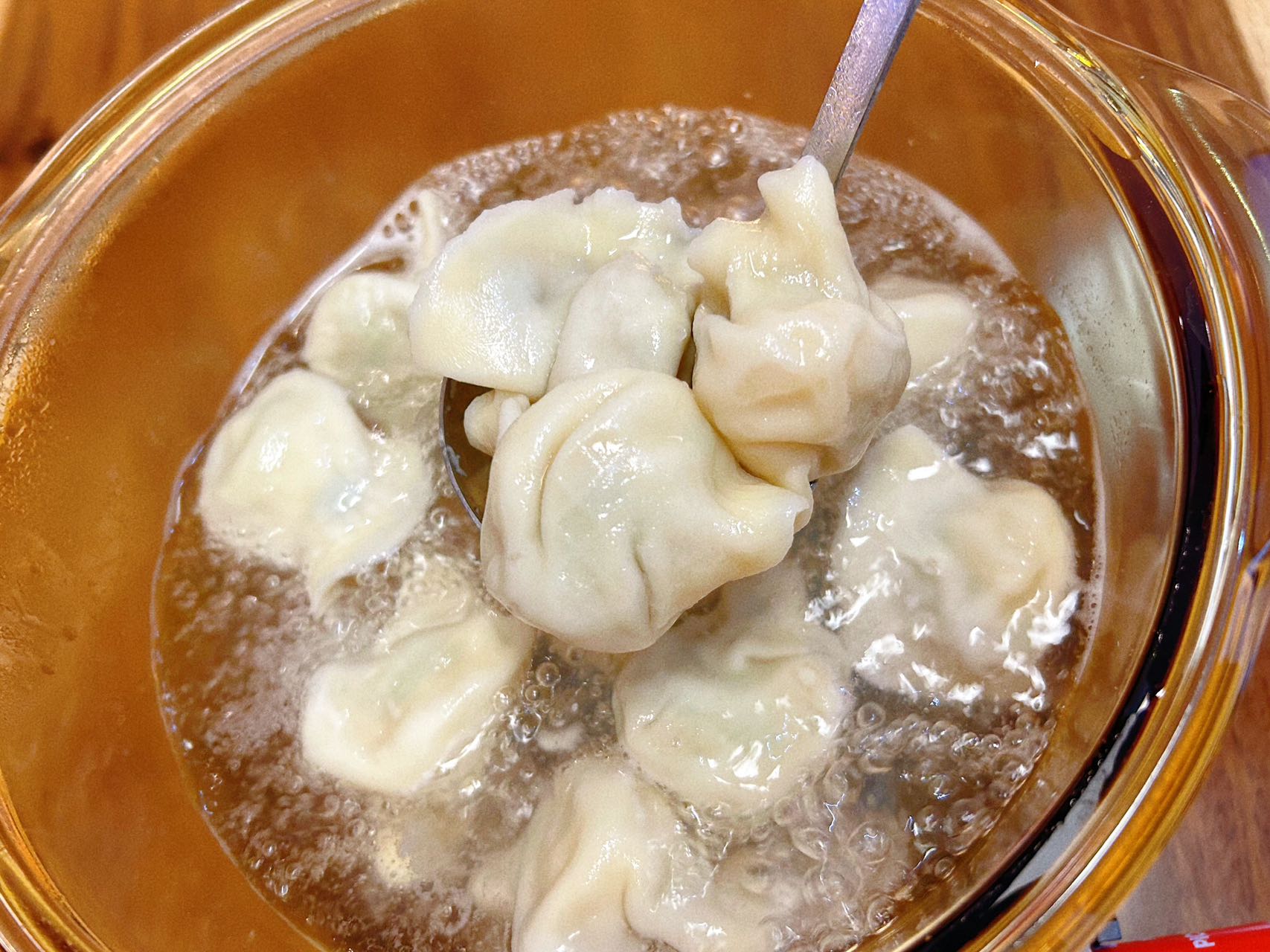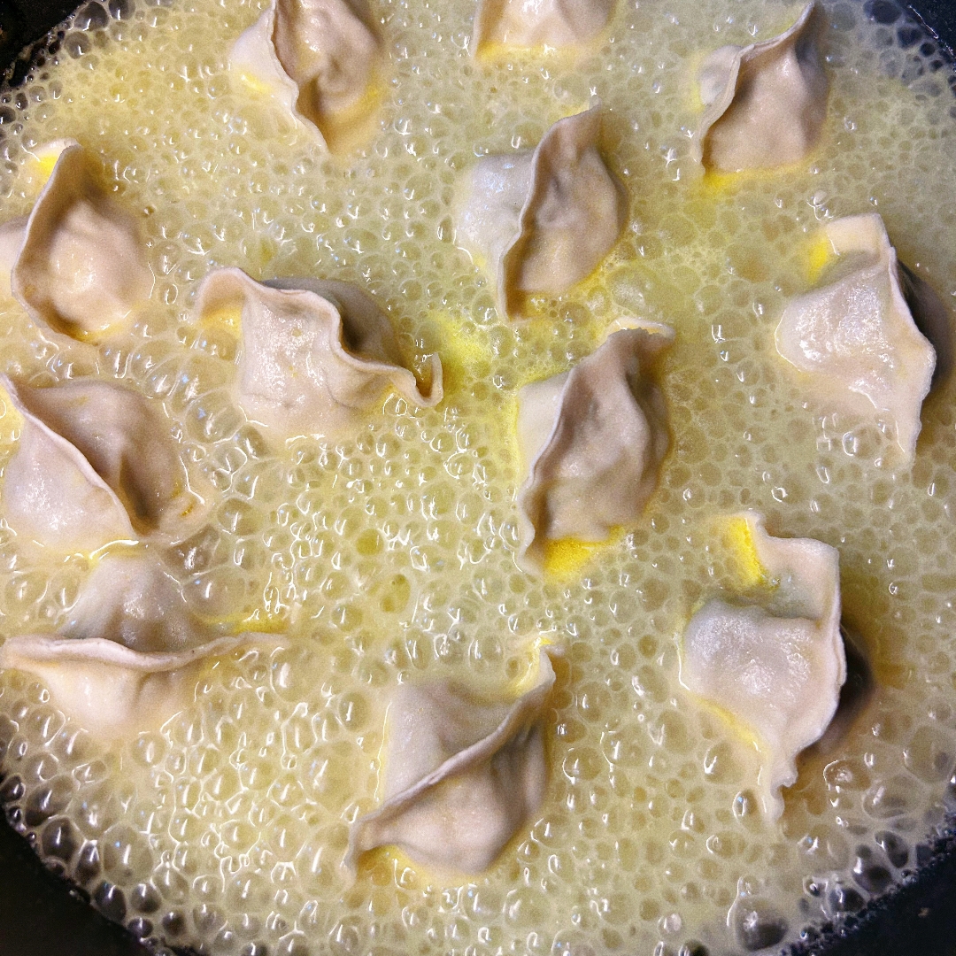 🥟煮:将水饺直接放入沸水中,沿锅边轻轻顺水推搅,煮7-8分钟,水饺肚鼓起即可捞出装盘