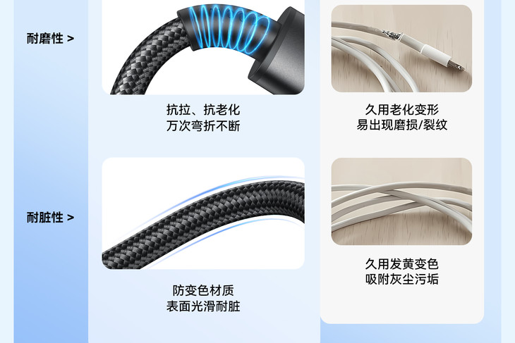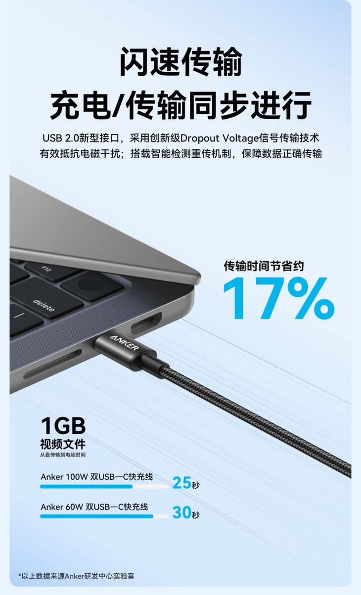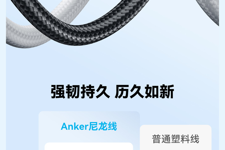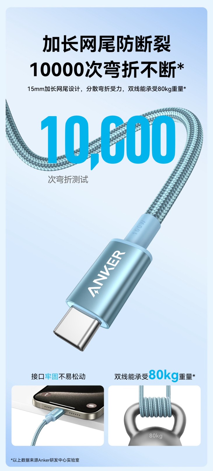 而且安克数据线的改良型新尼龙编织材质,耐磨耐扯,拒绝打结,还经过了10000次弯折测试,加长网尾设计分散受力,双线可承受80kg重量,接口牢固不松动,质量超可靠!