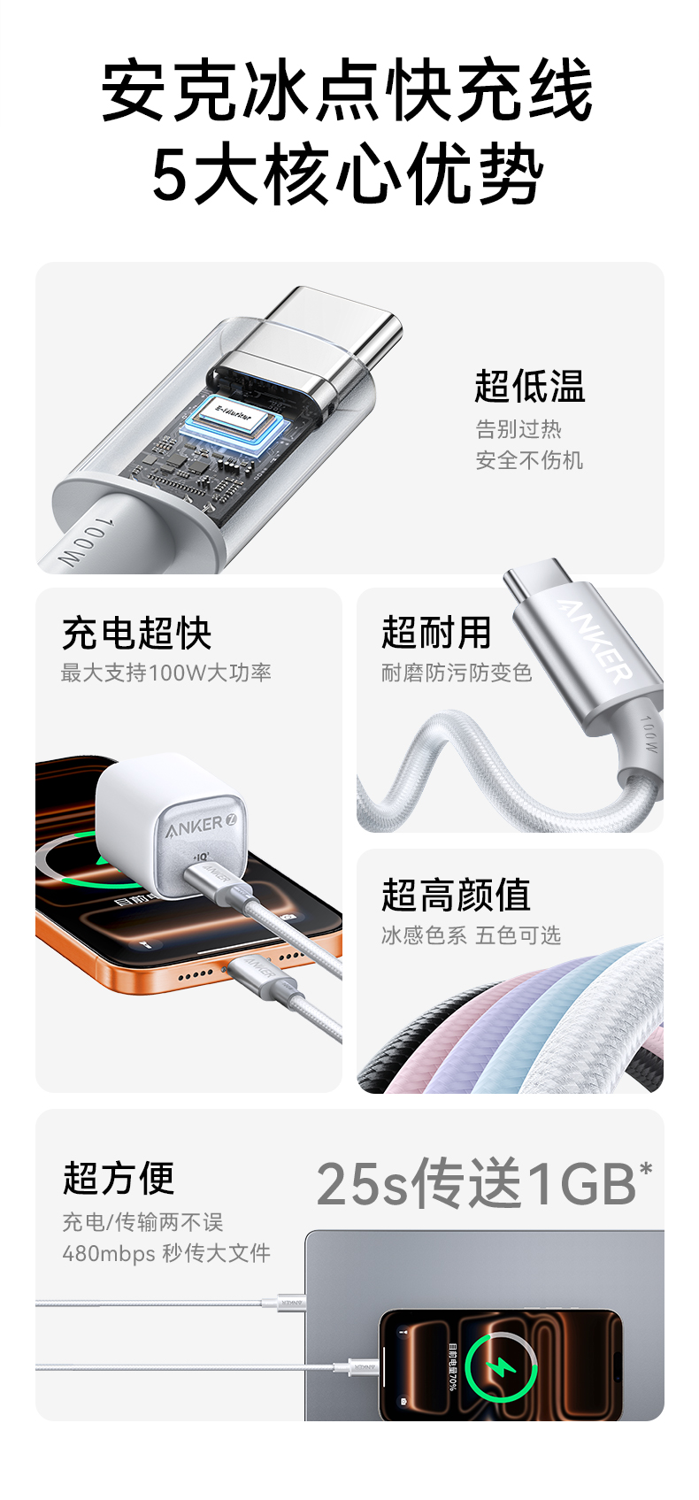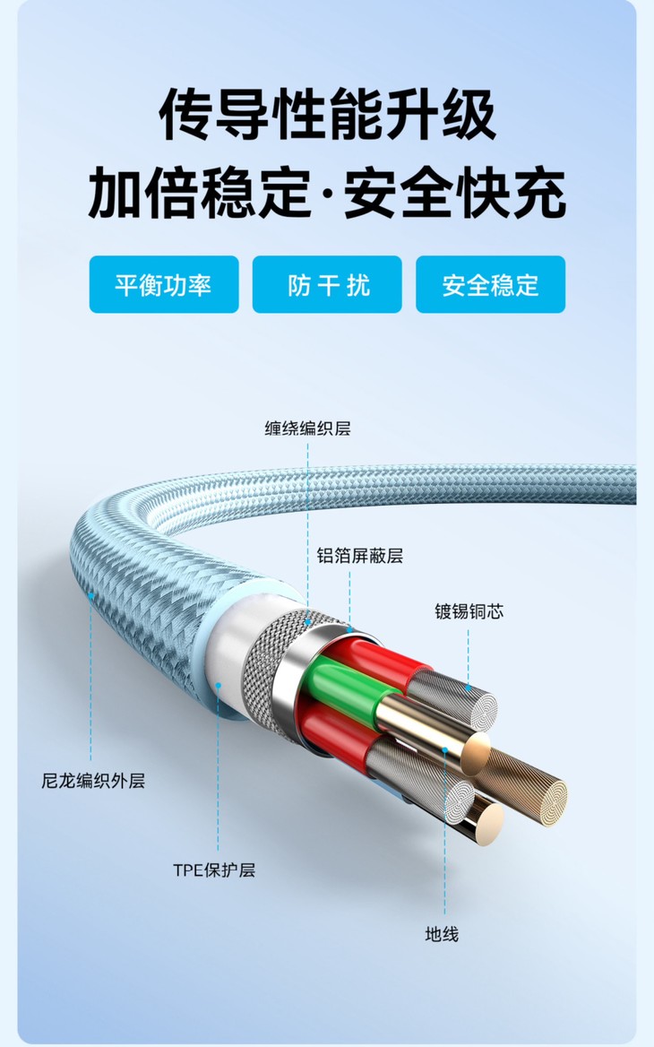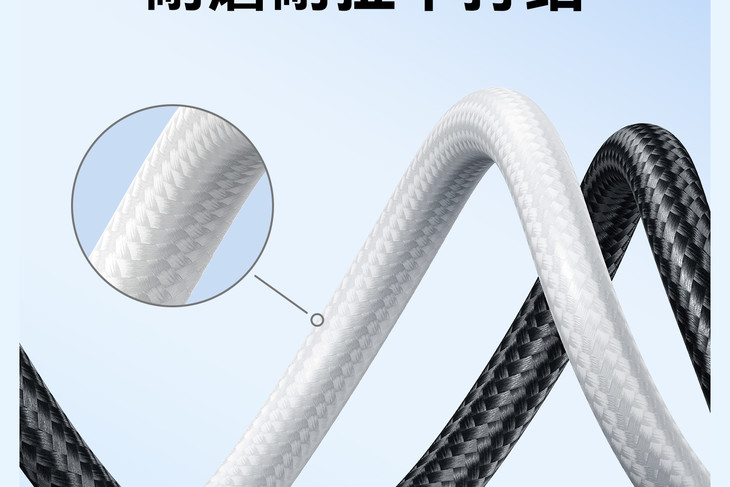 安克的编织数据线,内置E-Marker智能芯片,实时精准监测调控电流电压,快速充电的同时还能贴心保护设备,传导性能相普通数据线更是大幅升级!它的多层结构设计超厉害的,有缠绕编织层、铝箔屏蔽层、镀锡铜芯、尼龙编织外层、TPE 保护层和地线,不仅平衡功率、抗干扰,还保障安全稳定,实现闪速传输,充电、传数据两不误!