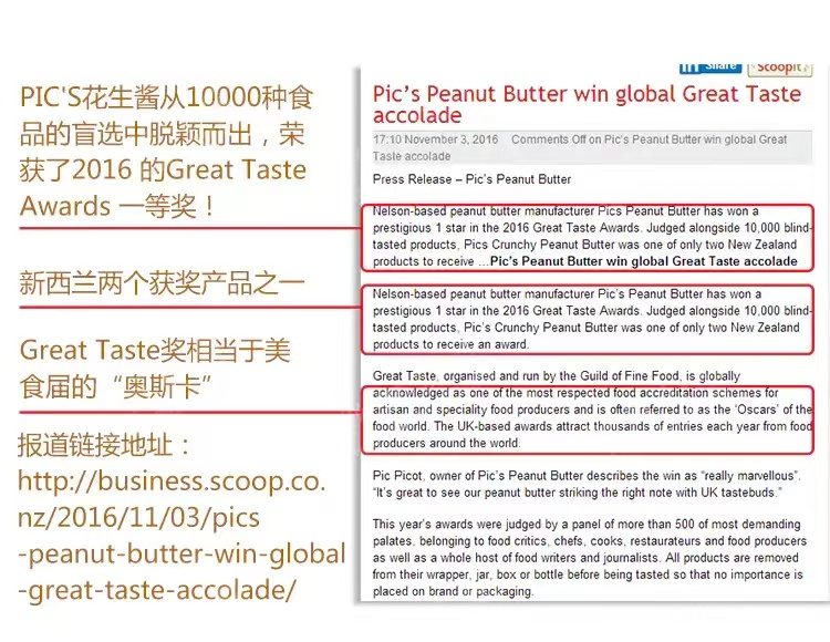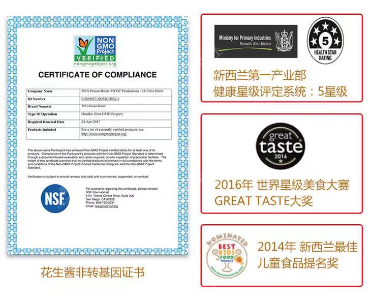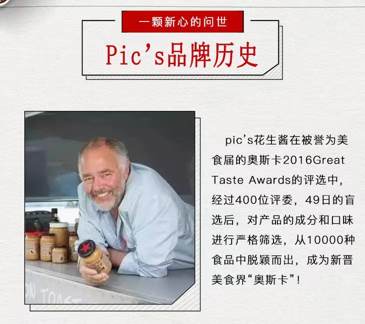 听说这款花生酱在新西兰的市场占有率超高,几乎可以达到每3个人买一瓶花生,其中就有一瓶是PICS。它获得过多项国际大奖,连续两年获得美食界的奥斯卡——Great Taste大奖第一名!可想而知,这是一款从全世界挑剔的味觉评判下,大放异彩的花生酱,作为一个吃货,还没吃过的话,不会觉得这是一个大大大大遗憾吗!?