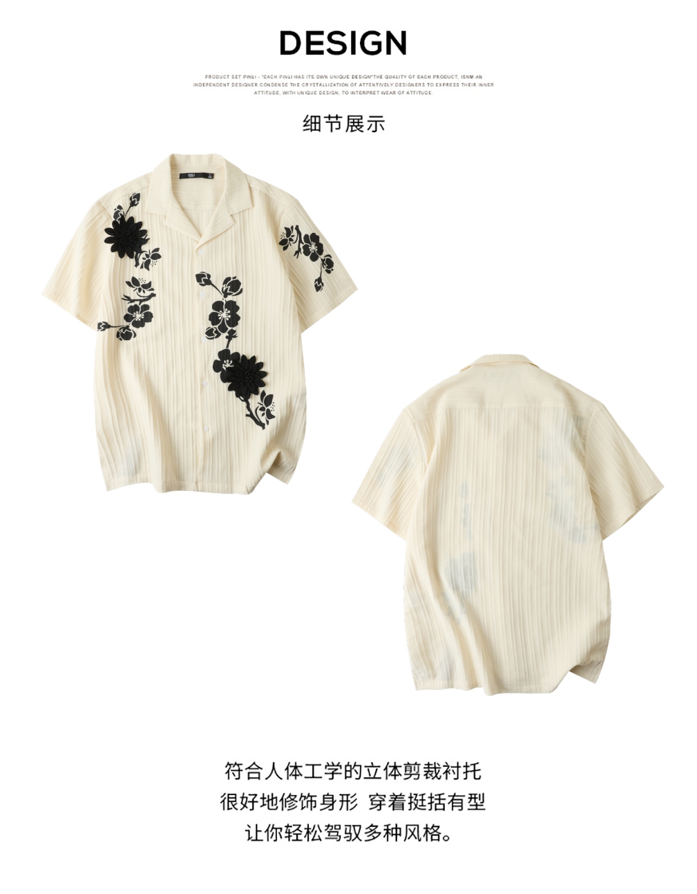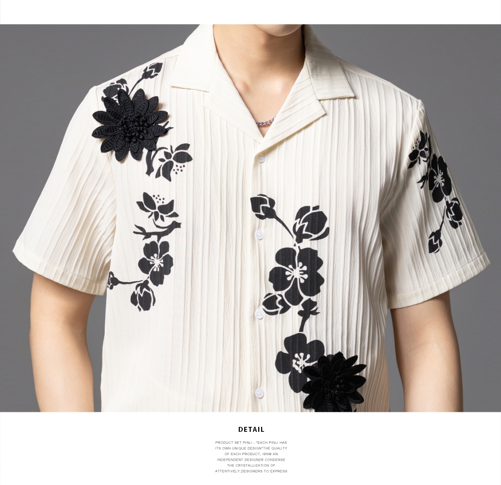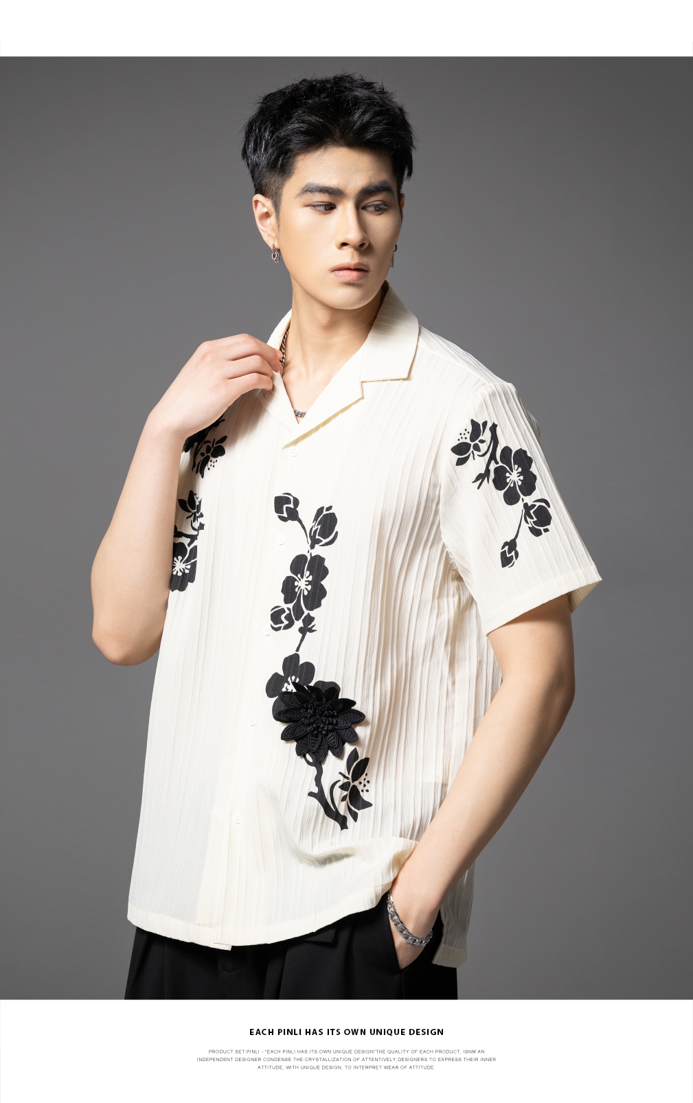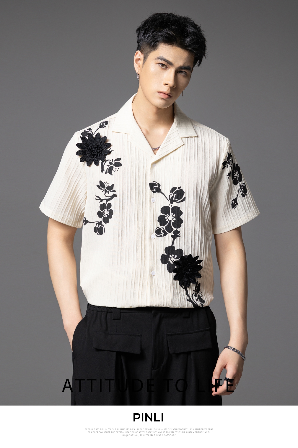 PINLI品立夏季新款国潮印花短袖衬衫男士休闲贴布绣宽松衬衣B252113059