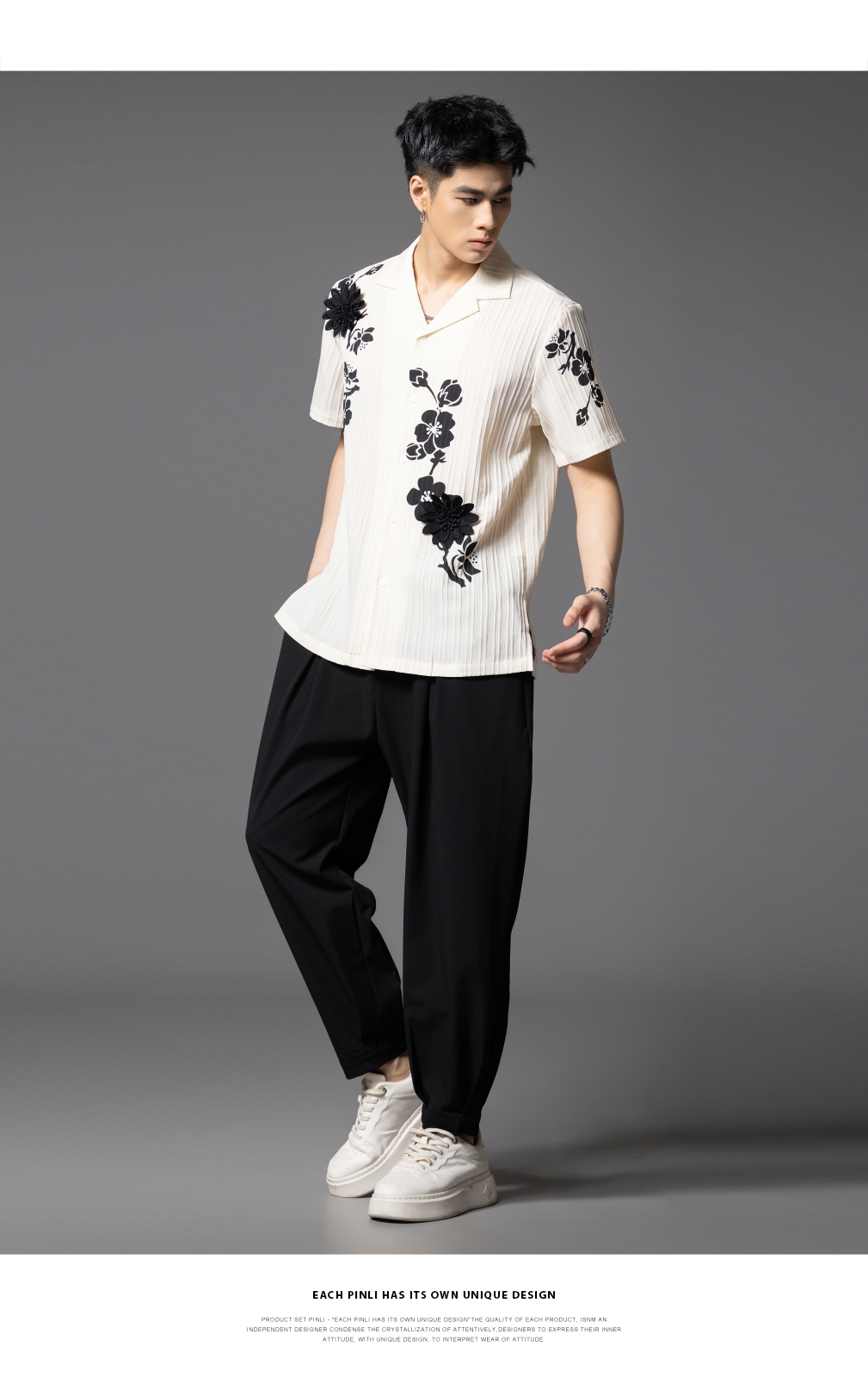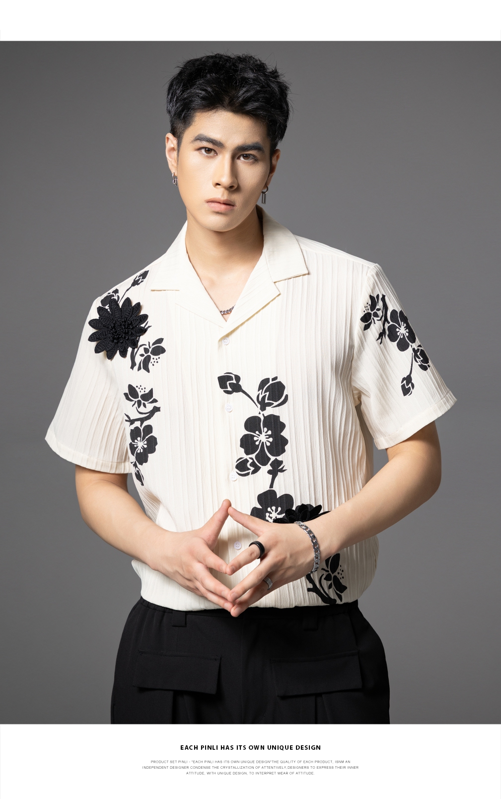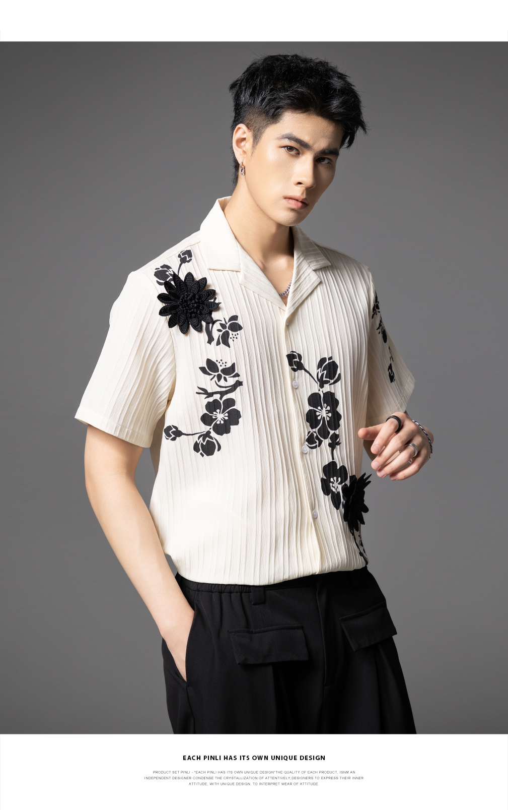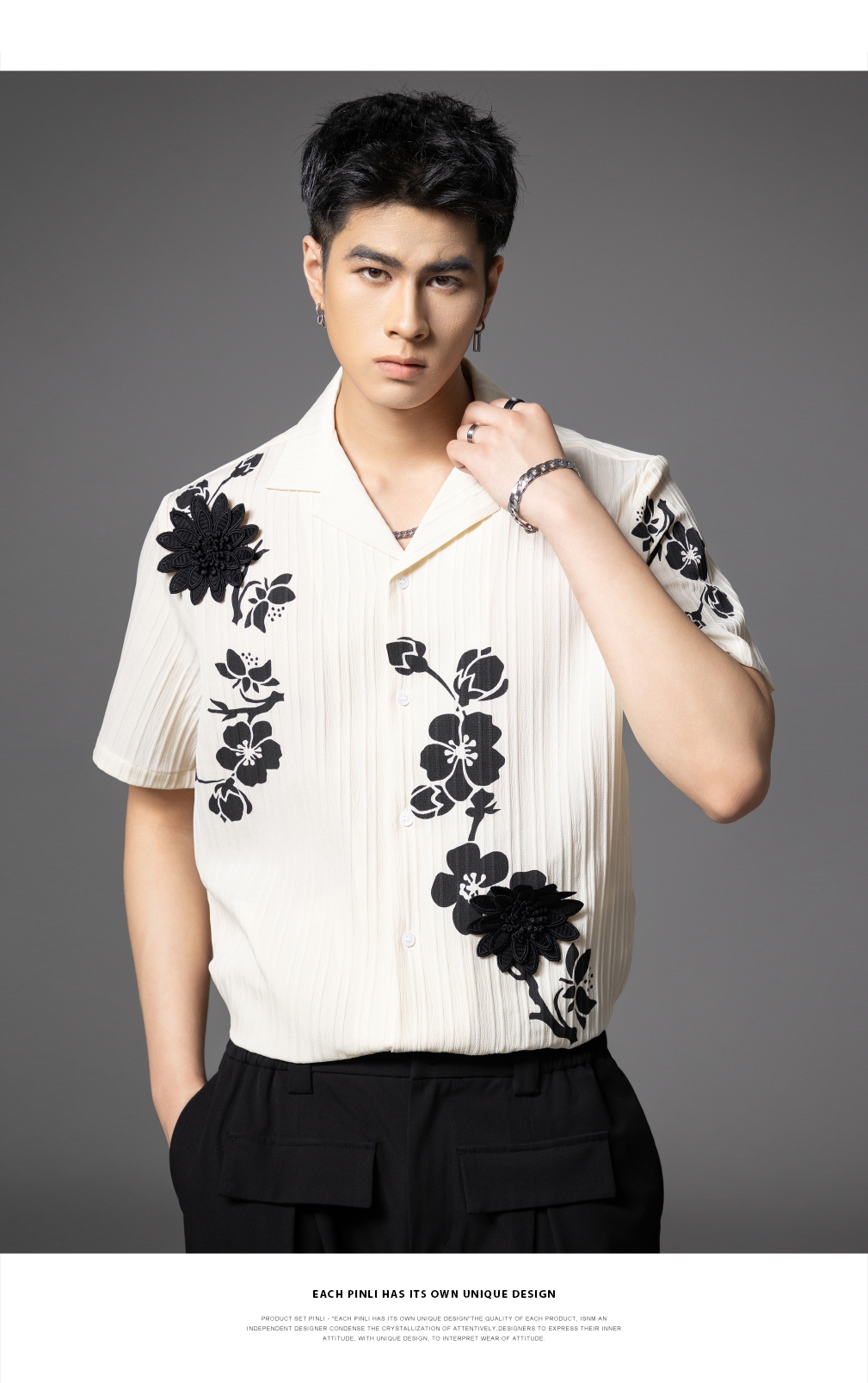 PINLI品立夏季新款国潮印花短袖衬衫男士休闲贴布绣宽松衬衣B252113059