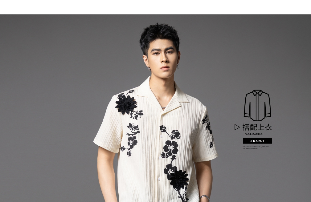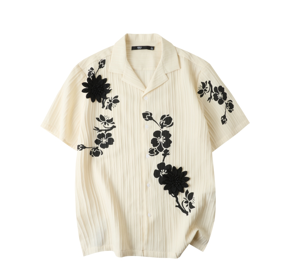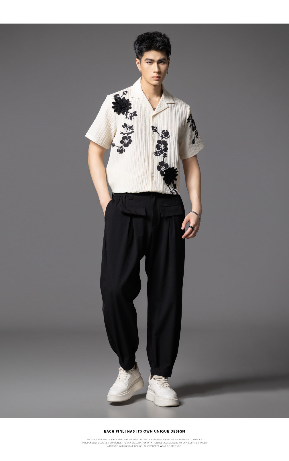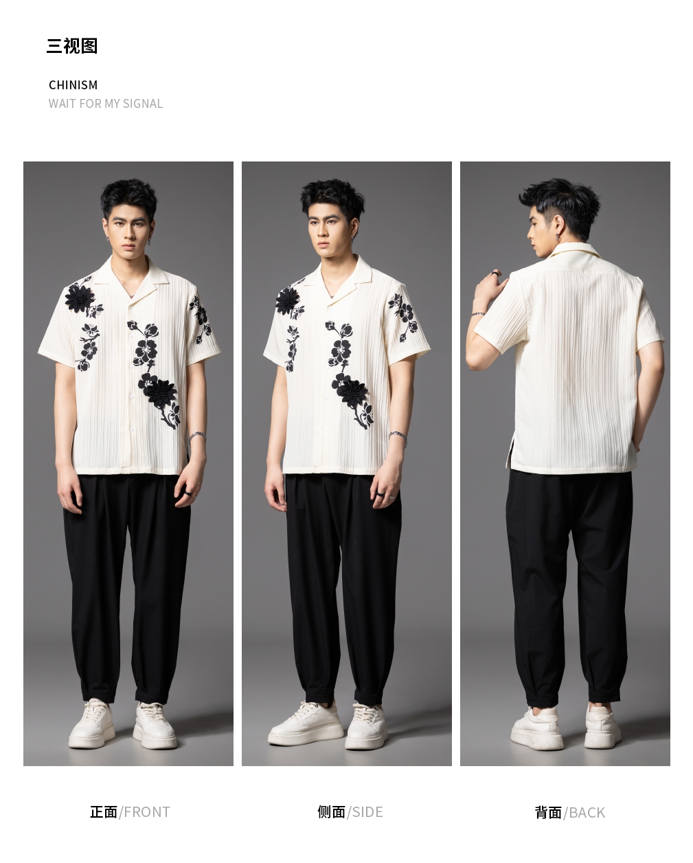 PINLI品立夏季新款国潮印花短袖衬衫男士休闲贴布绣宽松衬衣B252113059
