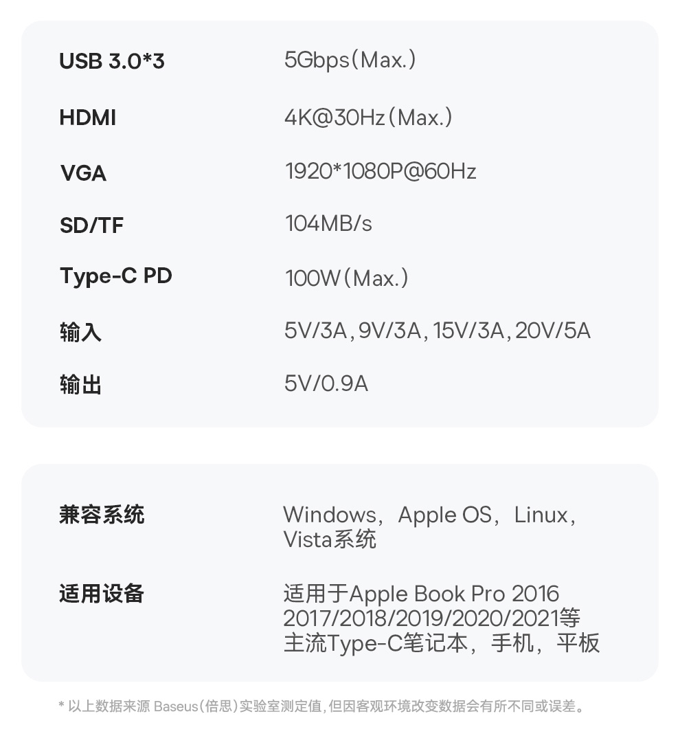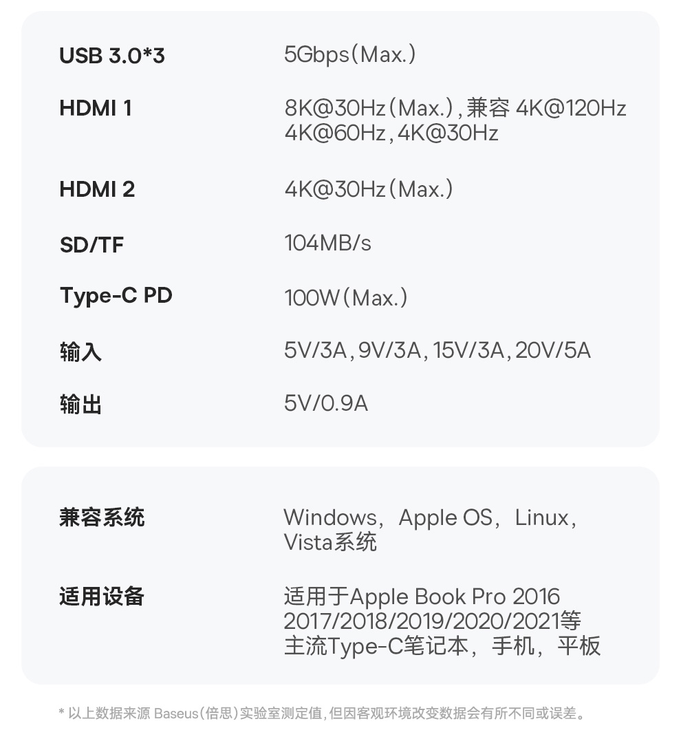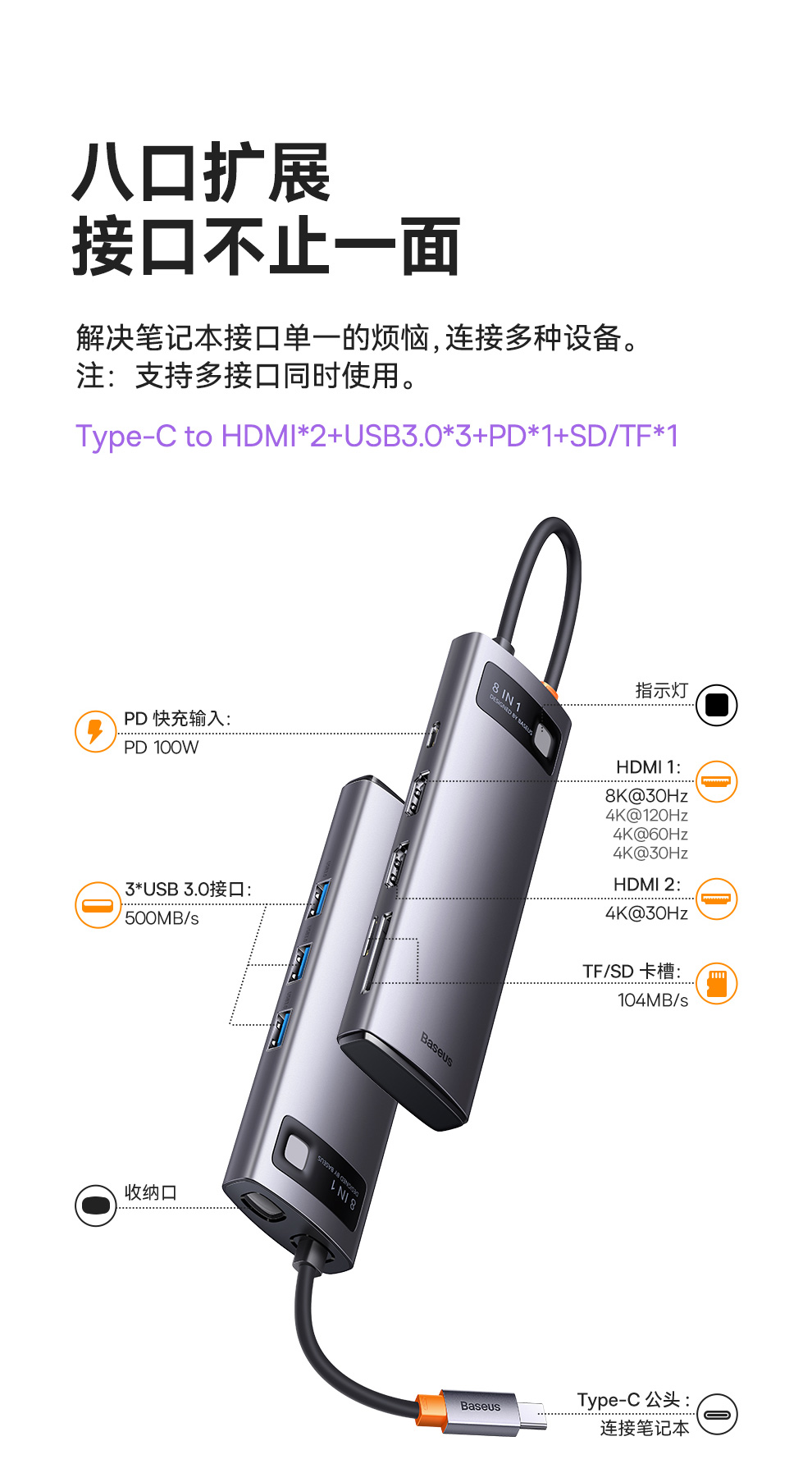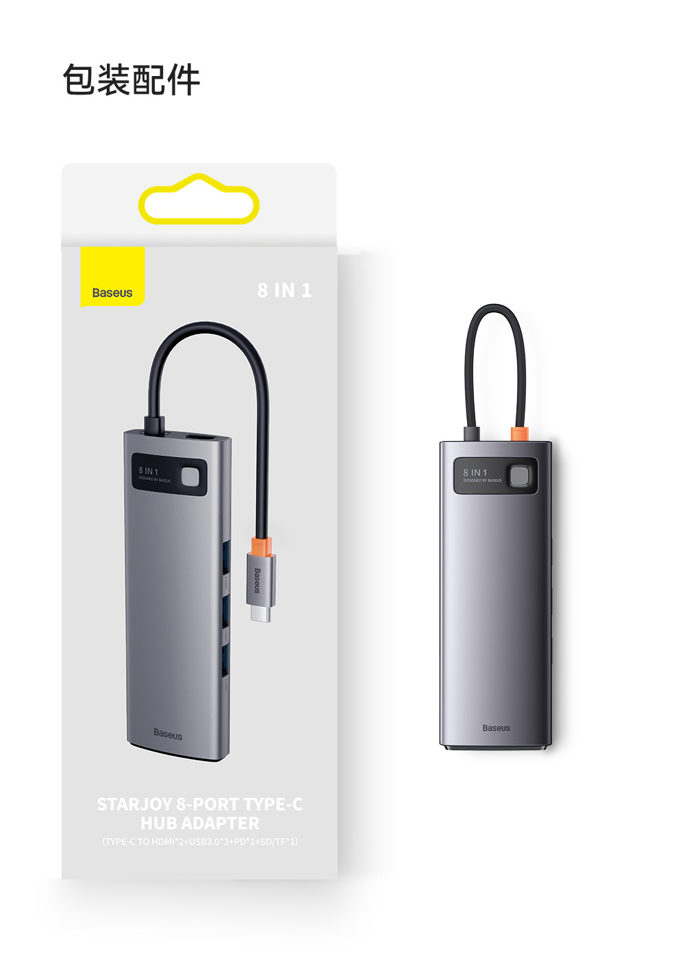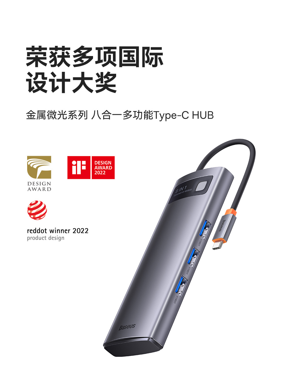 倍思 金属微光系列 八合一多功能Type-C HUB 扩展坞 深空灰