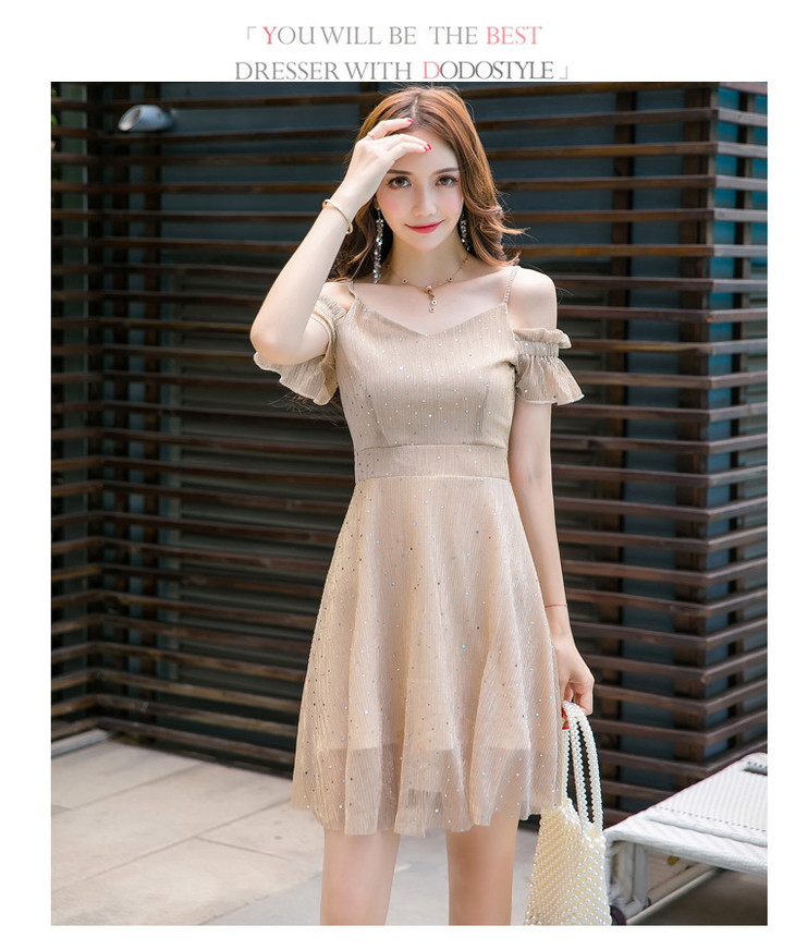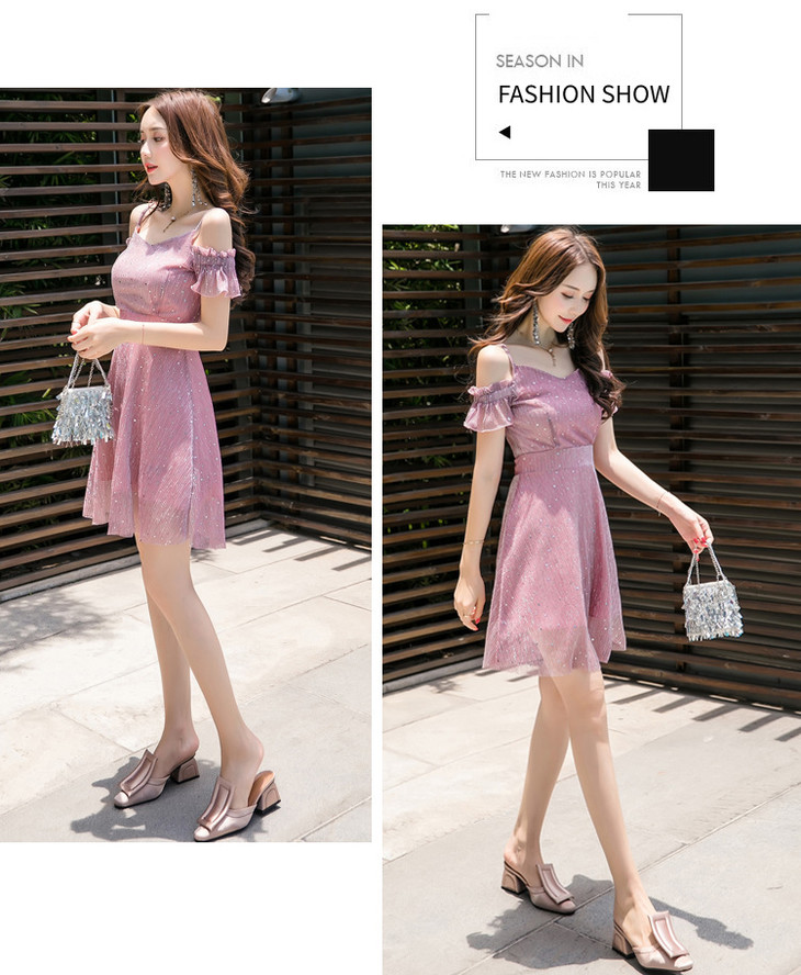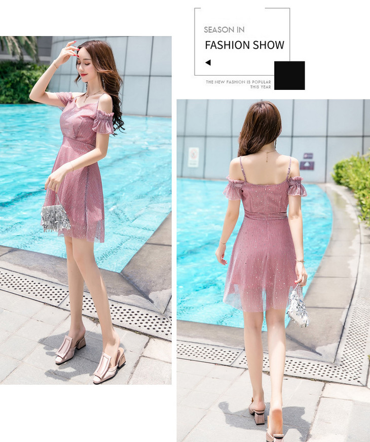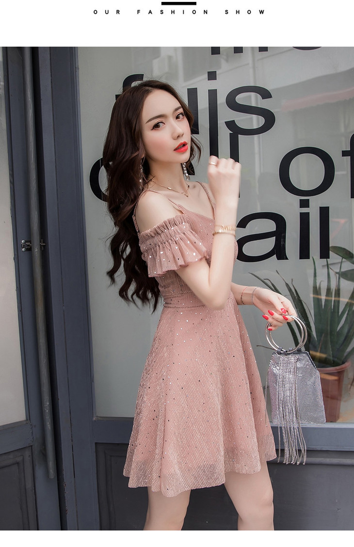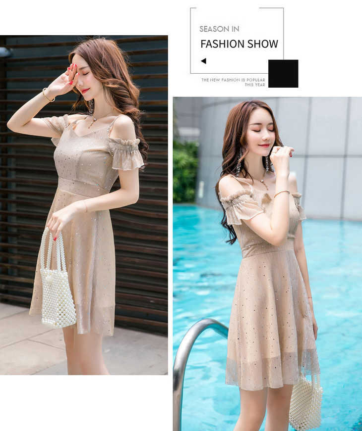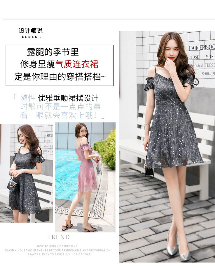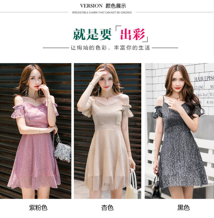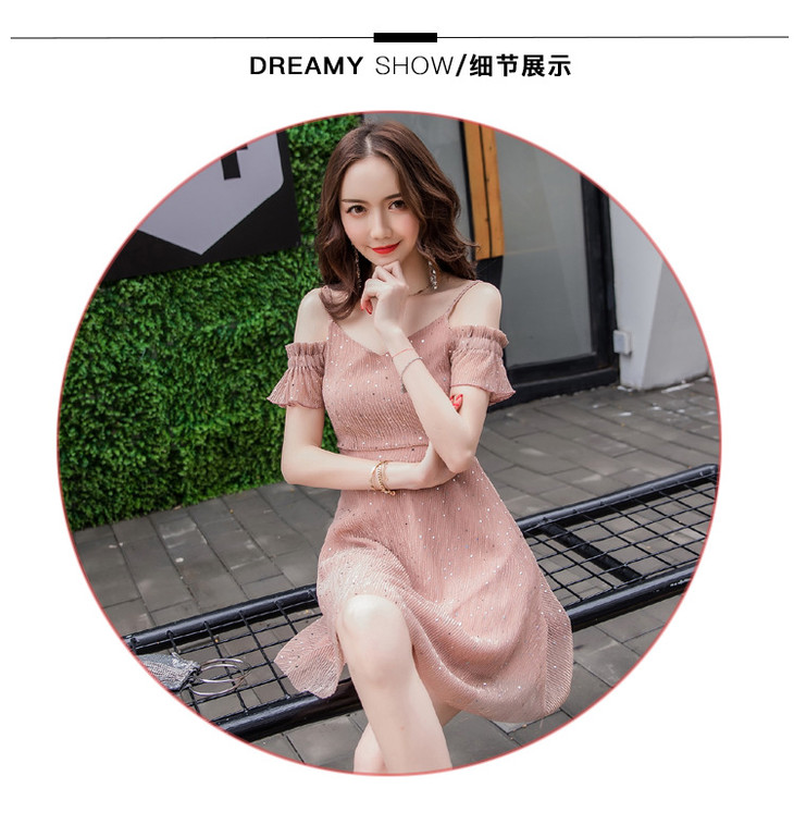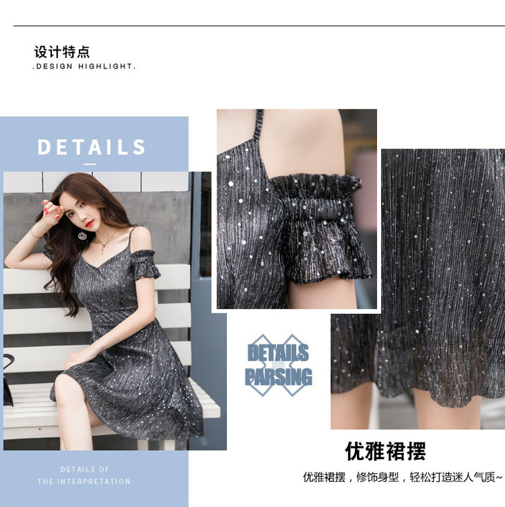 【服饰鞋包】。夏季温柔仙女裙小心机修身显瘦亮片露肩雪纺吊带连衣裙