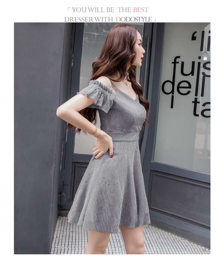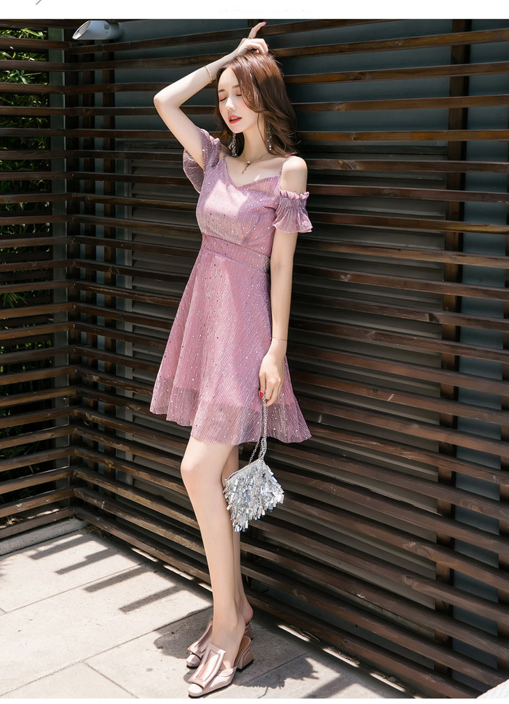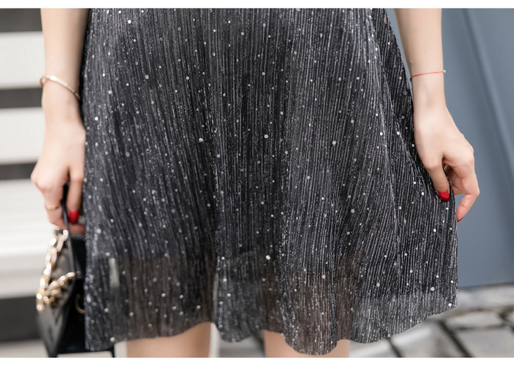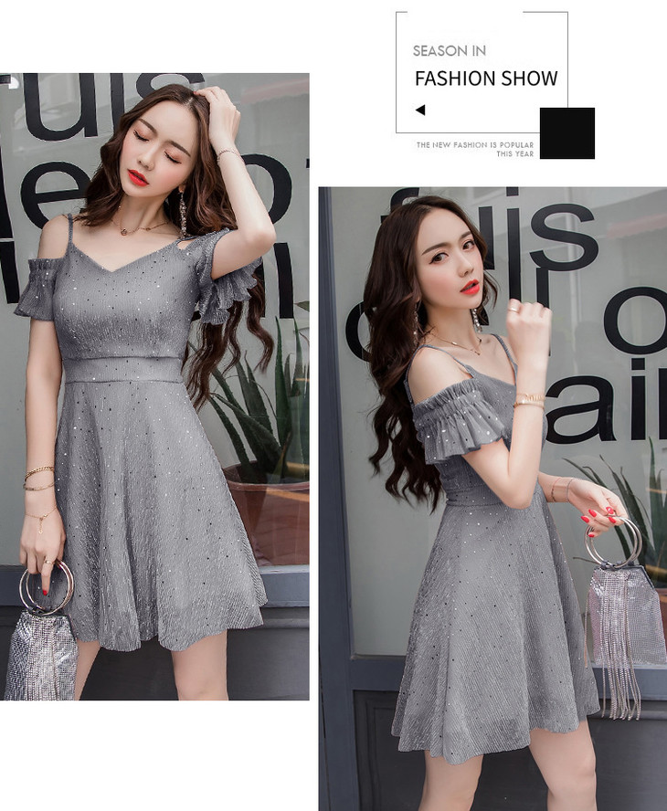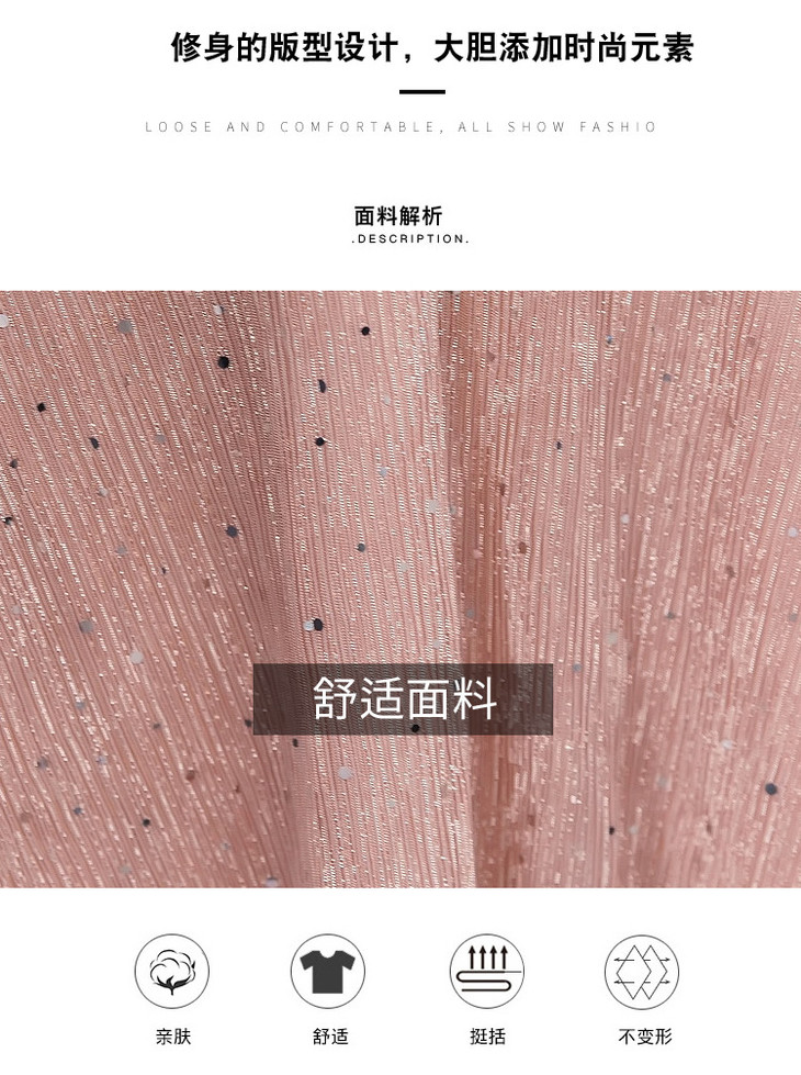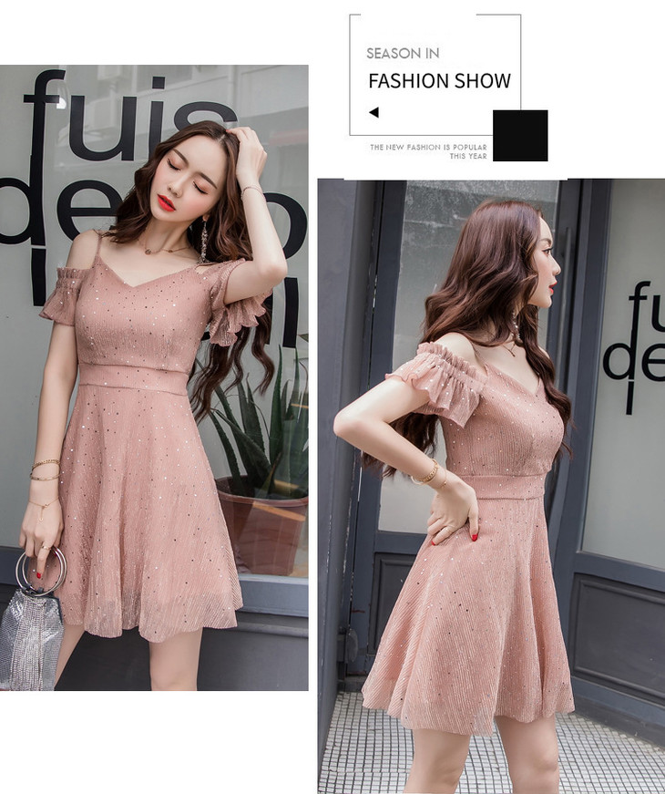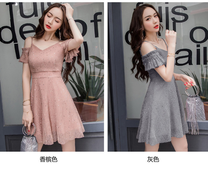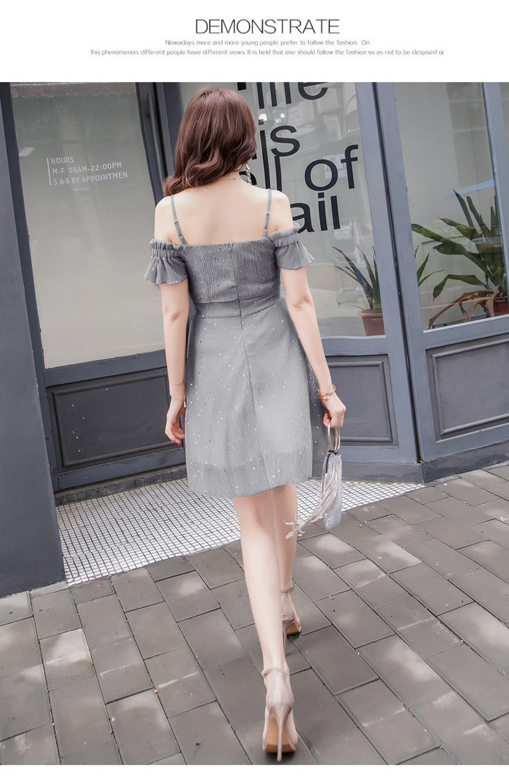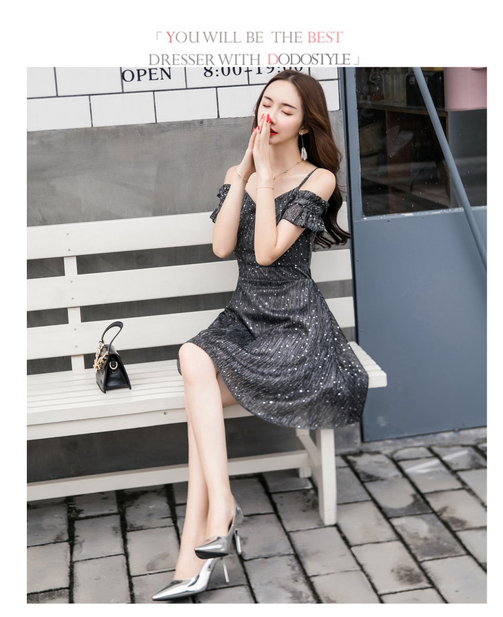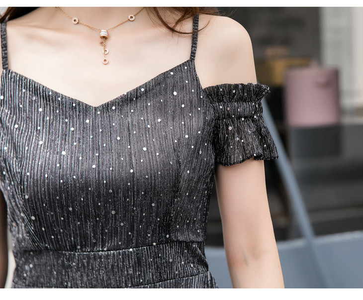 【服饰鞋包】。夏季温柔仙女裙小心机修身显瘦亮片露肩雪纺吊带连衣裙