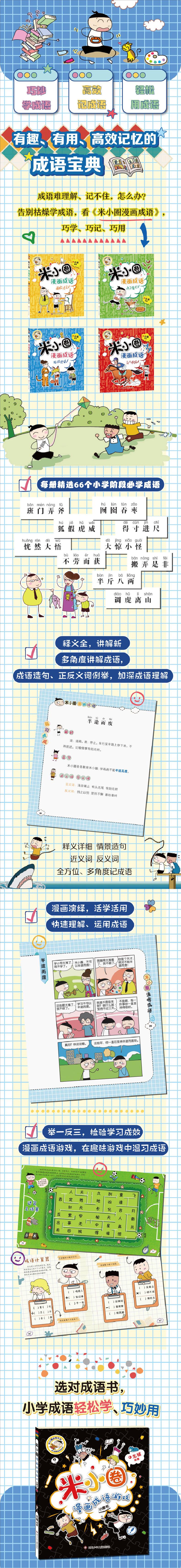 《米小圈漫画成语》(一辑)全套共有4册,分别是《狐假虎威》《画蛇添足》《鸡飞狗跳》《马不停蹄》。每册收录66个小学阶段的常用成语,全套共264个成语,每个成语都有其对应的释义、造句、近义词、反义词,帮助小读者们全方位地认识成语、理解成语,进而运用成语。搭配爆笑有趣的多格漫画来场景化演绎成语,加深记忆,增强阅读趣味性。另有《米小圈漫画成语游戏》(小黑书)1册,包含多个趣味成语游戏,以玩促学,激发兴趣。