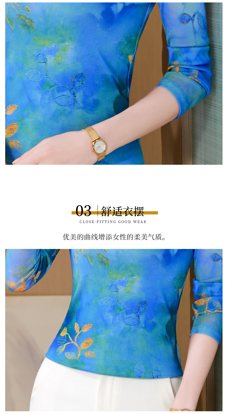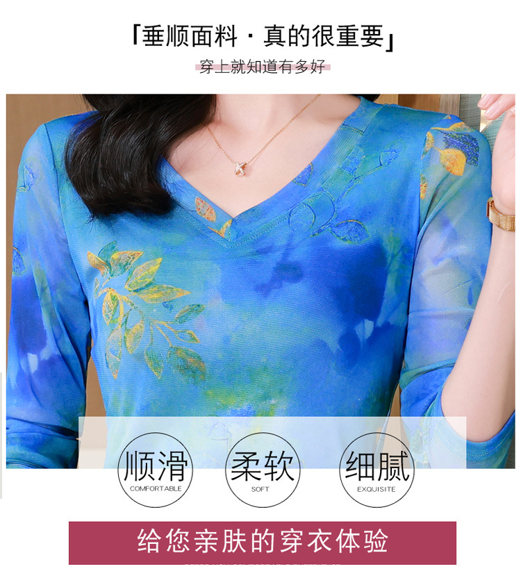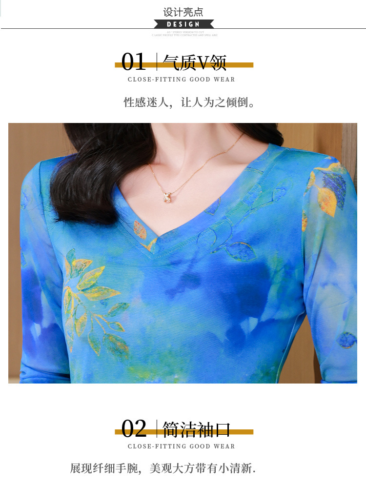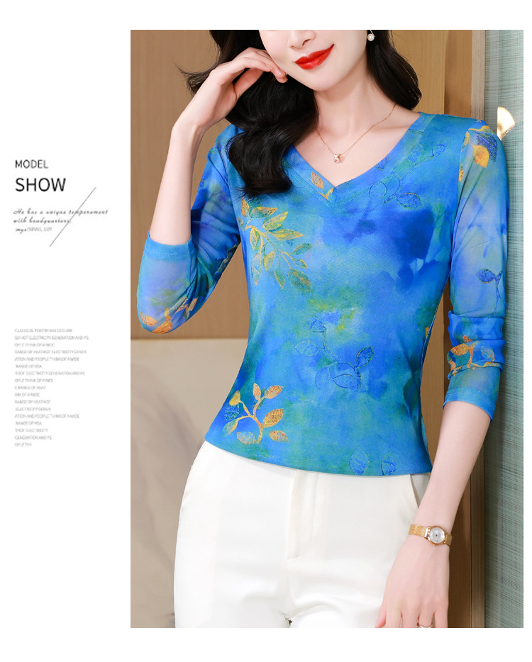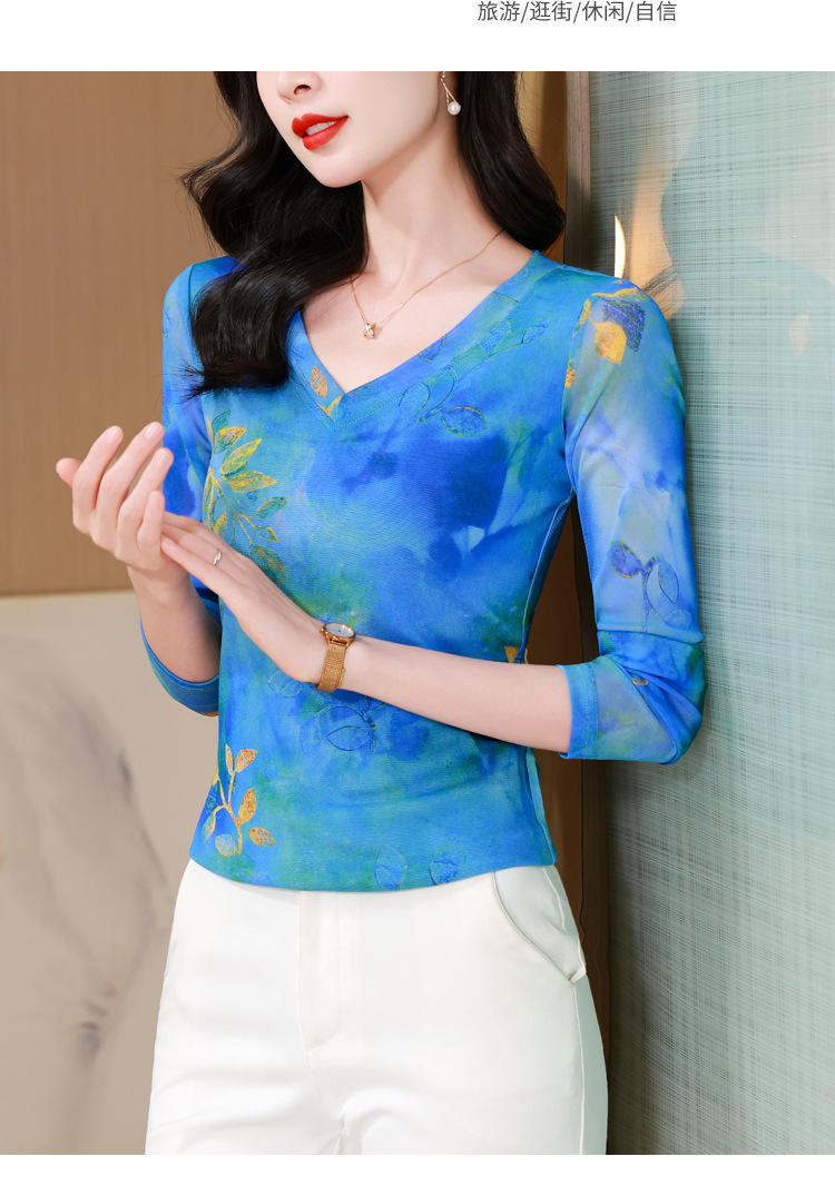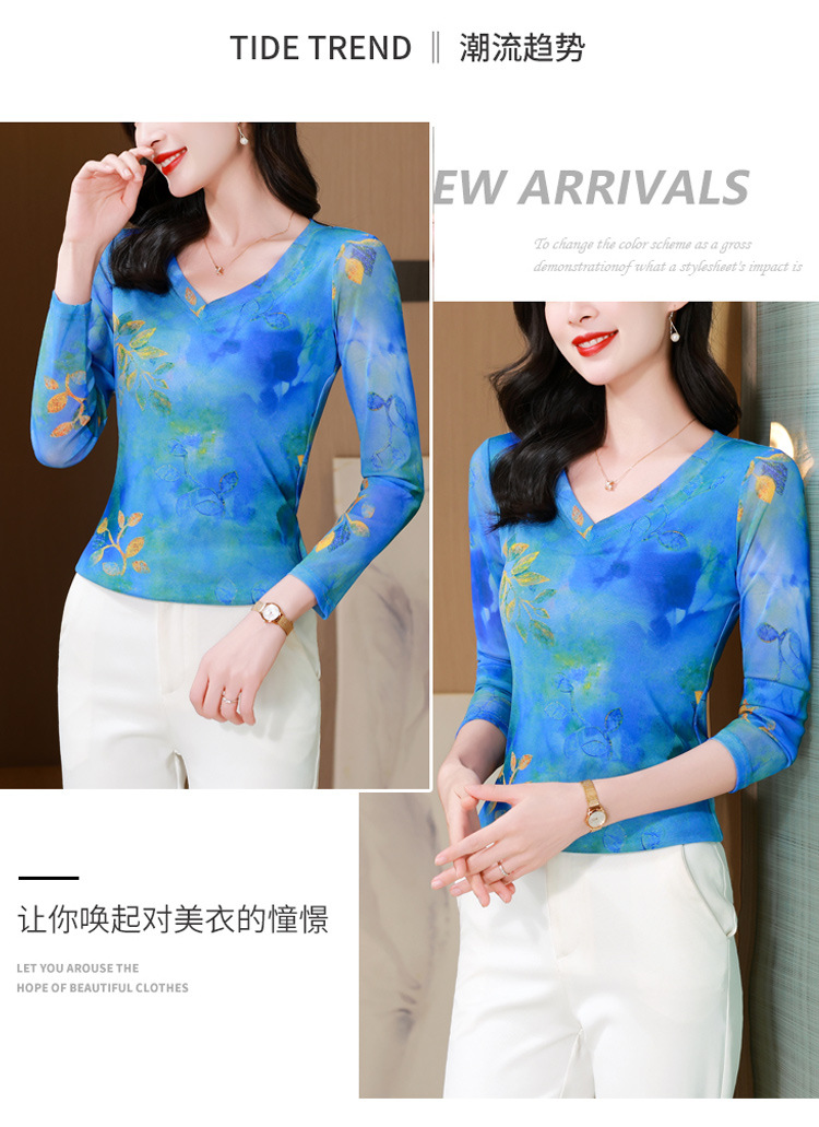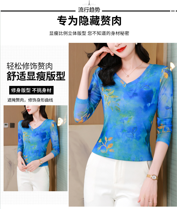 KQL 520N89171时尚纱网印花长袖V领修身显瘦洋气打底衫T恤
