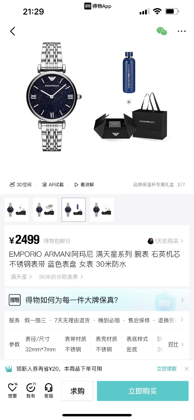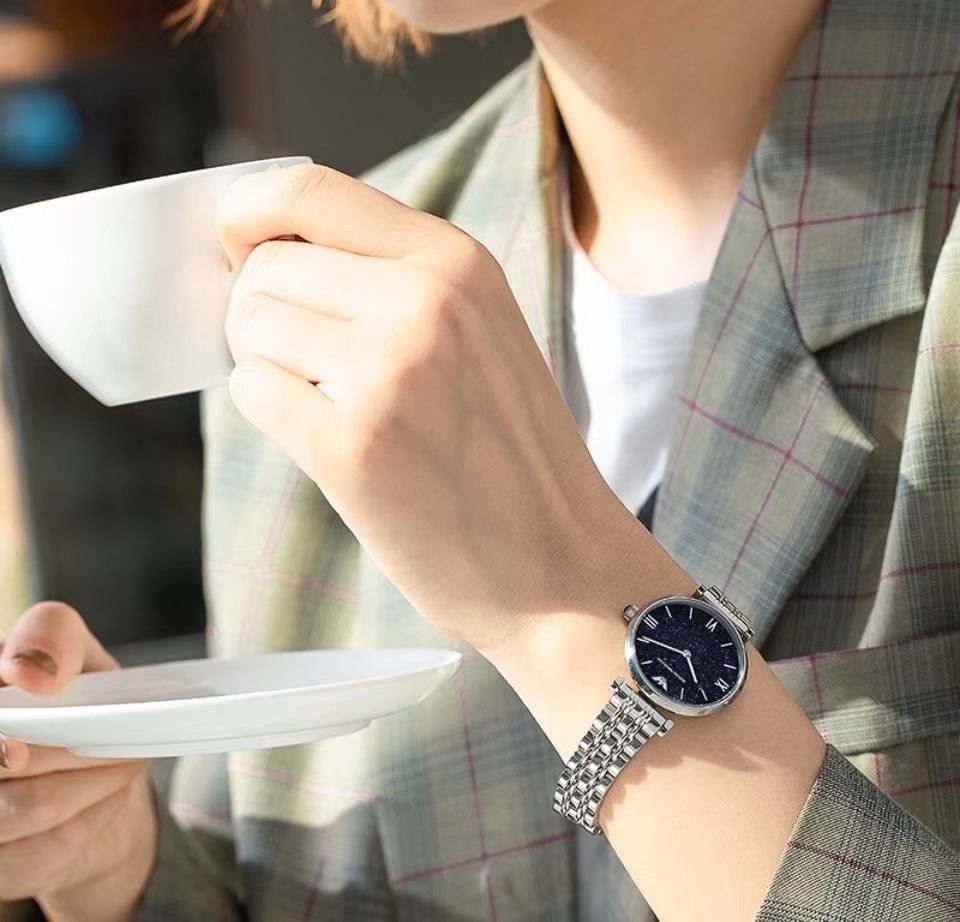 独家 天猫旗舰店包装Armani 阿玛尼满天星女士手表型号AR11091 全钢色 蓝色星空表盘 每个角度变换不同的颜色 如蓝色的夜空 星光闪闪 直径32mm 316精钢表壳 表带 凸面矿物质玻璃镜面,蝴蝶双按扣,生活防水30米