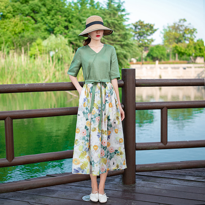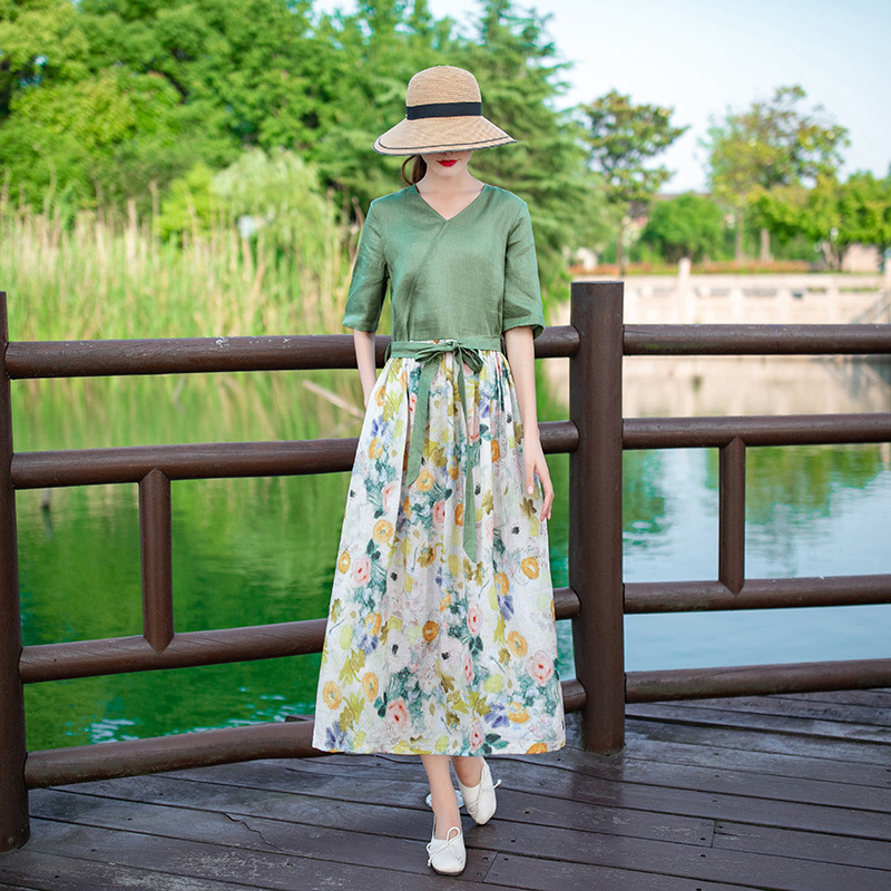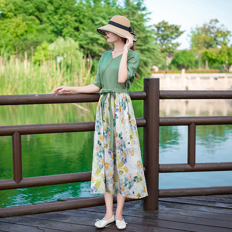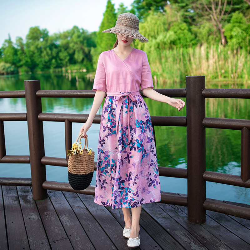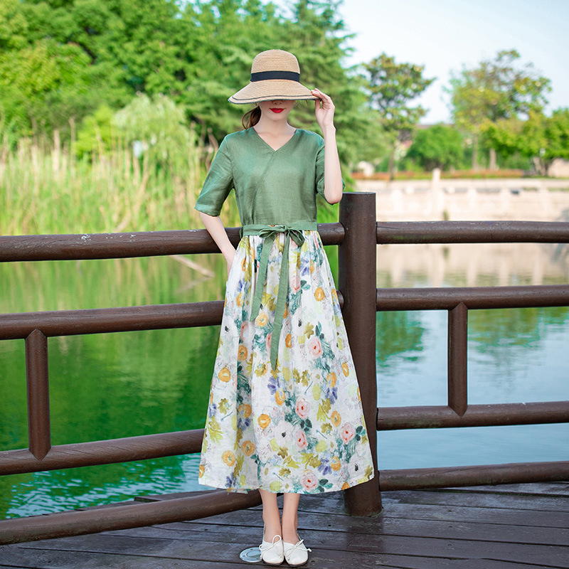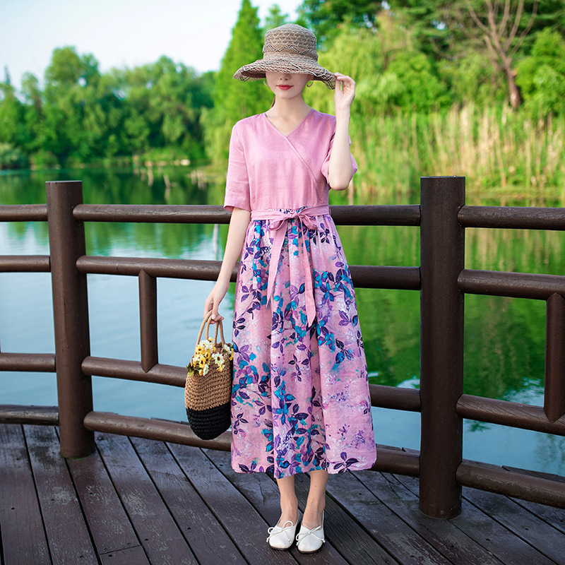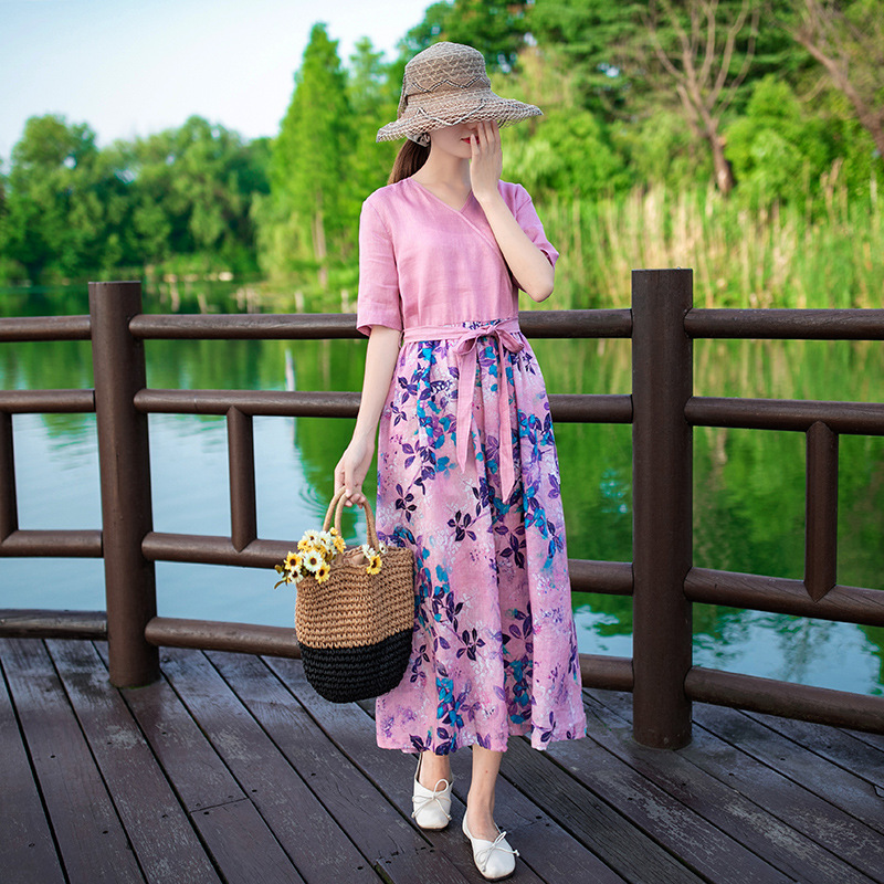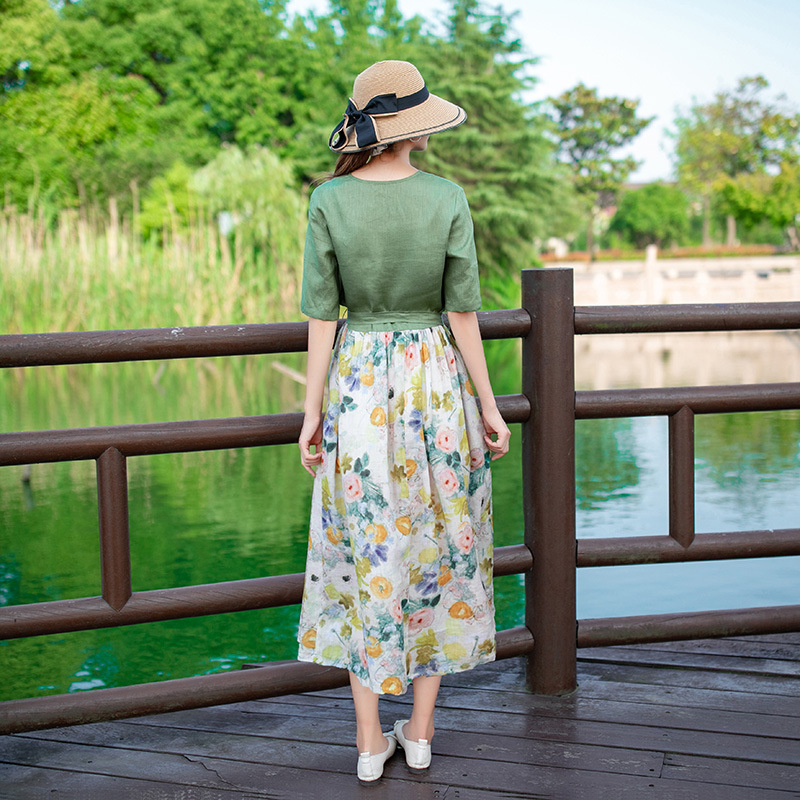 LT-068碎花亚麻 半袖清新显瘦系带天丝修身A字长裙