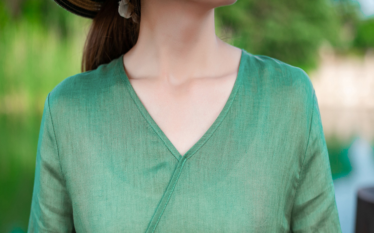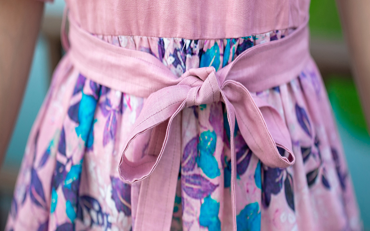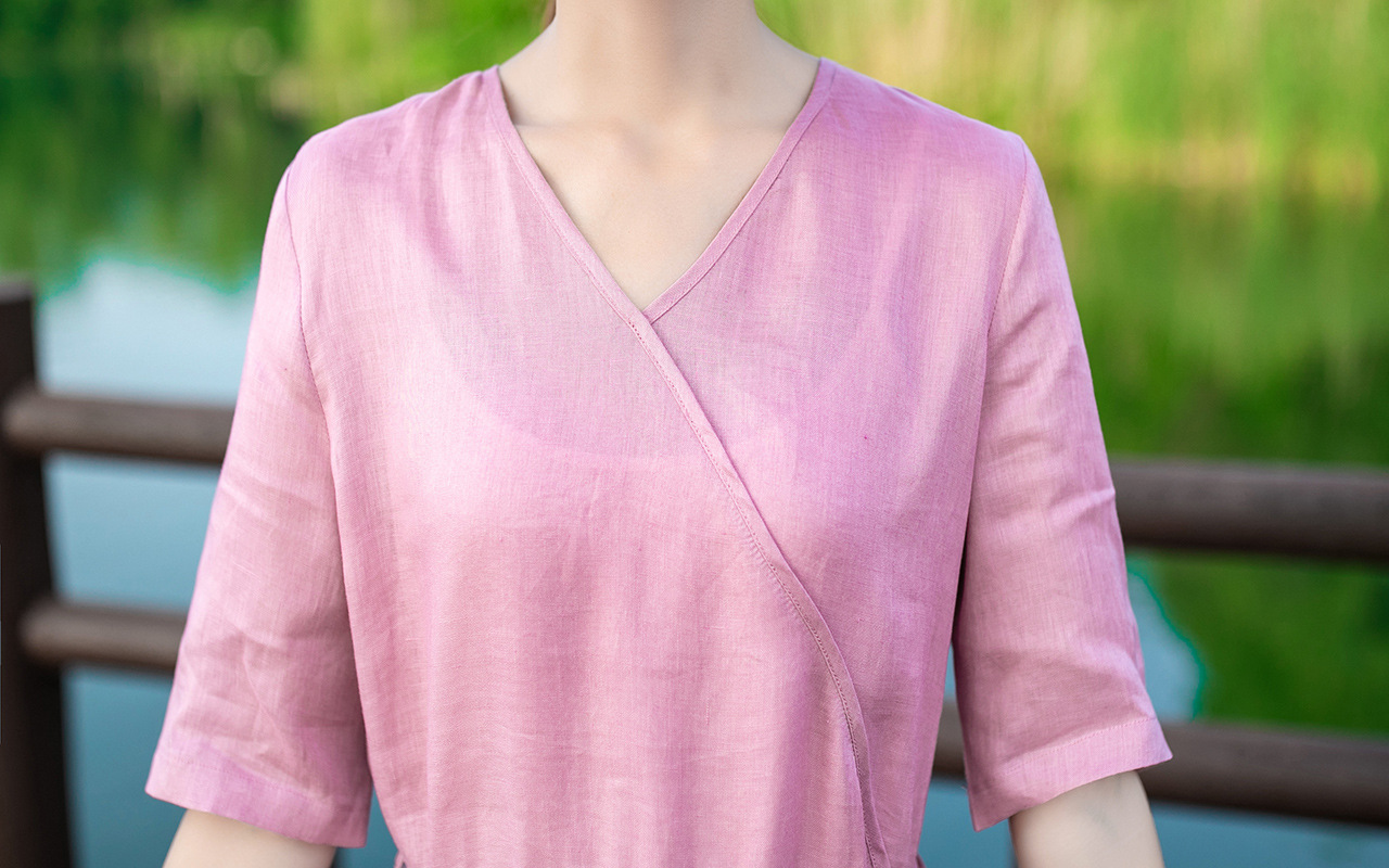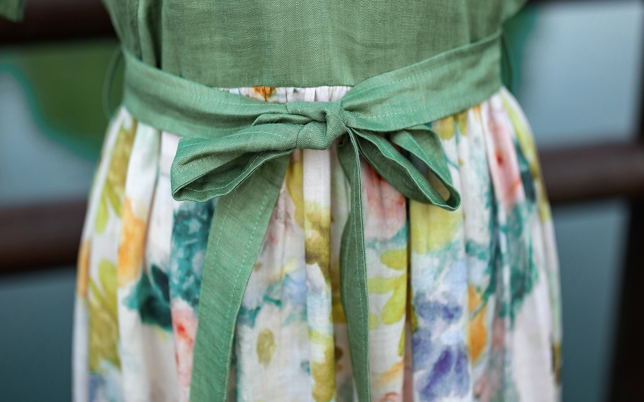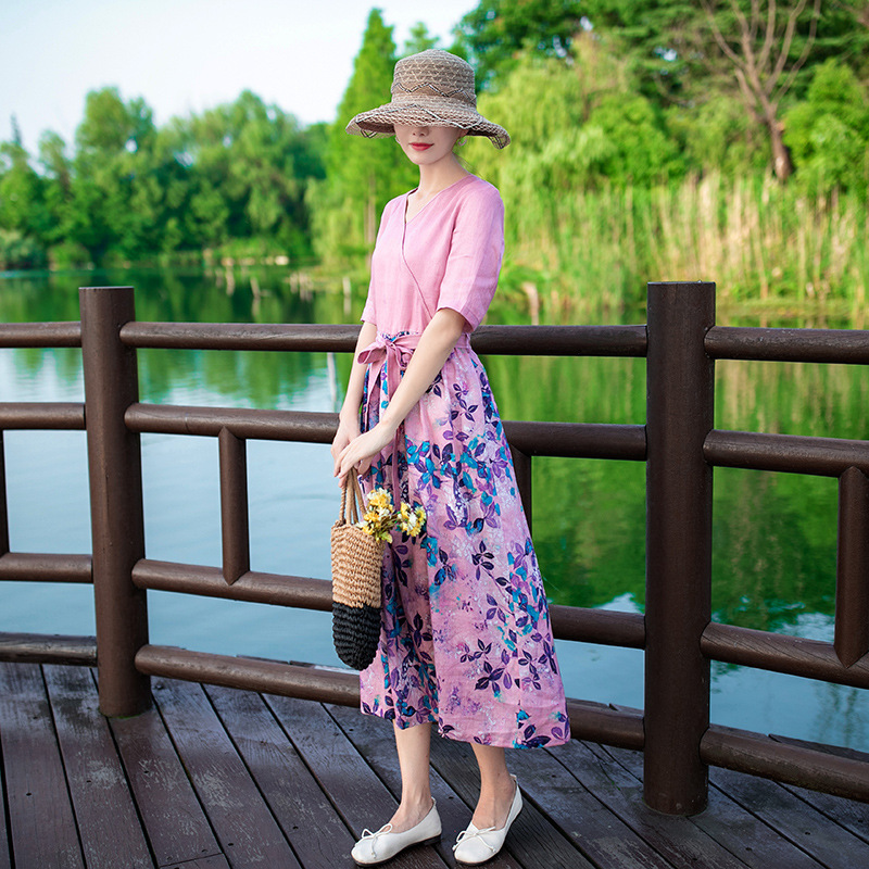 LT-068碎花亚麻 半袖清新显瘦系带天丝修身A字长裙