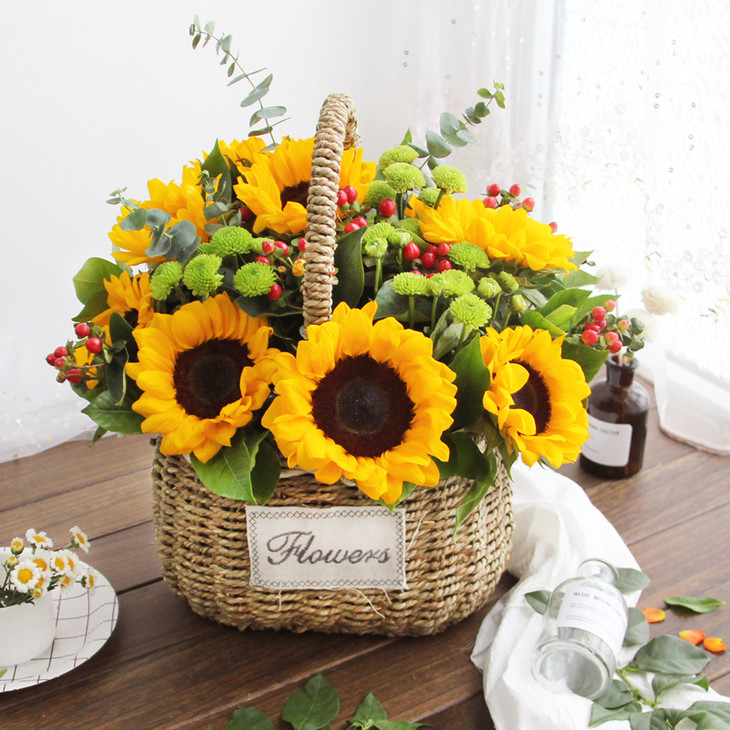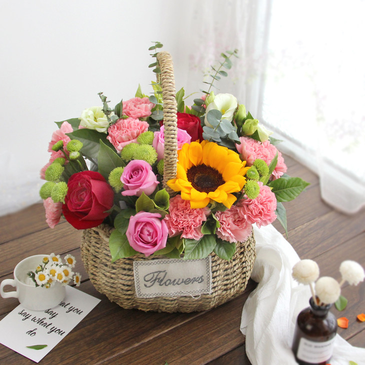 玫瑰混搭草编手提花篮-送女朋友妈妈老师母亲节生日节日祝福