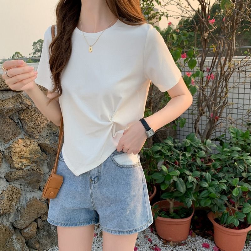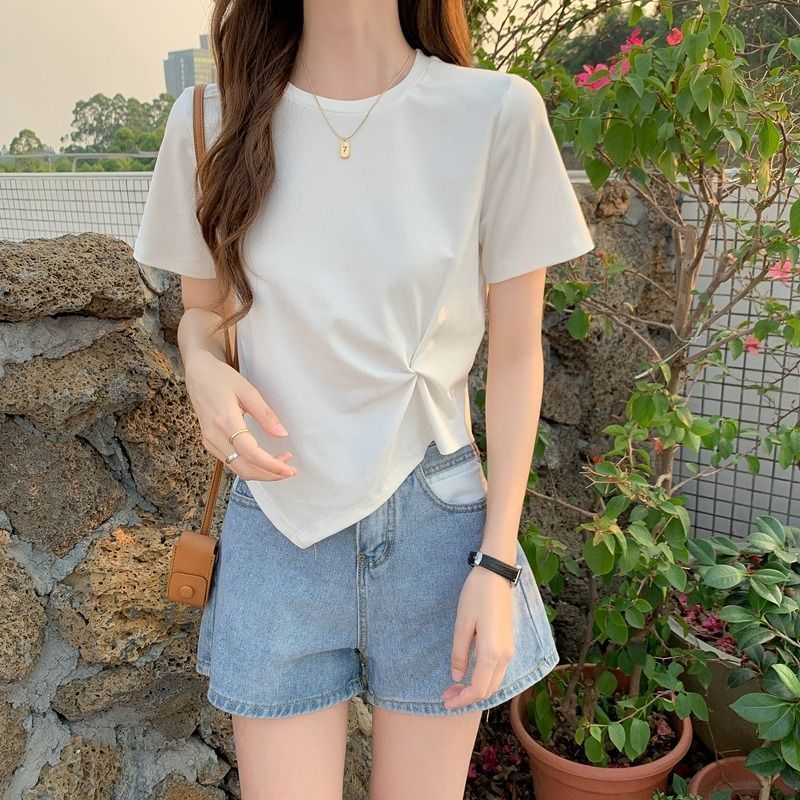【显瘦显高凸显气质❗️不规则短袖t恤女】设计感十足,高腰短款上衣,时尚又休闲,夏季常备单品,新款夏季心机设计感小众半袖高腰短款上衣