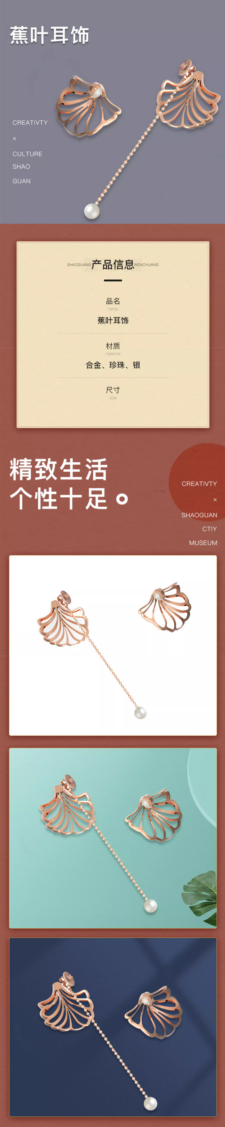 【韶关市博物馆文创】蕉叶耳饰女银高级感百搭大气珍珠耳坠简约韩镂空耳钉