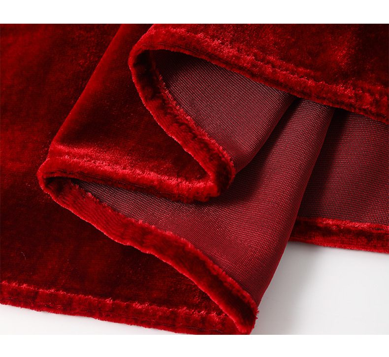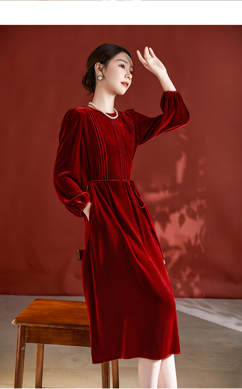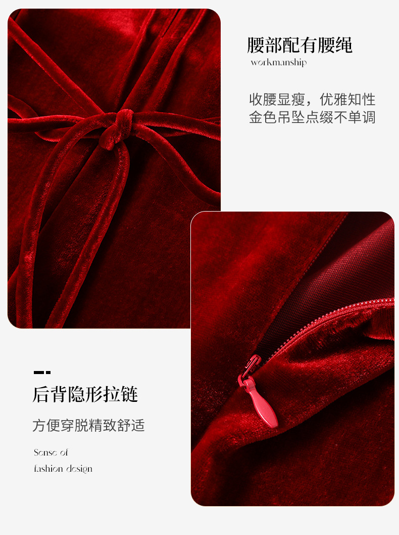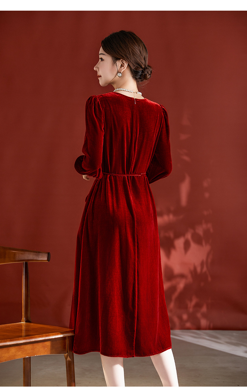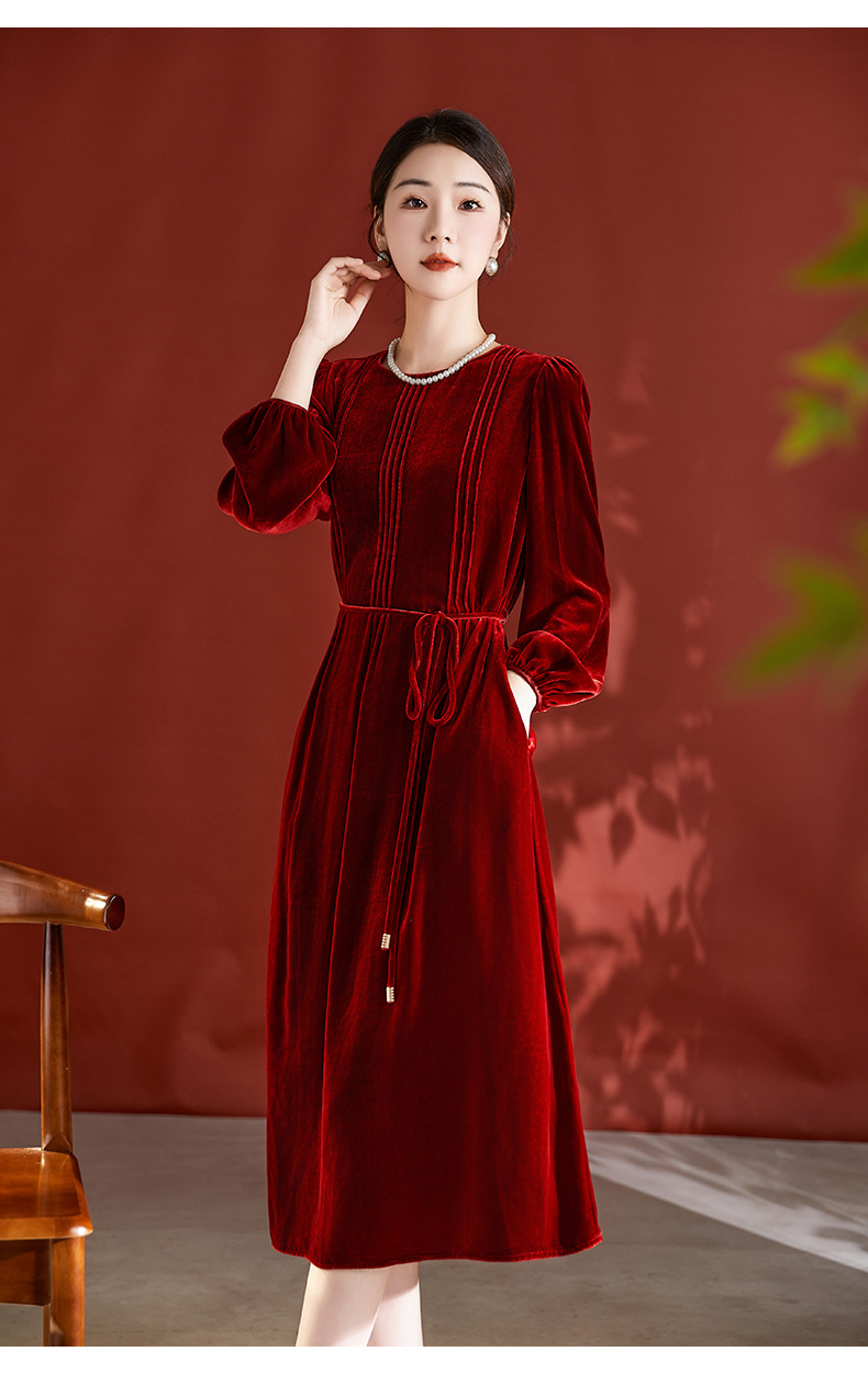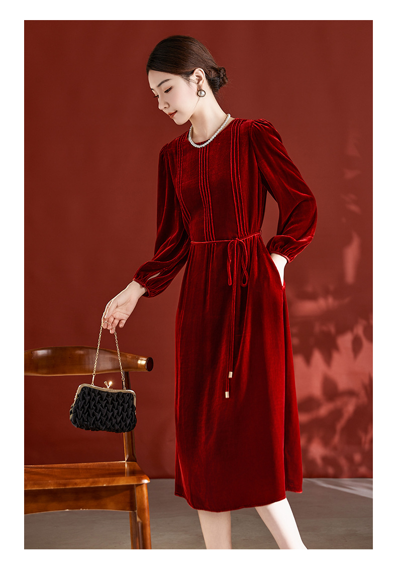 DD-真丝丝绒长袖连衣裙法式打条设计感红色新娘结婚女士妈妈收腰裙子