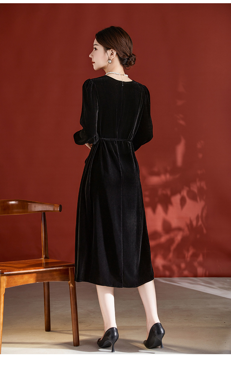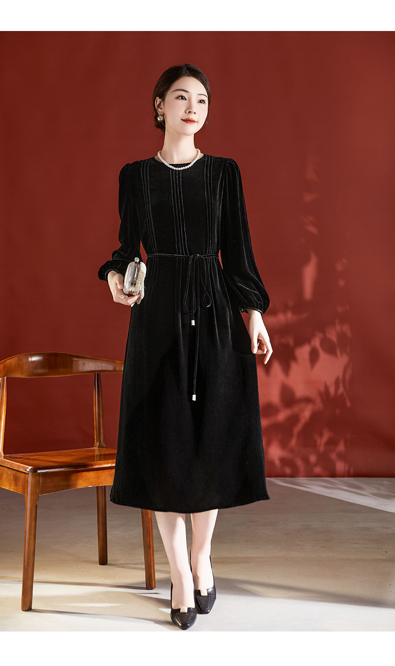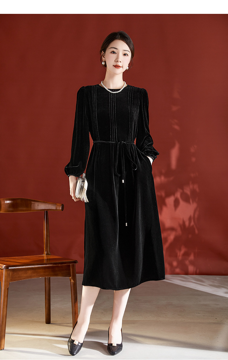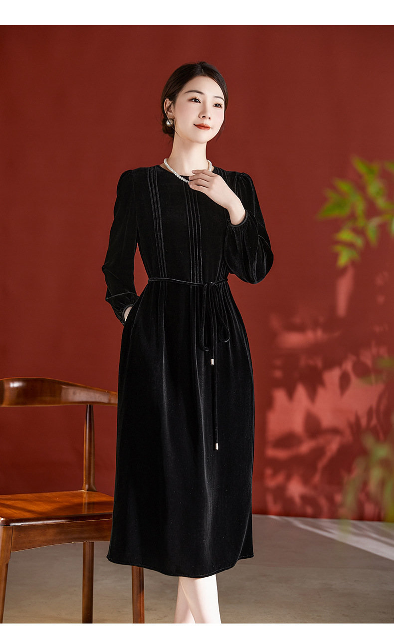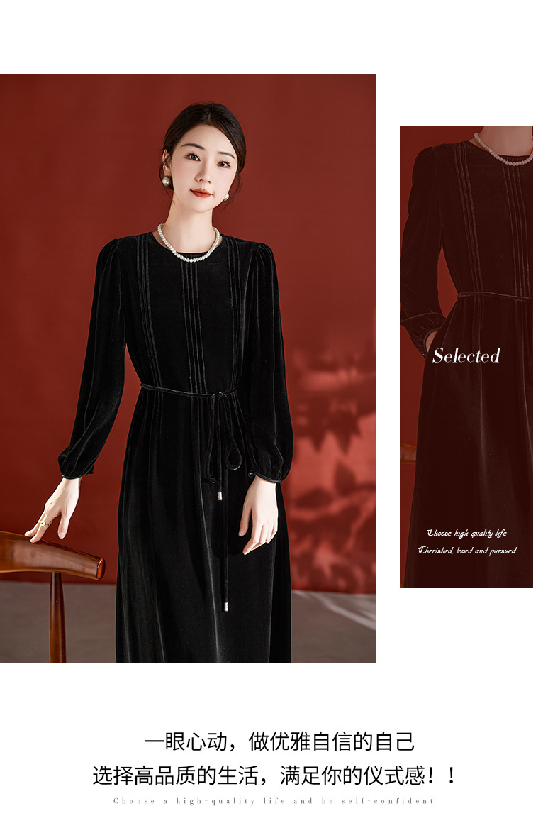DD-真丝丝绒长袖连衣裙法式打条设计感红色新娘结婚女士妈妈收腰裙子