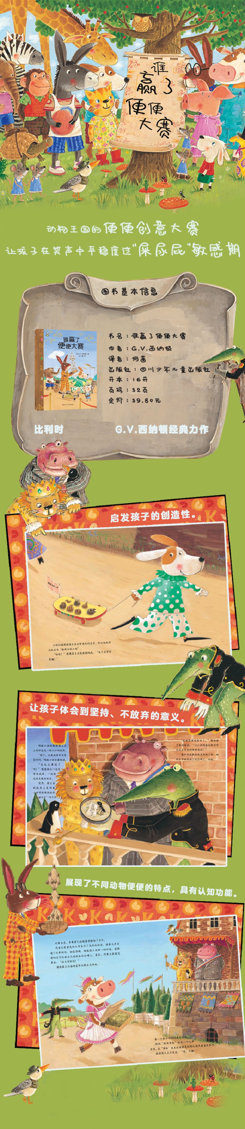 又到了动物王国举行便便大赛的时候,选手们带着自己精心制作的便便艺术品到图德国王的城堡参加比赛。牛小姐带来的是便便蛋糕,山羊兄弟带来的是便便高塔,小老鼠带来的是便便吐司面包,海鸥更是别出心裁地带来了一场现场便便表演……图德国王对大家的创作非常满意,当他正准备宣布获胜名单时,蚂蚁小姐也申请参加比赛。蚂蚁小姐的作品是什么呢?最后谁获得了冠军? 这是一个风趣幽默,令人捧腹的故事,而且在微笑背后还蕴藏着深意。