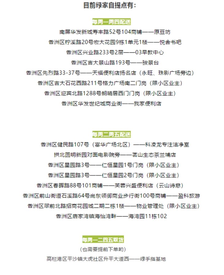 选择到指定地点自提产品,免配送费。配送员把产品送至自提点后会给您发送短信,收到短信后尽快到自提点领取属于自己的新鲜食材。