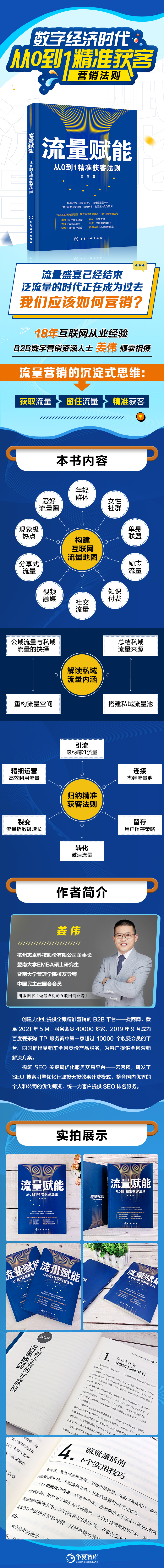 那么如何抓住机遇从新增到留存,从人群画像到承载,从引流到裂变,zui终形成强大的私域流量池,从而吸金成功,就是每个企业迫切需要解决的问题。《流量赋能—从0到1精准获客法则》一书的可贵之处在于,它没有眼花缭乱的套路,也没有浮夸的“鸡血”和“鸡汤”,作者直面流量盛宴结束的残酷现实,用非常接地气的笔触,写出了关于“流量”和“留量”的实在干货,确实是一本值得一看的好书。期待这本书能解惑以上种种,从而激励更多的读者乘风破浪,在新的互联网时代创造辉煌。